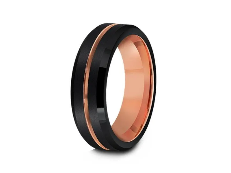 Our rose gold plated rings are available with a variety of contrast colors and brushed styles such as blue, gray gunmetal or black in 4 mm, 6mm and 8mm wide, perfect for couples who want to celebrate love in matching wedding sets.