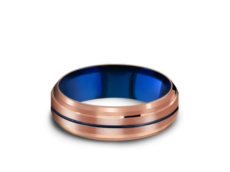 Our rose gold plated rings are available with a variety of contrast colors and brushed styles such as blue, gray gunmetal or black in 4 mm, 6mm and 8mm wide, perfect for couples who want to celebrate love in matching wedding sets.