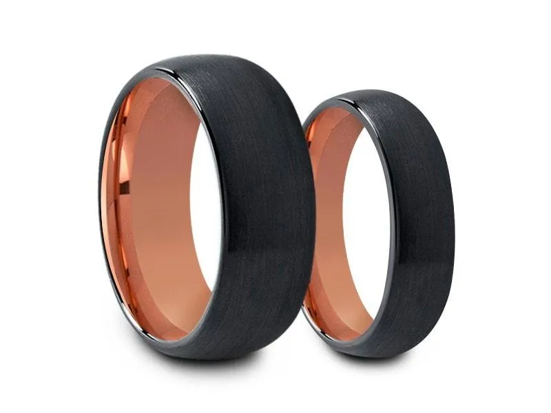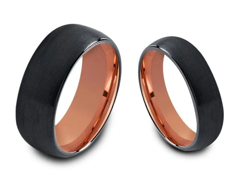 Our rose gold plated rings are available with a variety of contrast colors and brushed styles such as blue, gray gunmetal or black in 4 mm, 6mm and 8mm wide, perfect for couples who want to celebrate love in matching wedding sets.