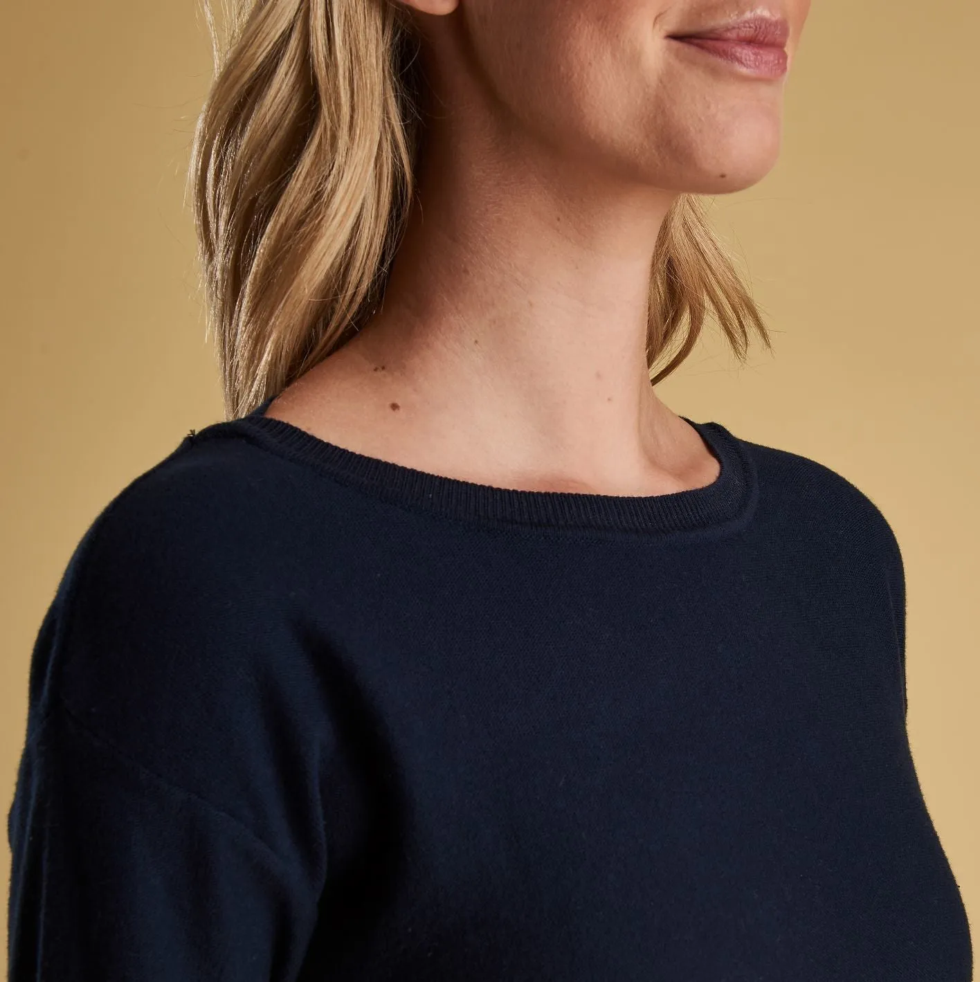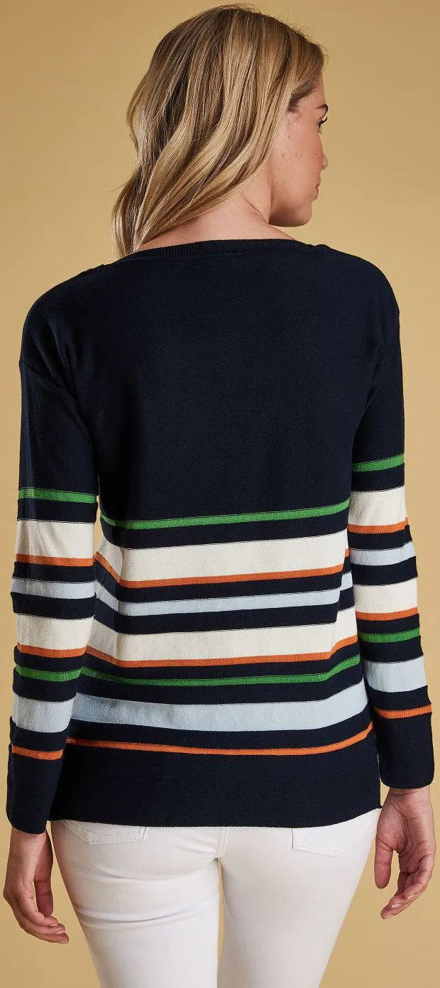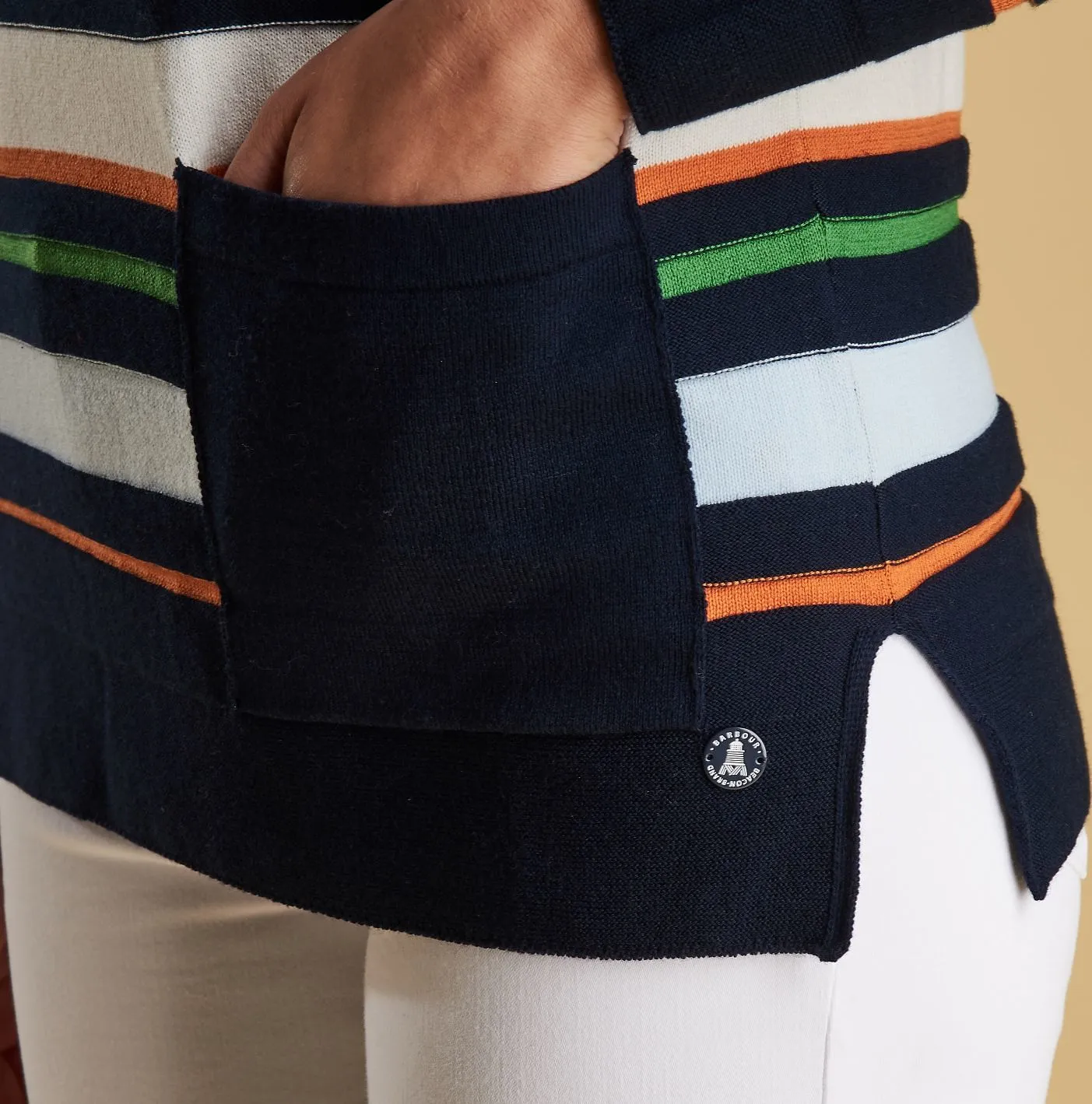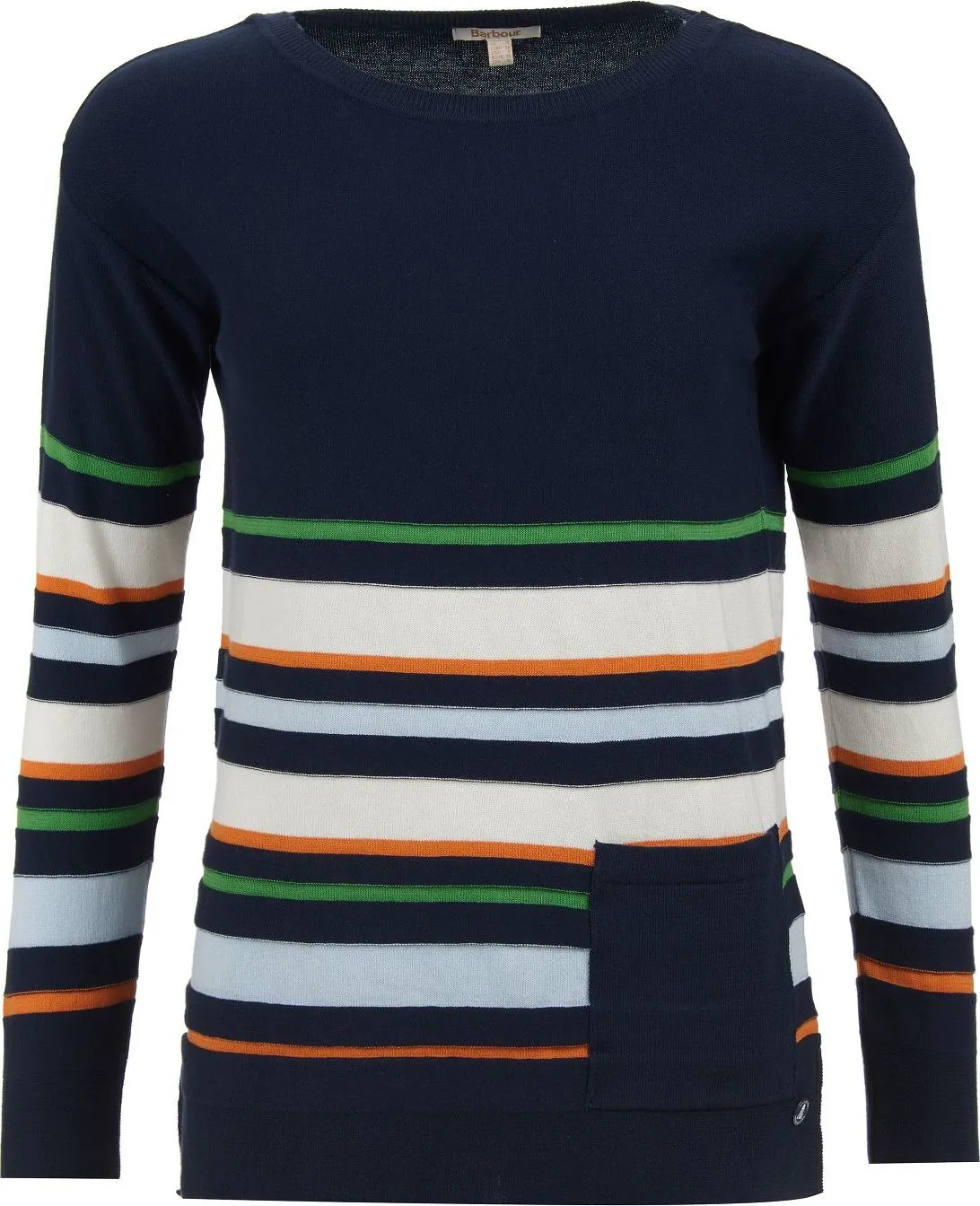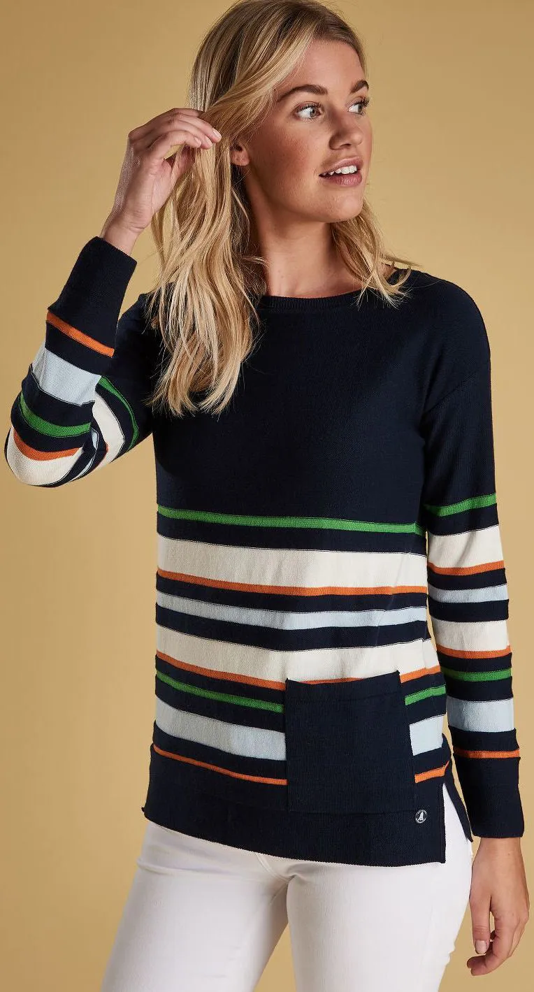 The women’s Barbour APPLECROSS KNITTED Sweater features multi-coloured lower body stripes and pure cotton construction, making it perfect for seasonal seaside outings. Barbour outfitted this sweater with a flattering boat neckline and open side vents to enhance your mobility. A single lower front pocket and a Barbour Beacon badge give it a nautical twist.