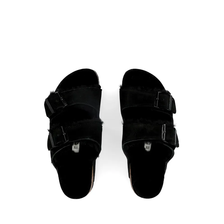 The ARIZONA SHEARLING NARROW is a women's sandal featuring a two-strap upper that can be adjusted using the sturdy buckles, a traction patterned sole, and the classic BIRKENSTOCK cork latex footbed that will support your feet, with the anatomically moulded design guiding them into a natural position. The ARIZONA SHEARLING features a sheepskin lining to keep your feet extra comfortable and cosy.