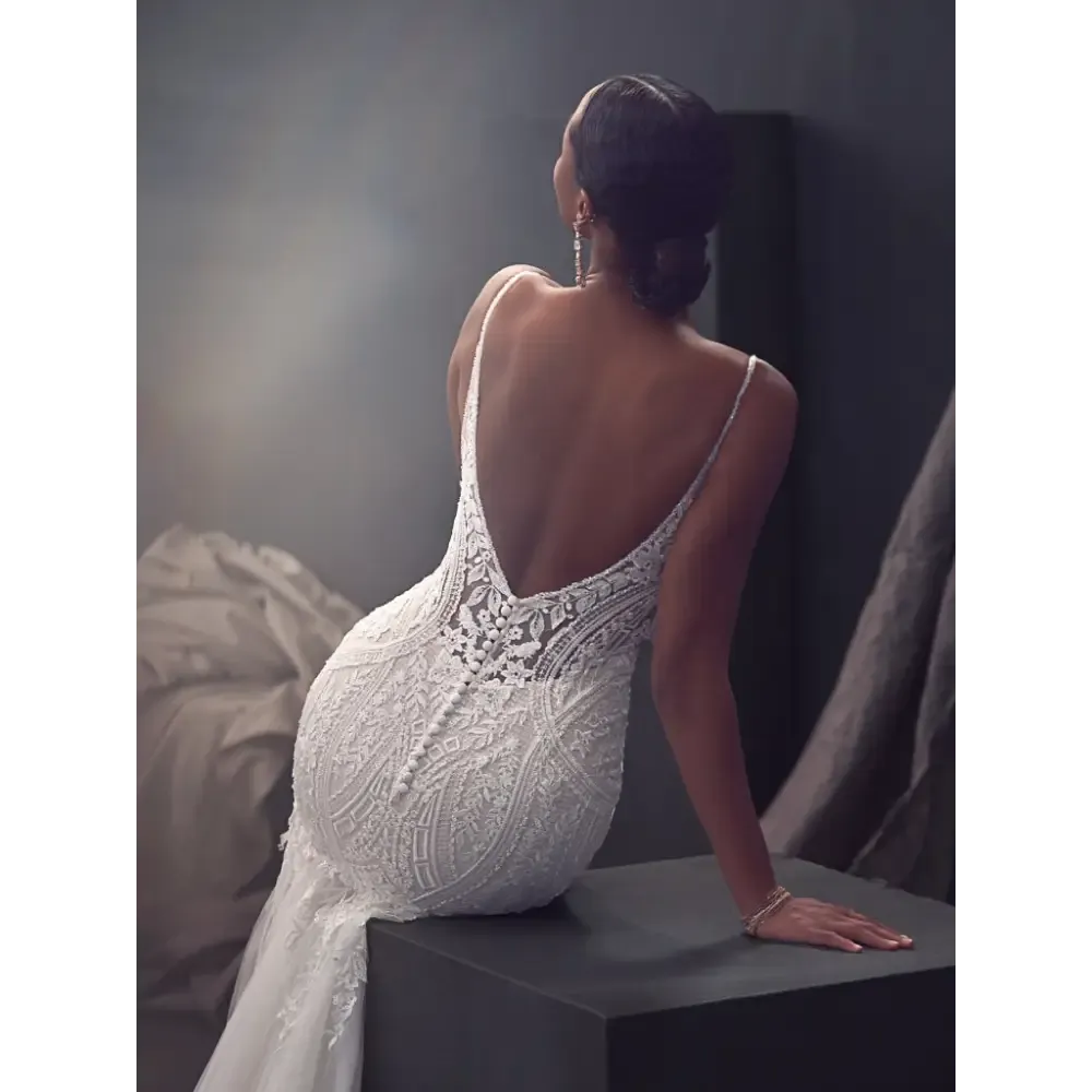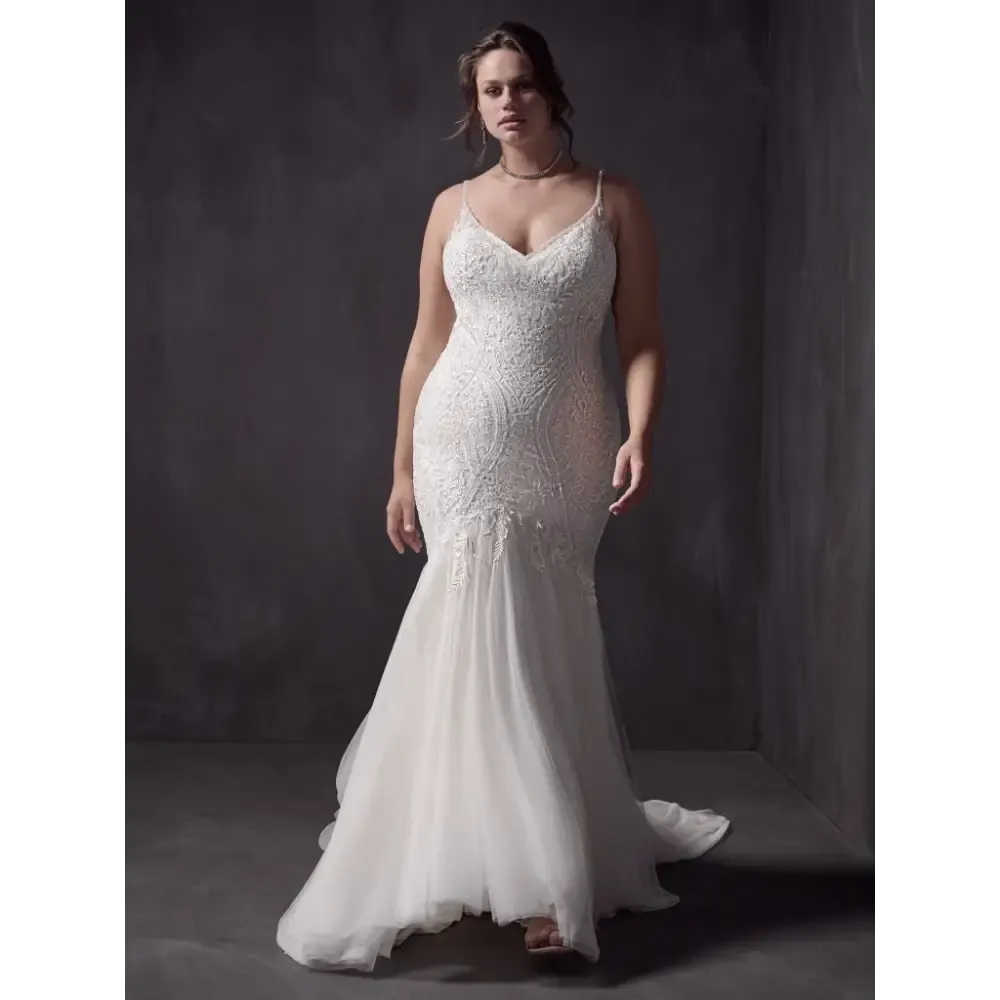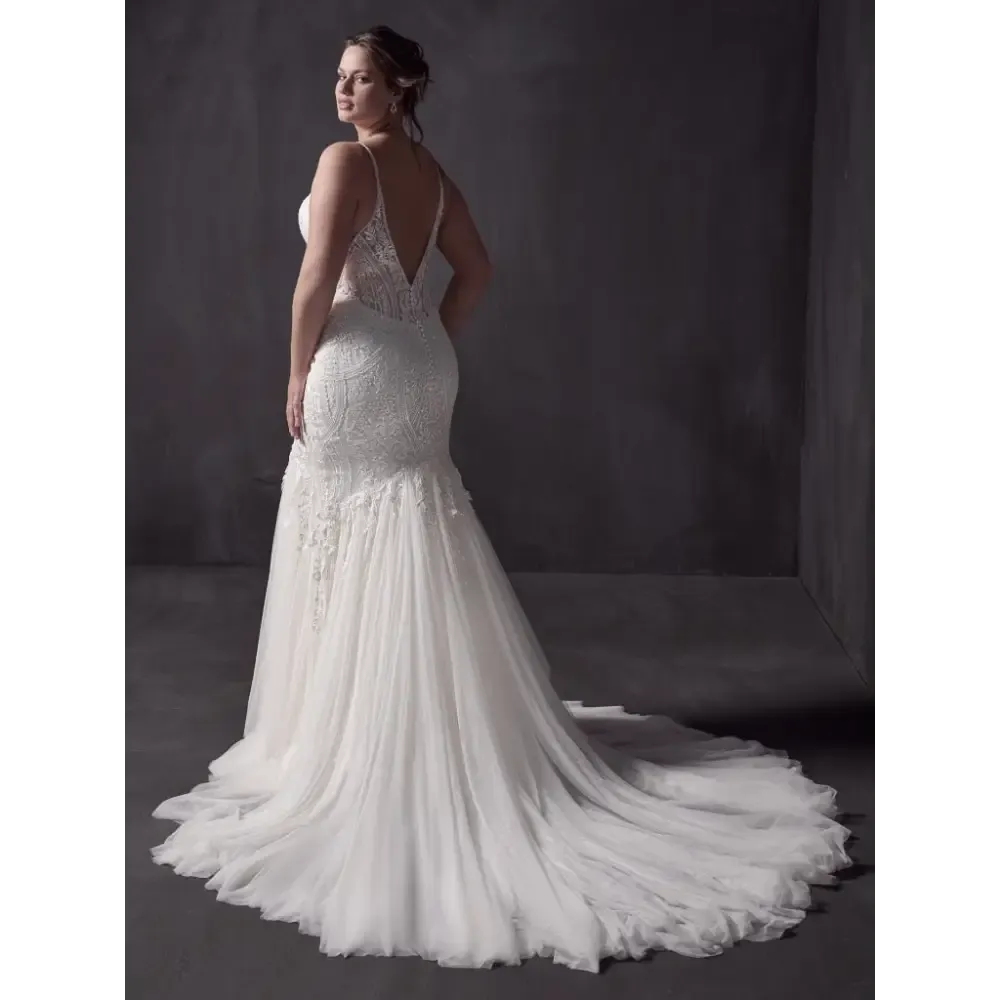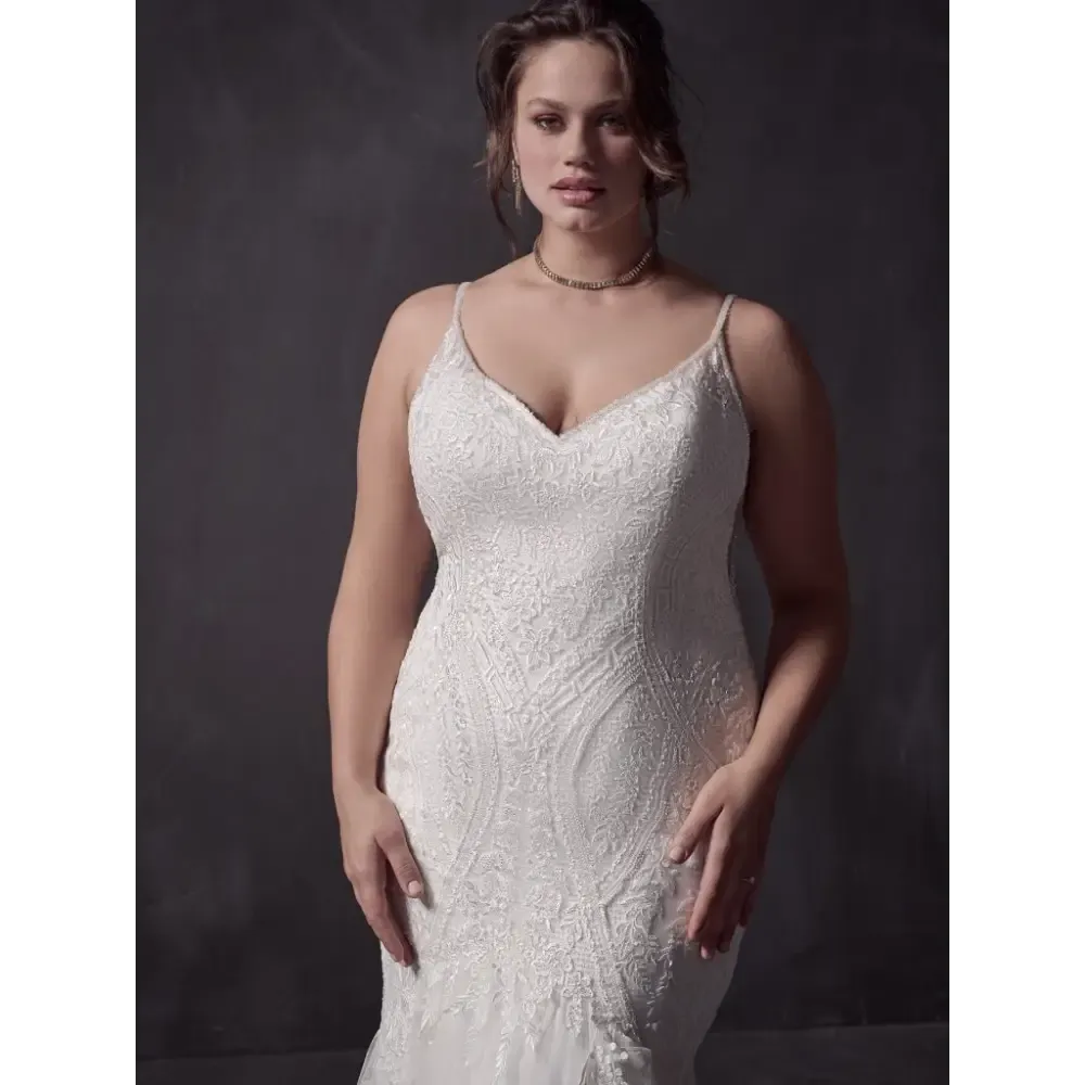 Available with fully lace skirt and plunge illusion neckline and unlined bodice (Bailey)