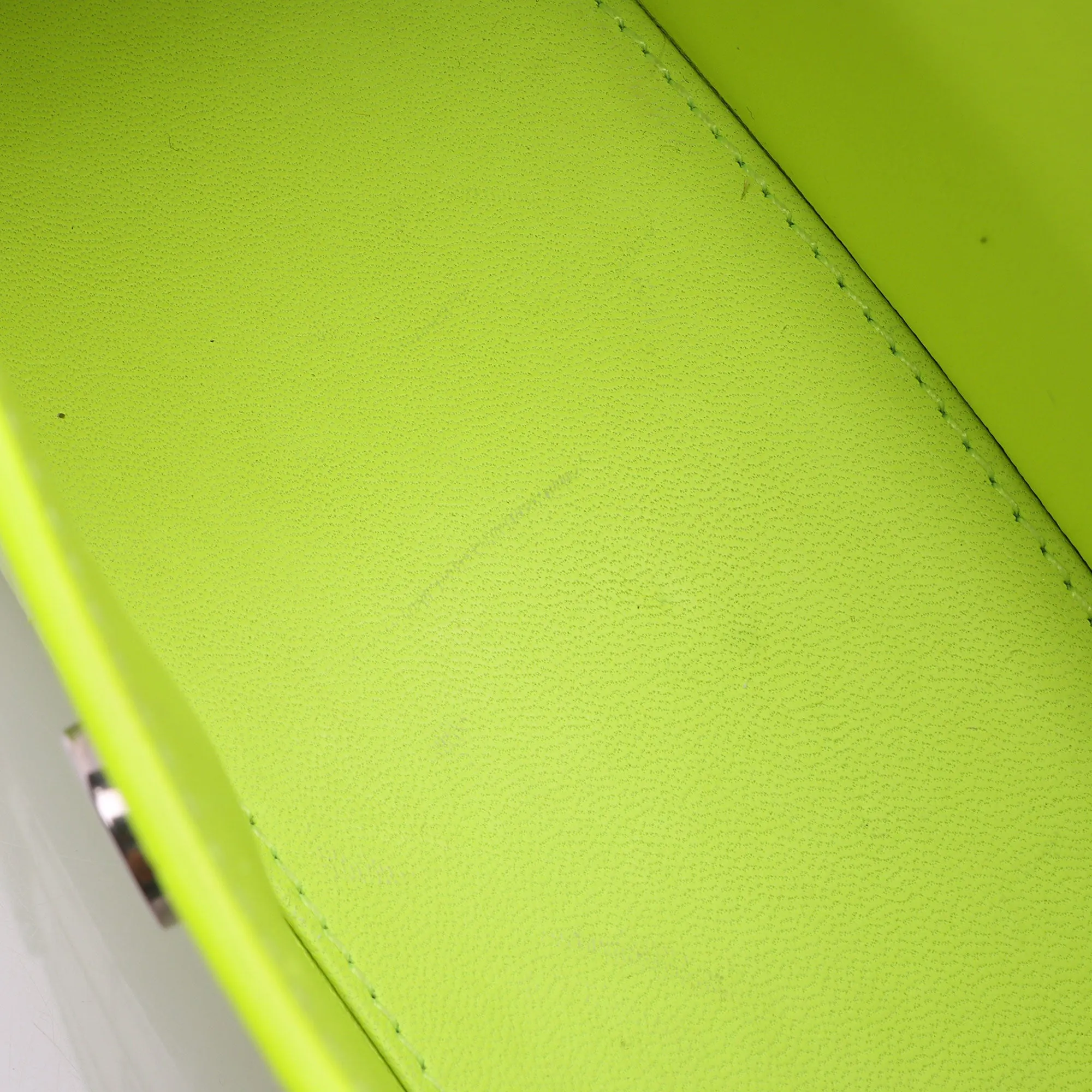 Condition Notes: Discoloration and darkening throughout exterior, handle, and shoulder strap. Darkening and marks throughout exterior casing. Light surface scratches to hardware. Visible scuffs and marks throughout interior.