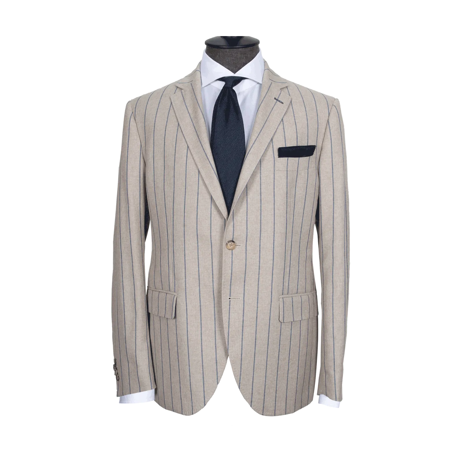 Beige and blue chalk pinstripe suit tailored from luxurious wool, cotton, and silk fabric. It is constructed as a single-breasted jacket paired with slim fit, flat front trousers. Features a light, clean construction with a modern relaxed fit. Detailed with boxing athlete printed lining, a takeaway from the love of the sport. The beige and blue chalk pinstripe suit is a versatile piece for various settings - the real estate auction block, office or the leisure cocktail soiree.
