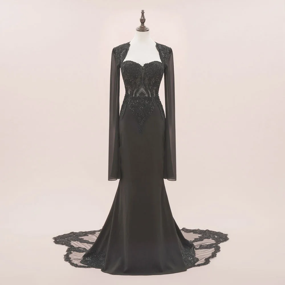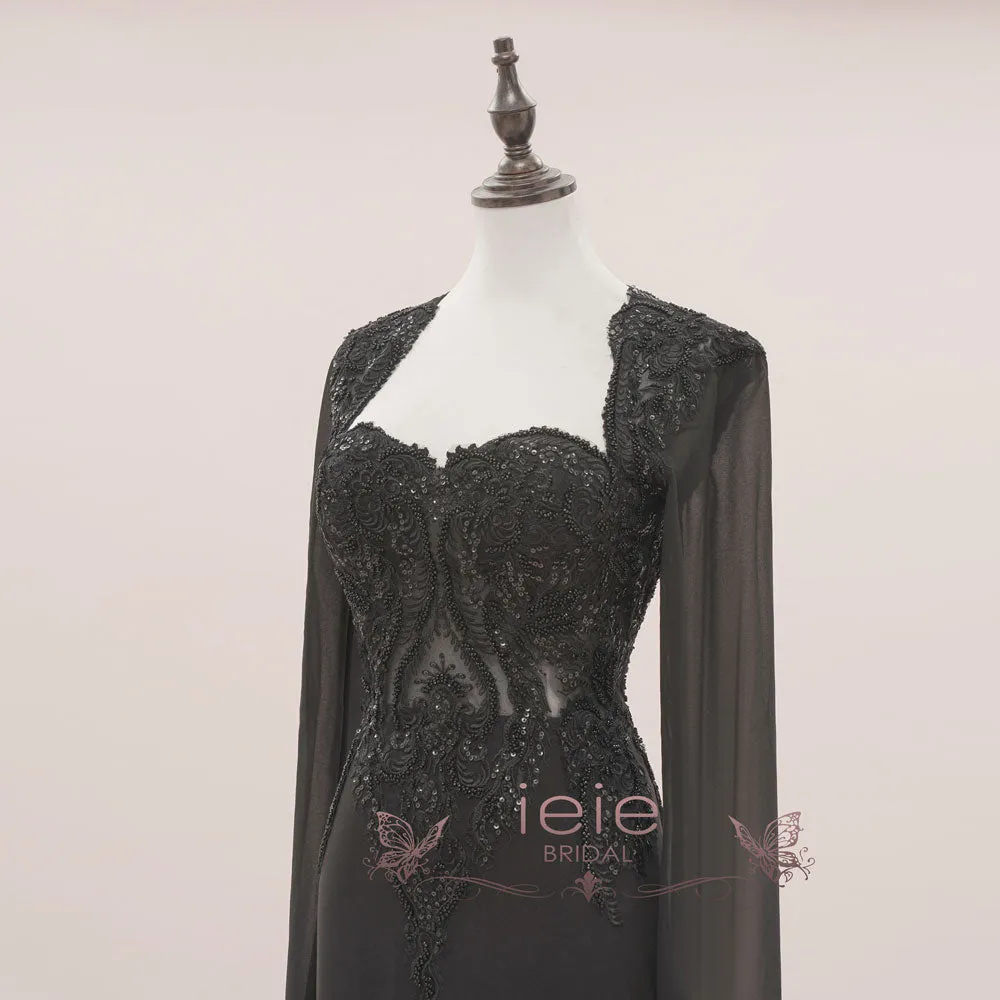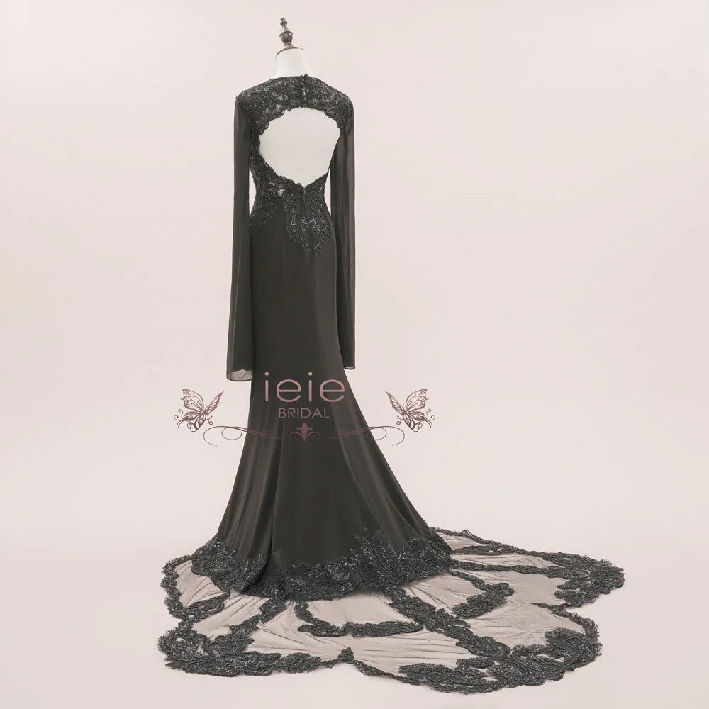 You'll love this Morticia style black lace wedding dress, featuring stunning chiffon split sleeves in a fitted silhouette, finished with a statement lace train. This elegant Gothic style dress will be perfect for your Halloween wedding!