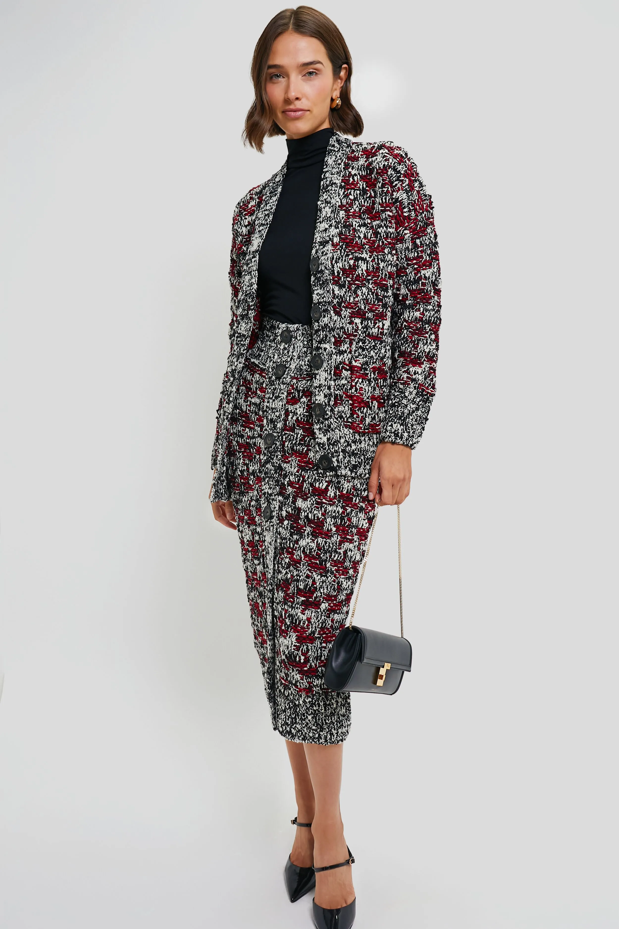 Classic meets modern in the Black White and Plum Pencil Midi Skirt. This chunky-knit skirt is spun from pure merino wool in a houndstooth pattern. It combines hues of black, white, and red to create a boucle effect inspired by mid-century three-piece suits. We are styling this with a black tank, the matching Black White and Plum Oversized Cardigan, and heels for an absolutely chic ensemble.