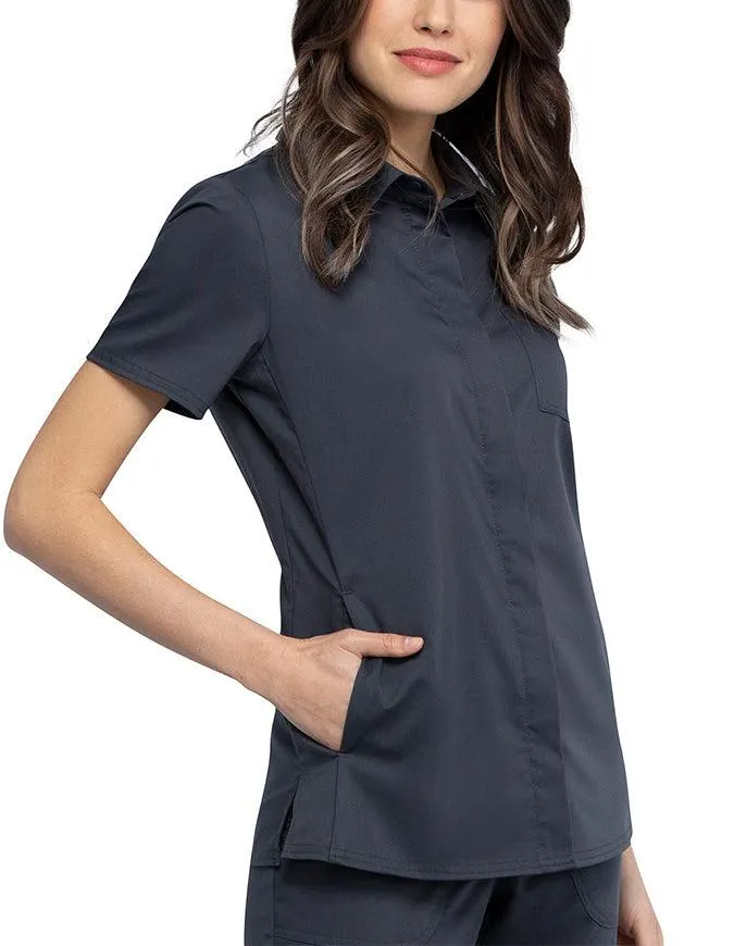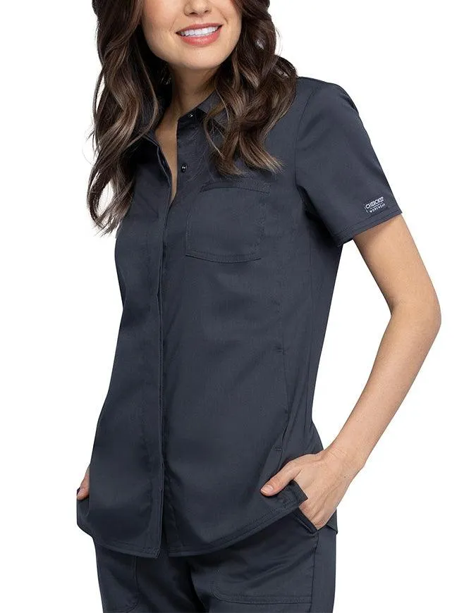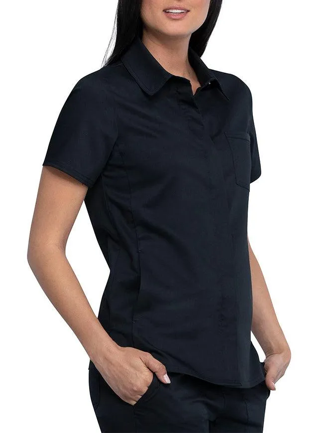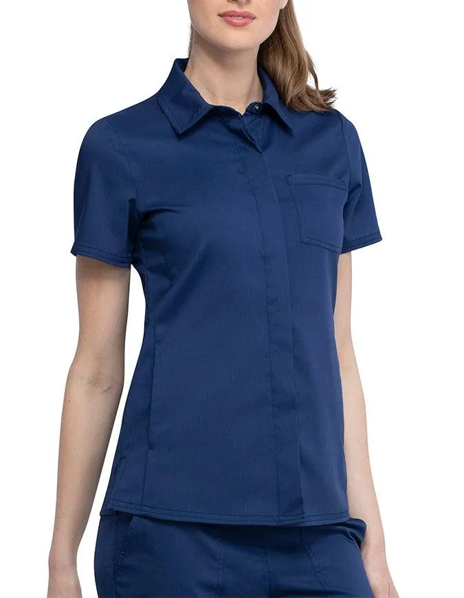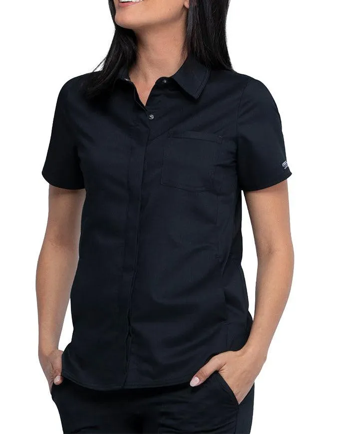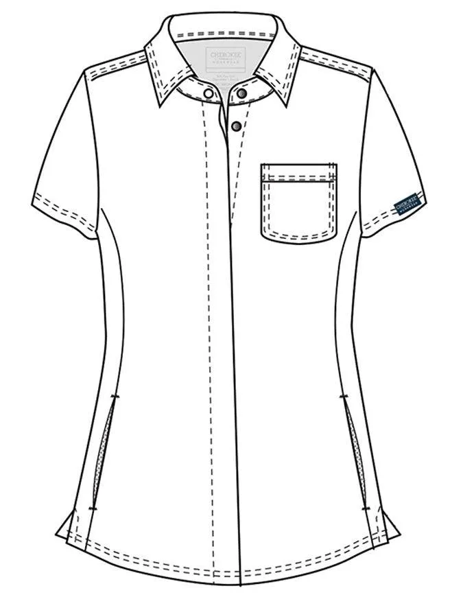 Features of Cherokee Workwear Revolution Women's Hidden Snap Front Collar Shirt: