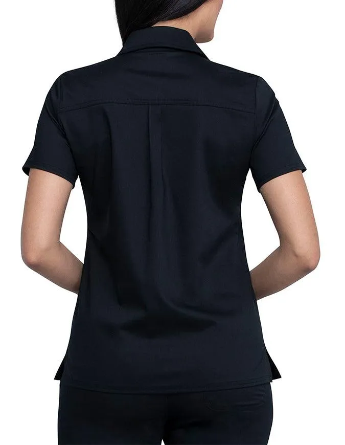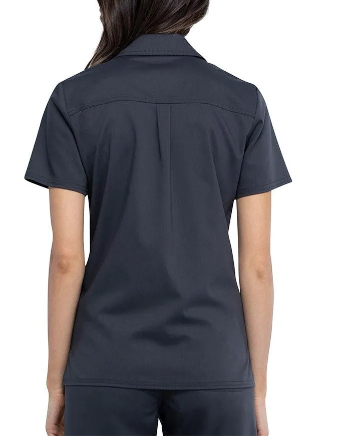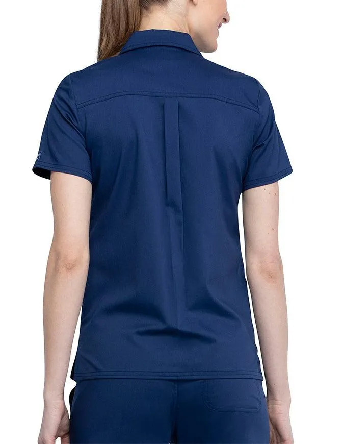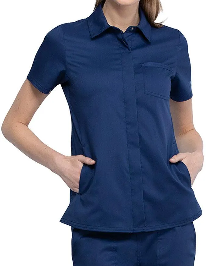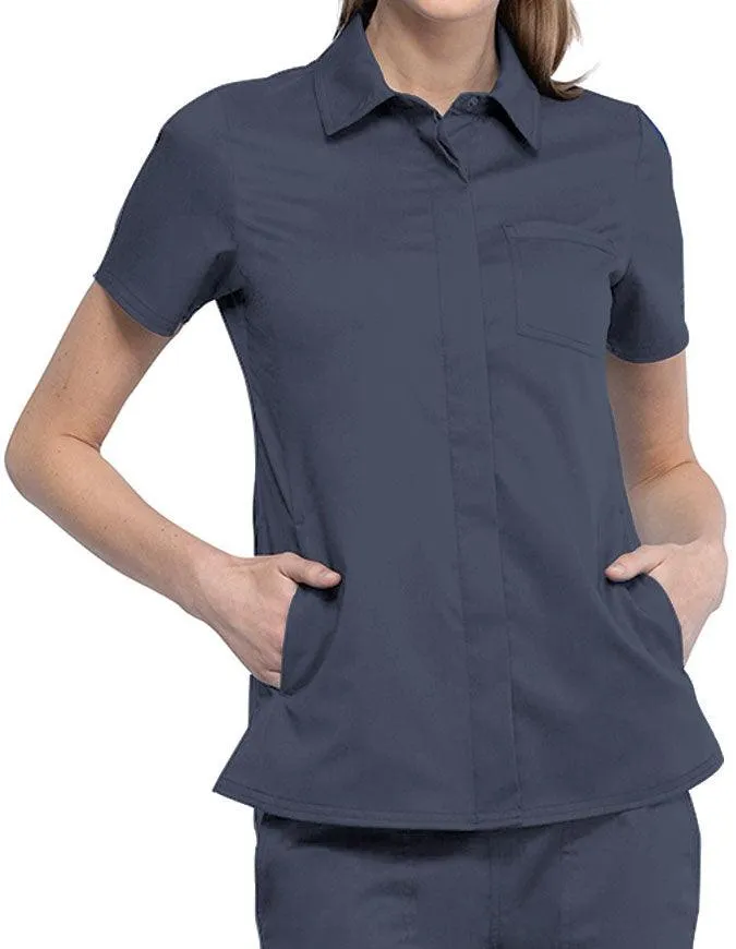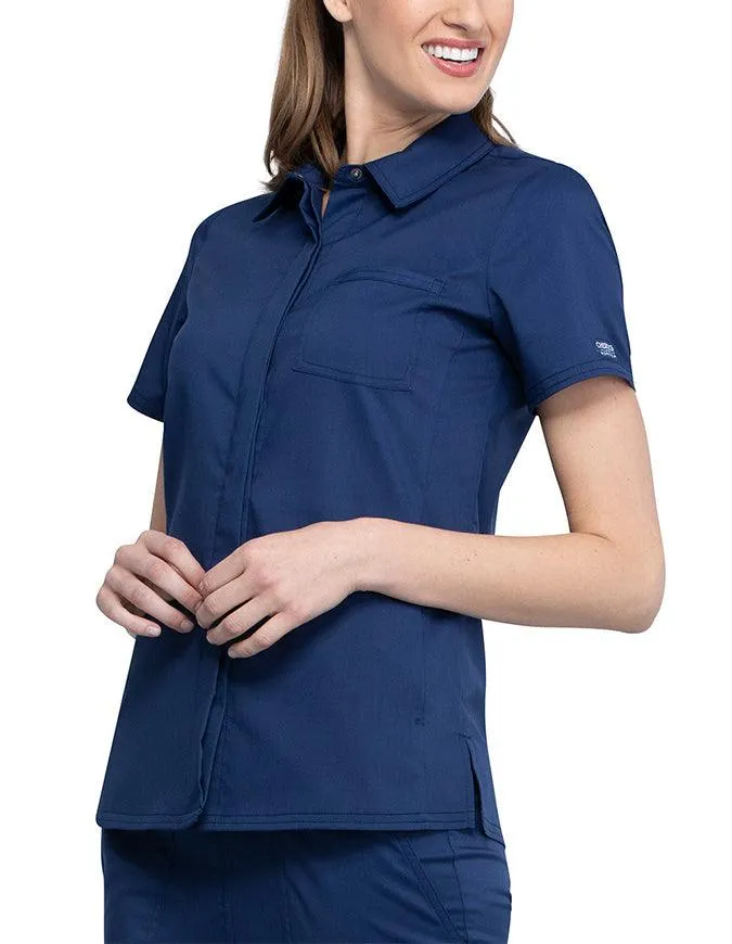 Features of Cherokee Workwear Revolution Women's Hidden Snap Front Collar Shirt: