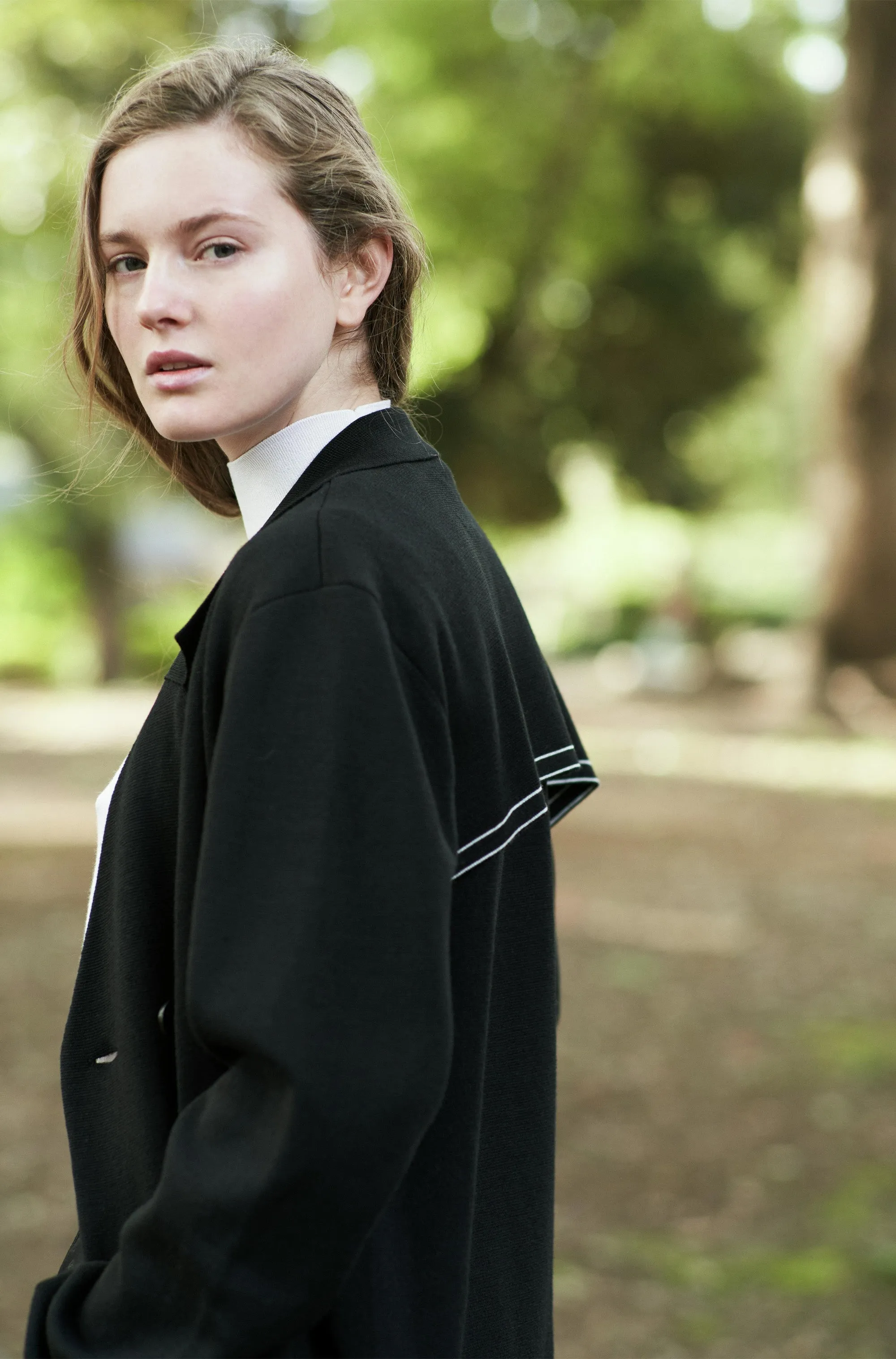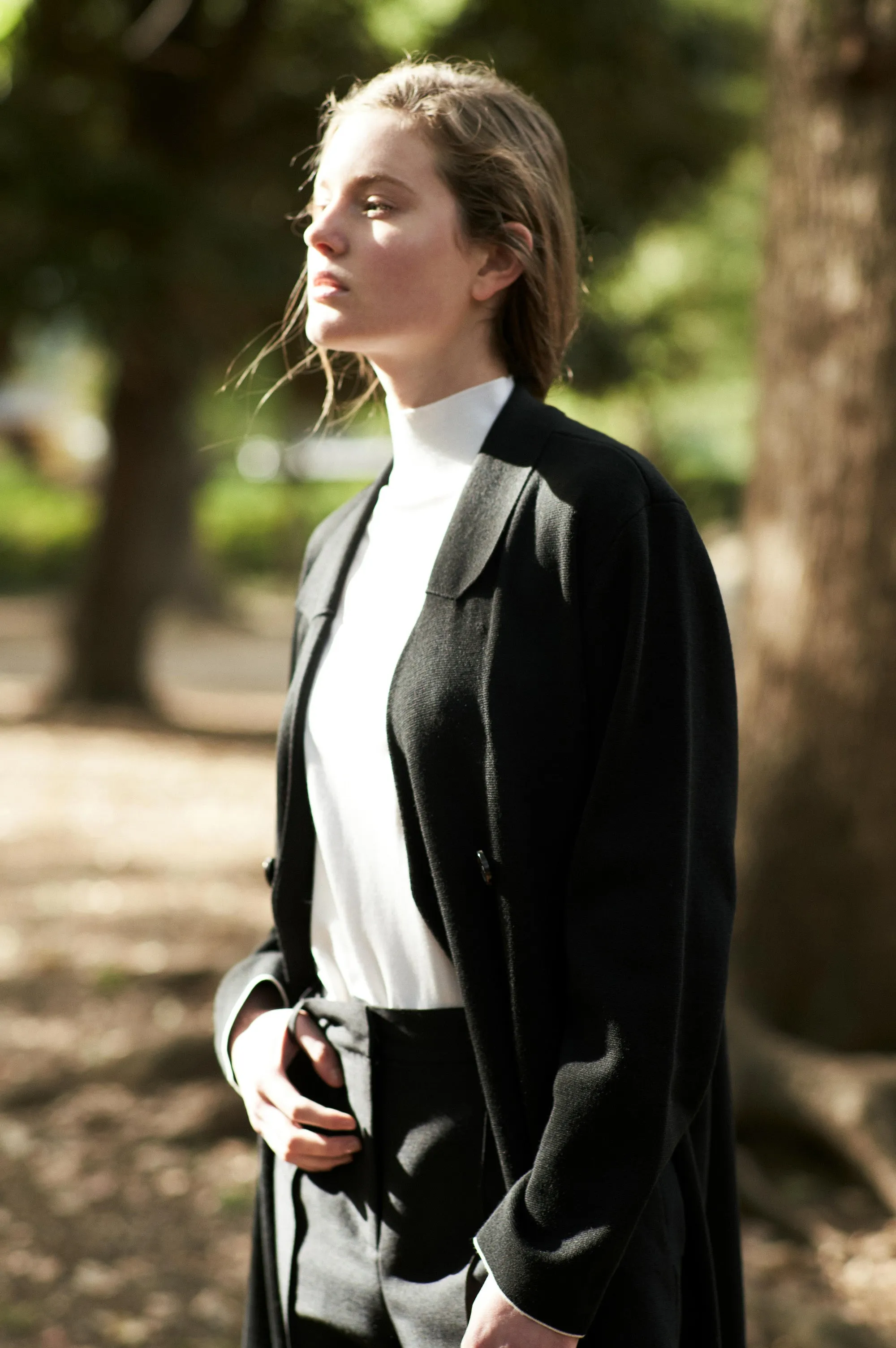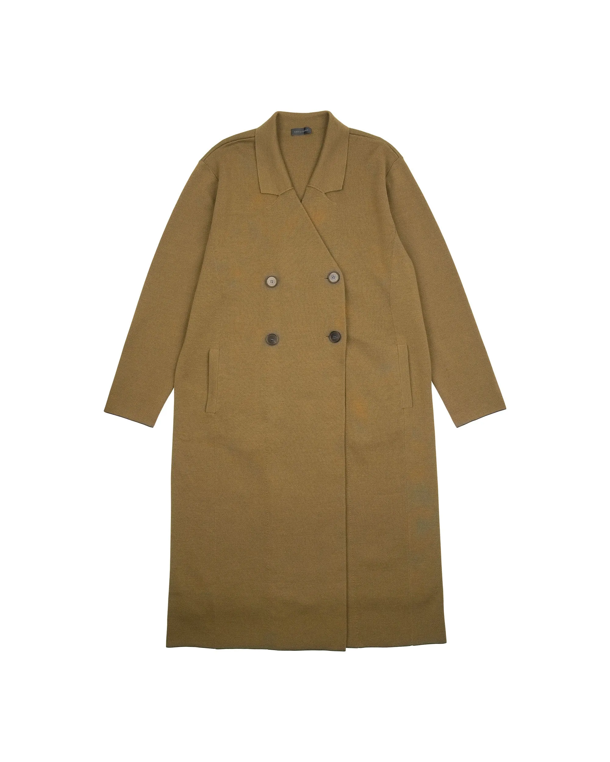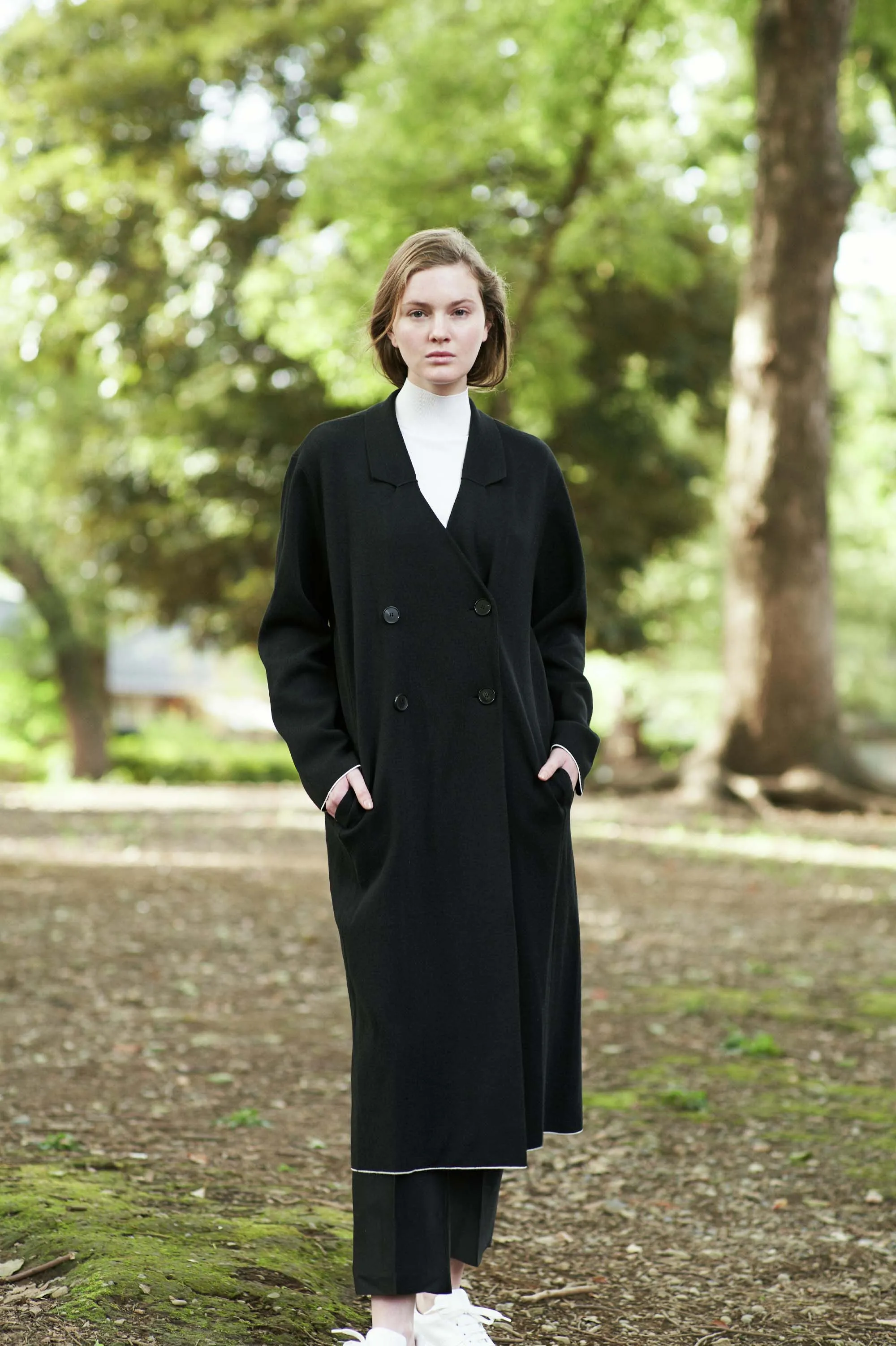 Embodies a captivating fusion of modern rebellion and classic femininity, this double-breasted long coat has a flap collar and side pockets for added utility. A statement knitted line to offer head to toe coordination.