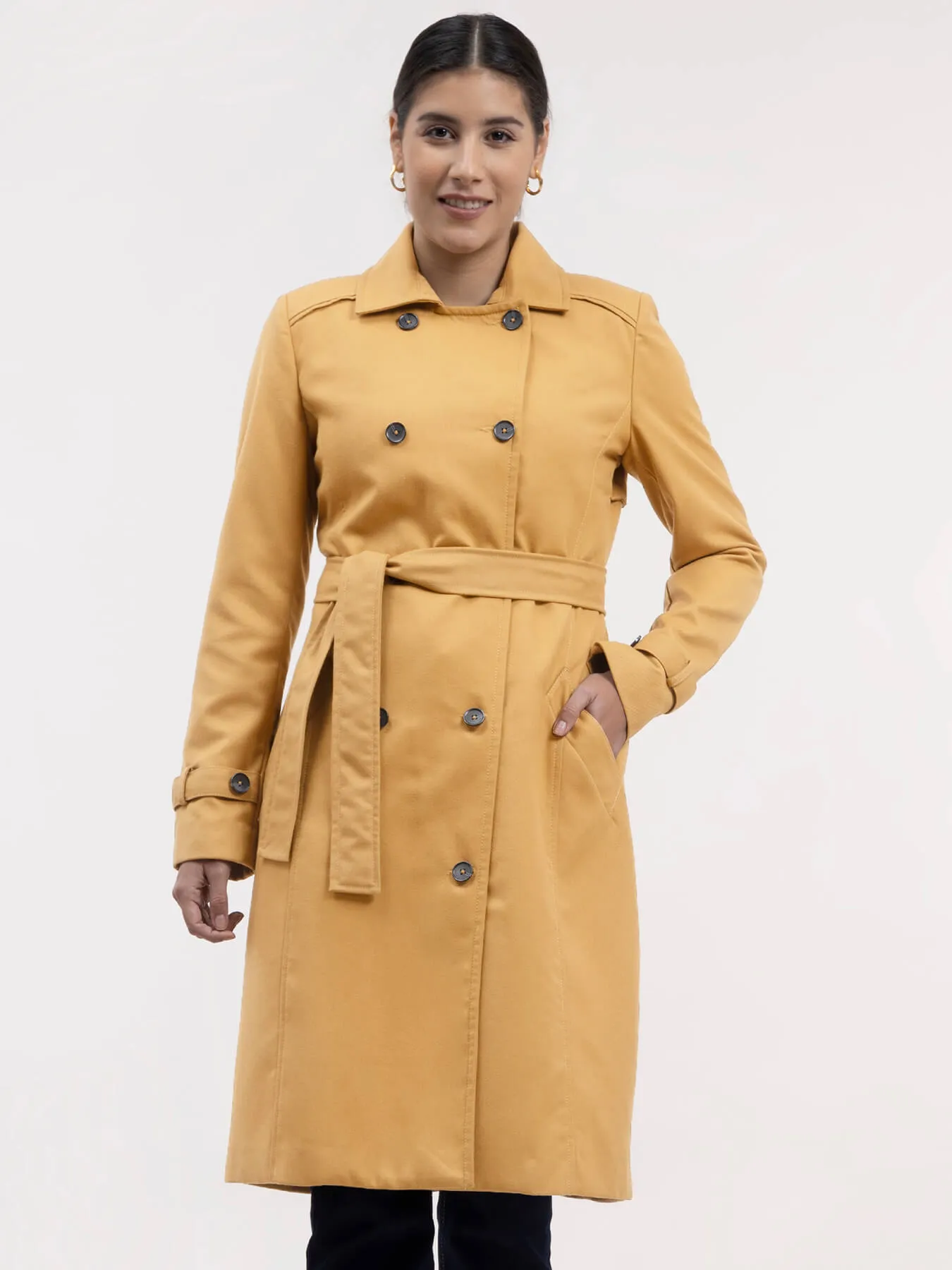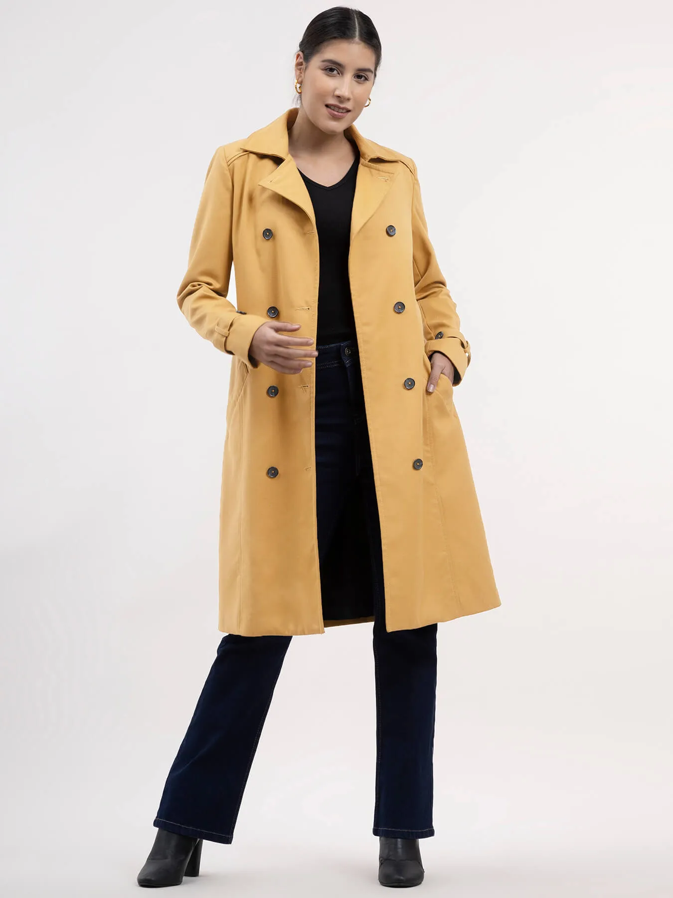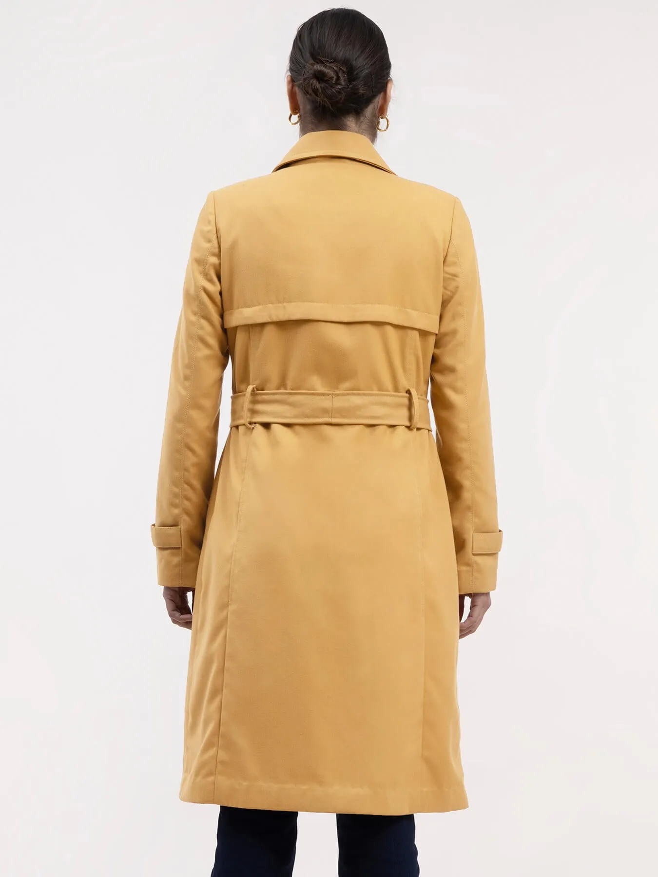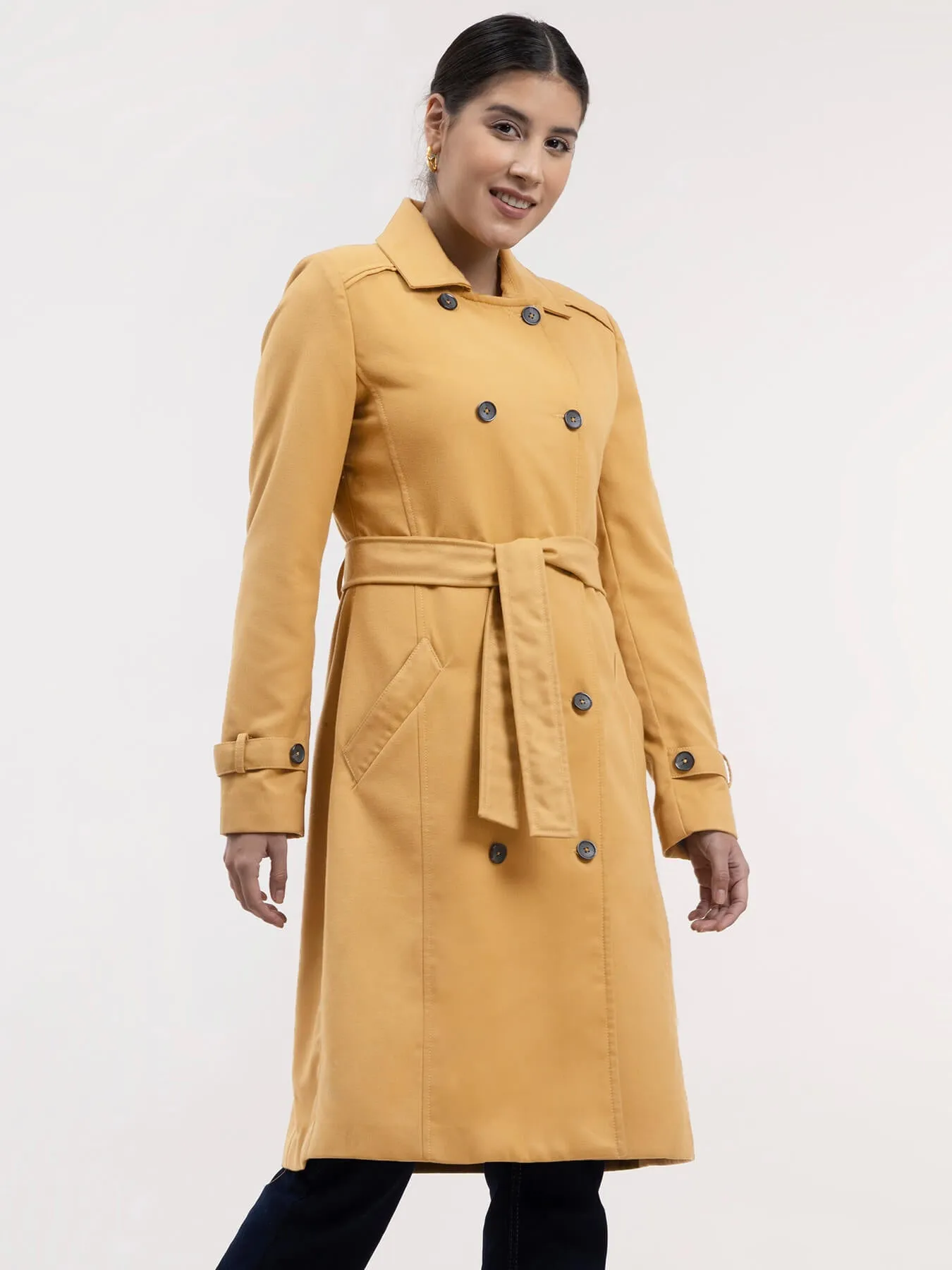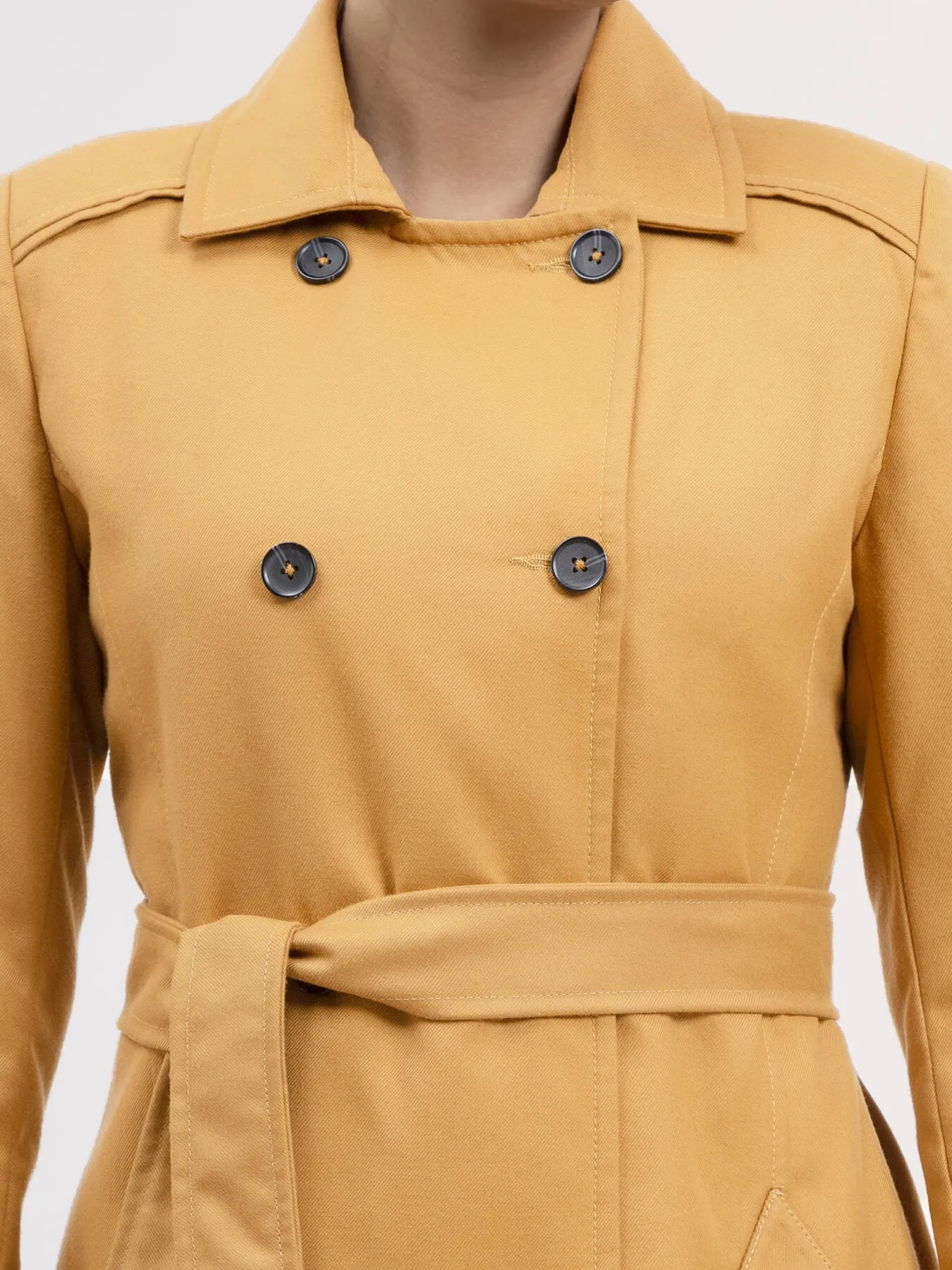 This mustard double-breasted trench coat has a notch lapel collar, full sleeves and button details. It is knee length, has an A-line fit and comes with a belt. Made from Poly Viscose, it is soft, breathable and comfortable.