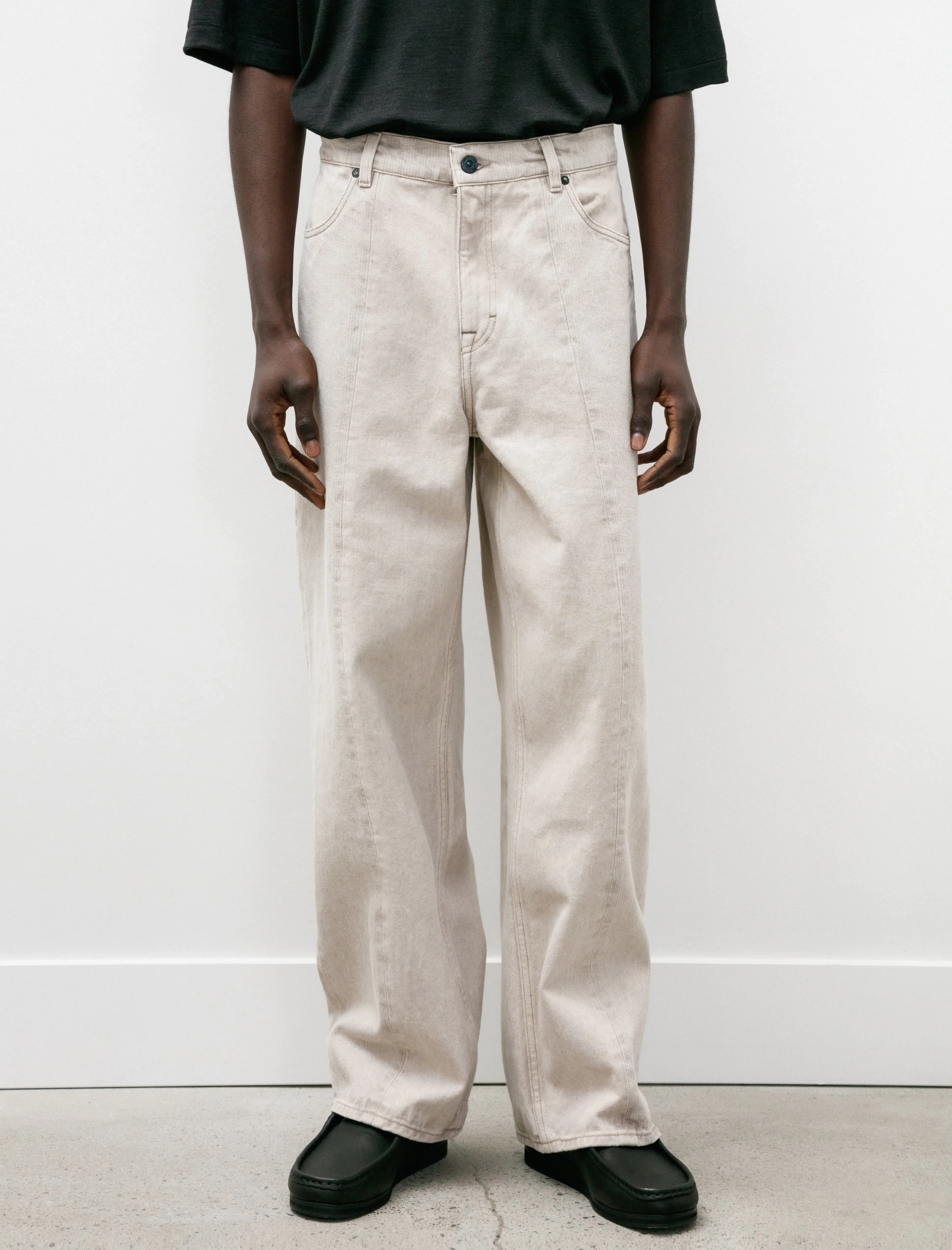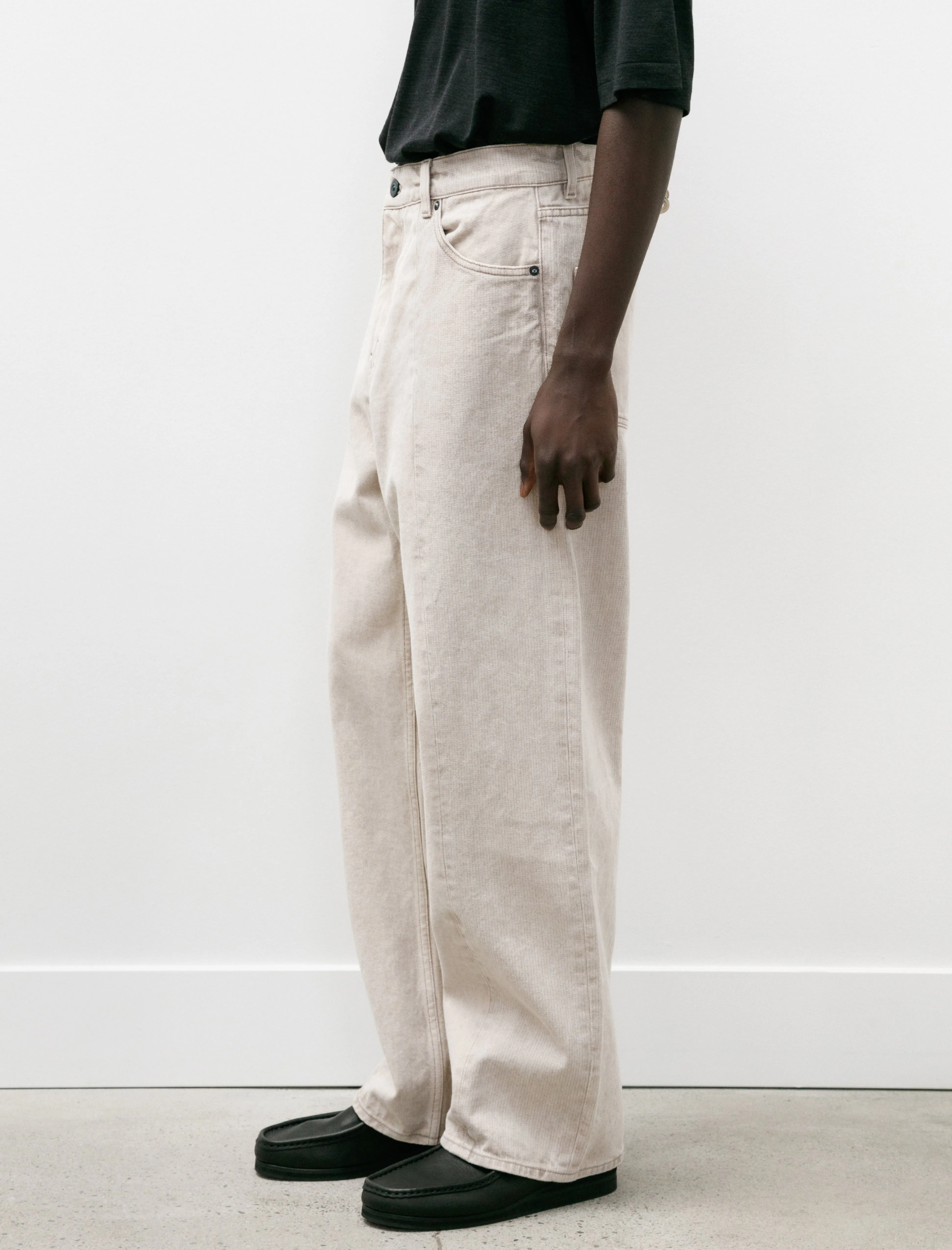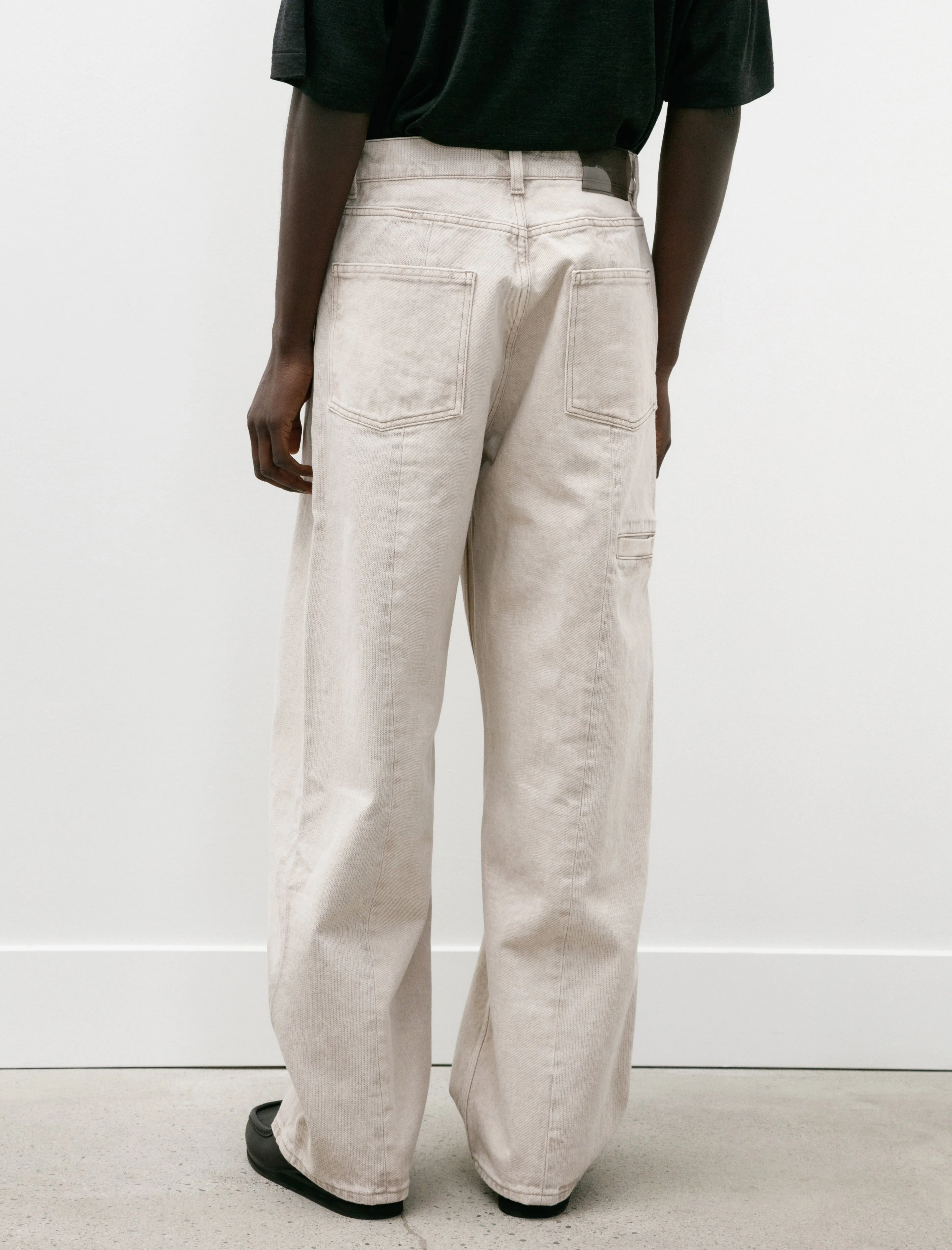 Wide fitting, split-legged jeans cut from a cotton twill and a texture striped cotton twill both in a faded, beige tone wash. Feature a zip fly with a tack button top closure, classic denim five pocket styling with an additional pocket at the right thigh, and Our Legacy's signature translucent logo patch at the rear waist. The split leg with a central seam running up the front and back allows for subtle shaping through the silhouette to create a column-like shape that is accented by slight curves throughout. Sewn using chain stitched, flat felled seams through the seat and inseam for a hard wearing finish that is built to last; logo embossed, vintage tone hardware throughout.