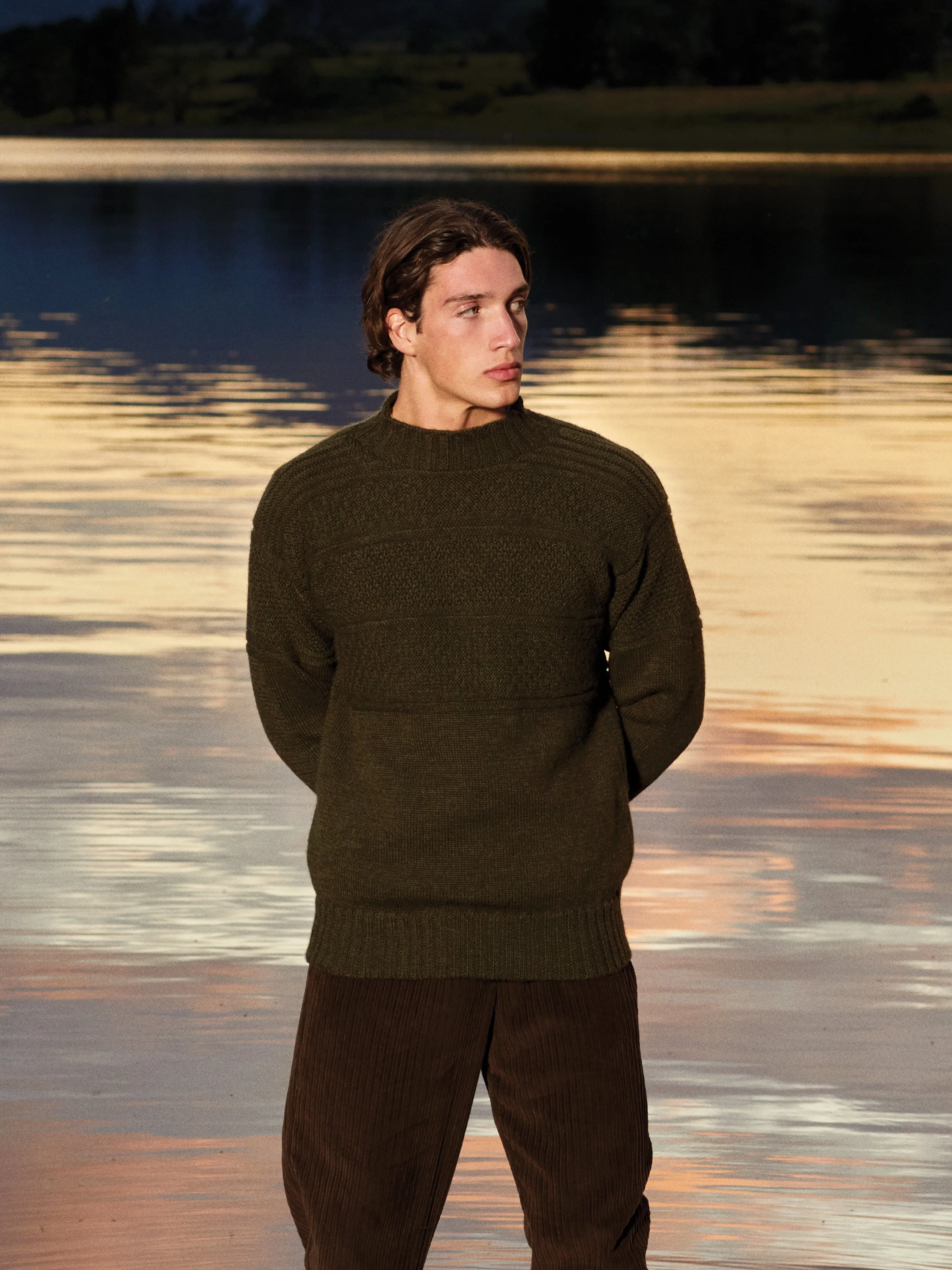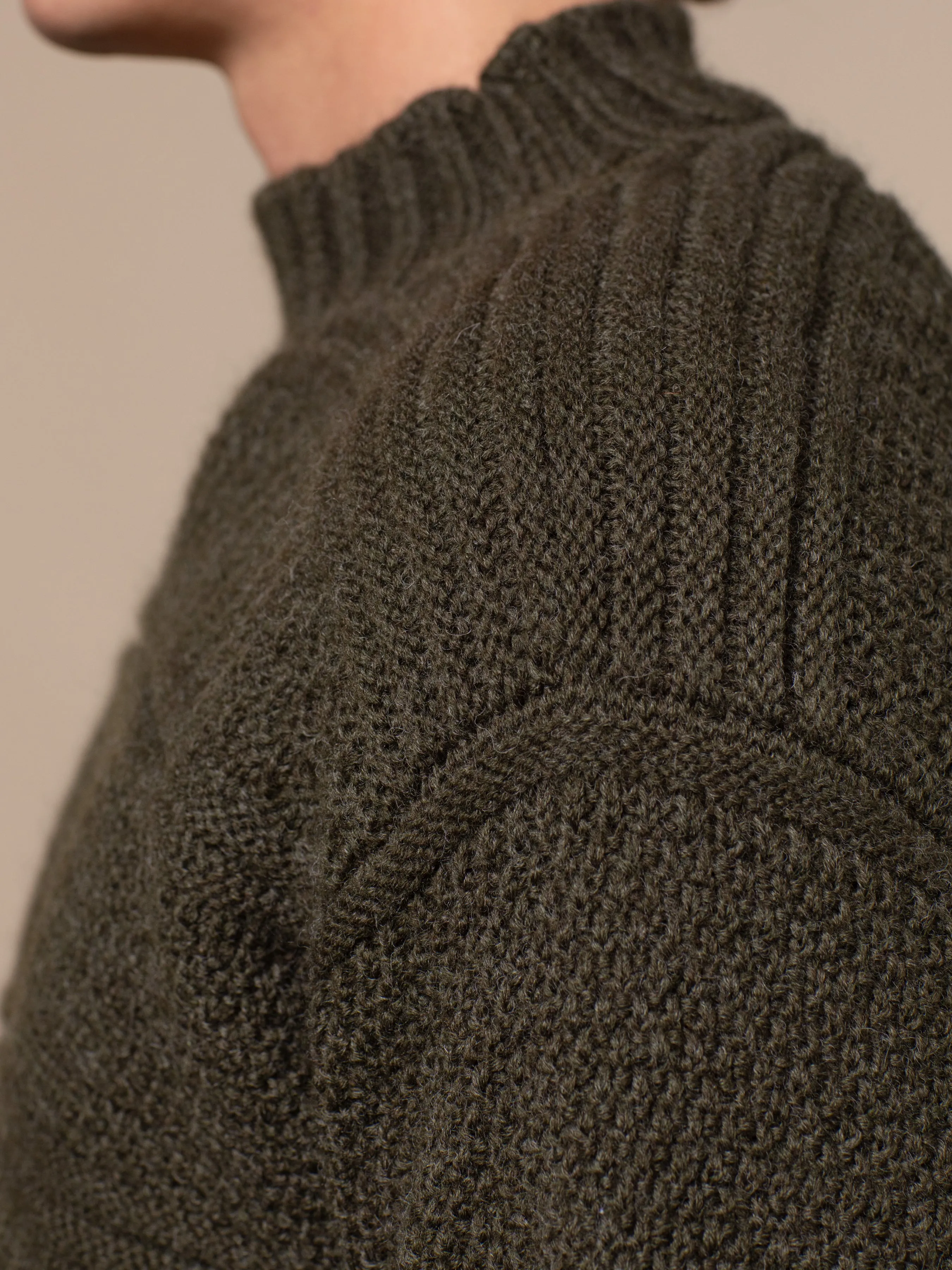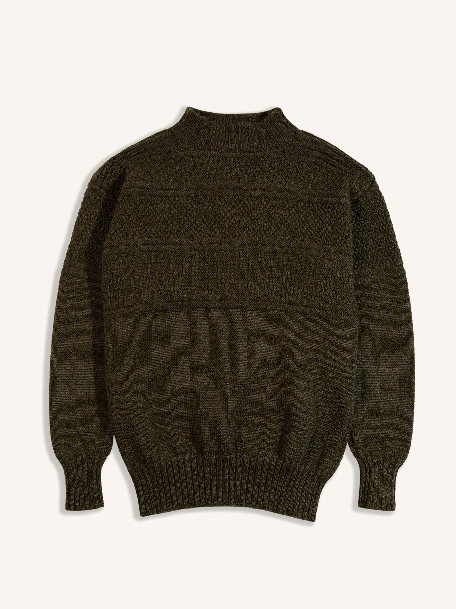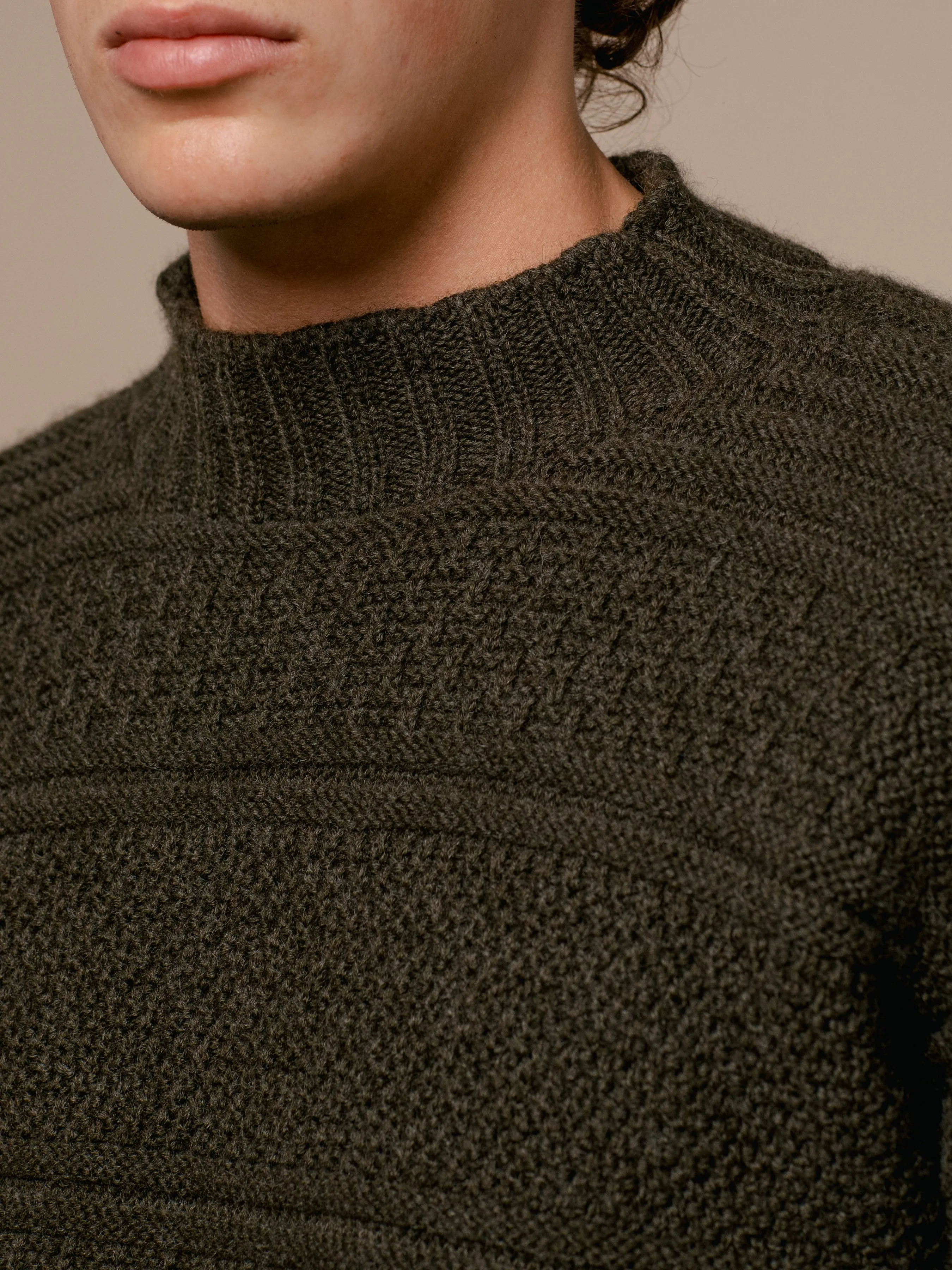 The sweater has a distinctive style with a neatly panelled construction based on a vintage pattern from the area of Fife. It consists of a rib-knit to the lower torso and sleeves, an intricate weave to the upper torso and a chunky-rib to the mock neck collar, cuffs and hem.