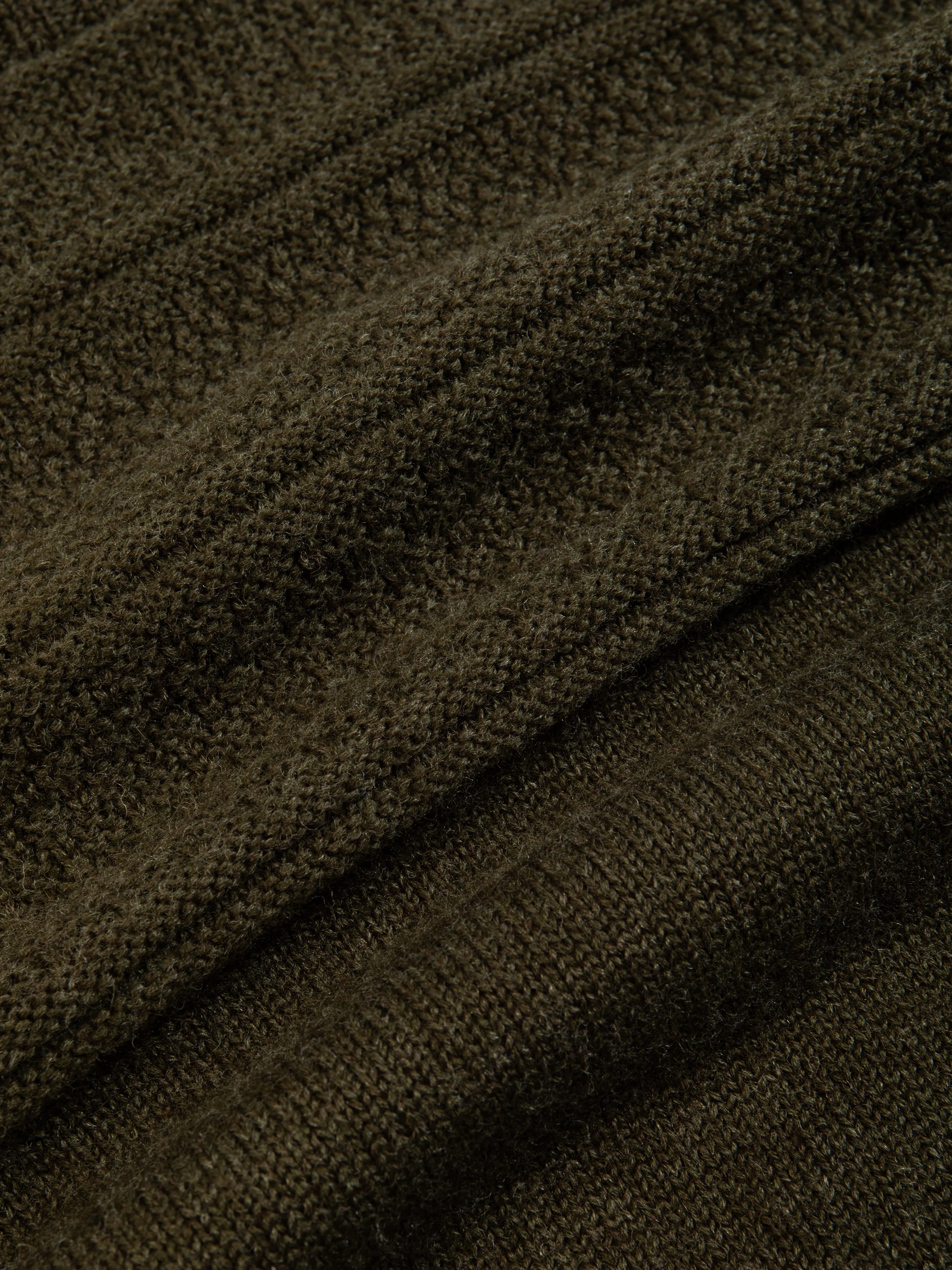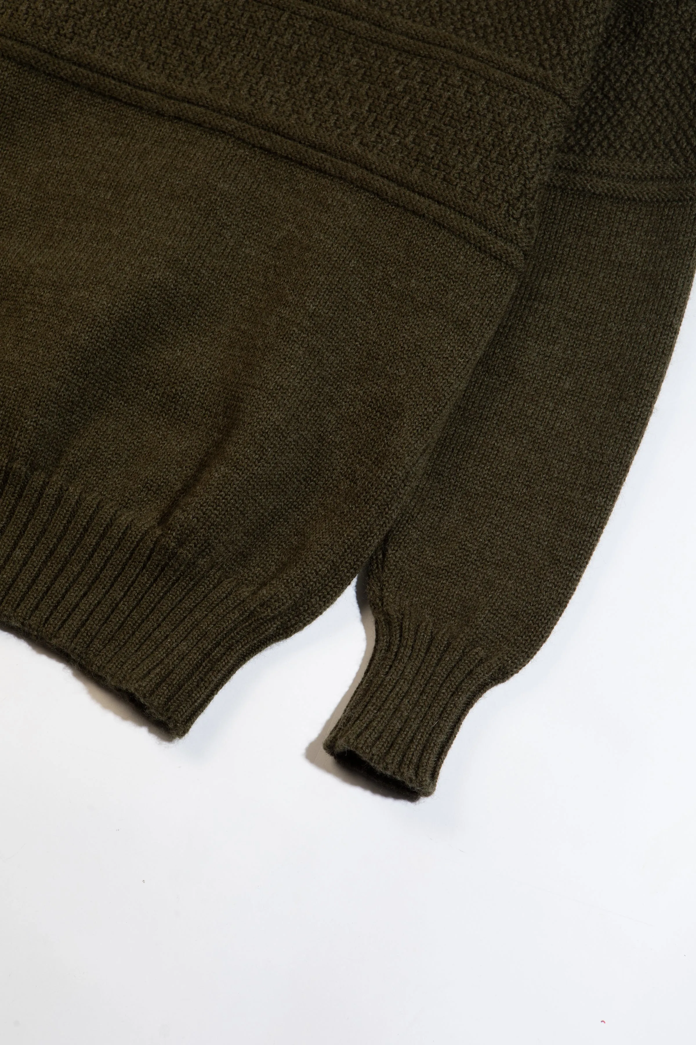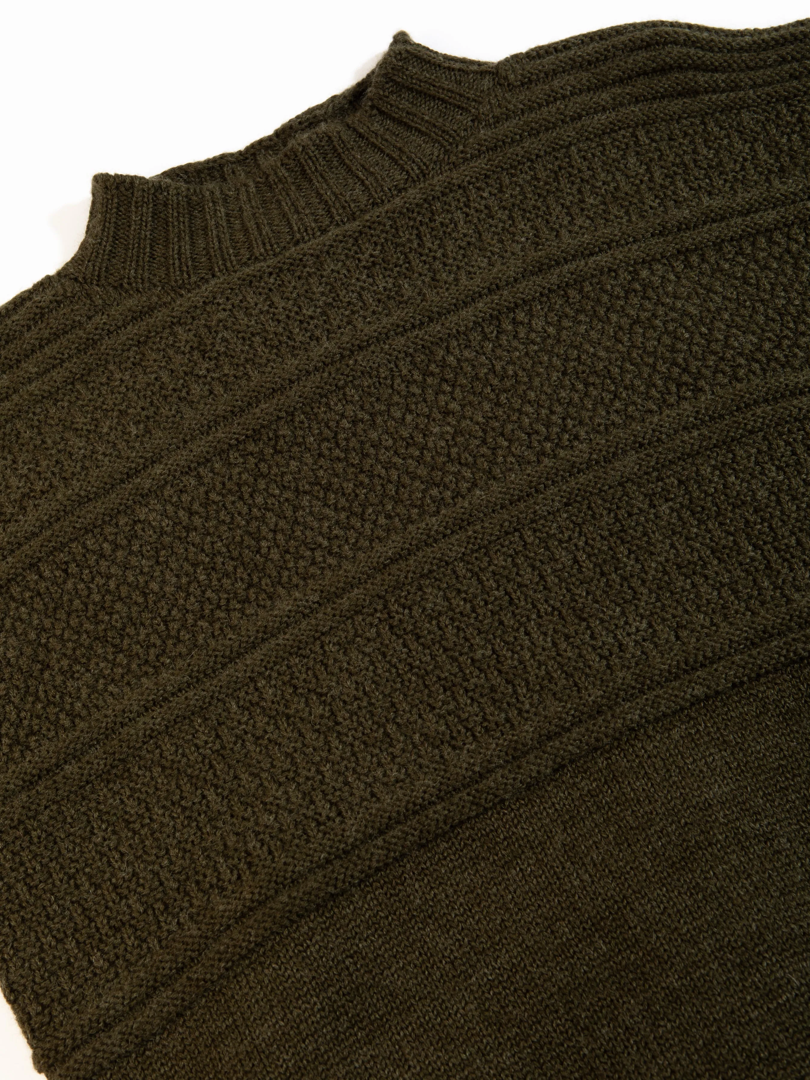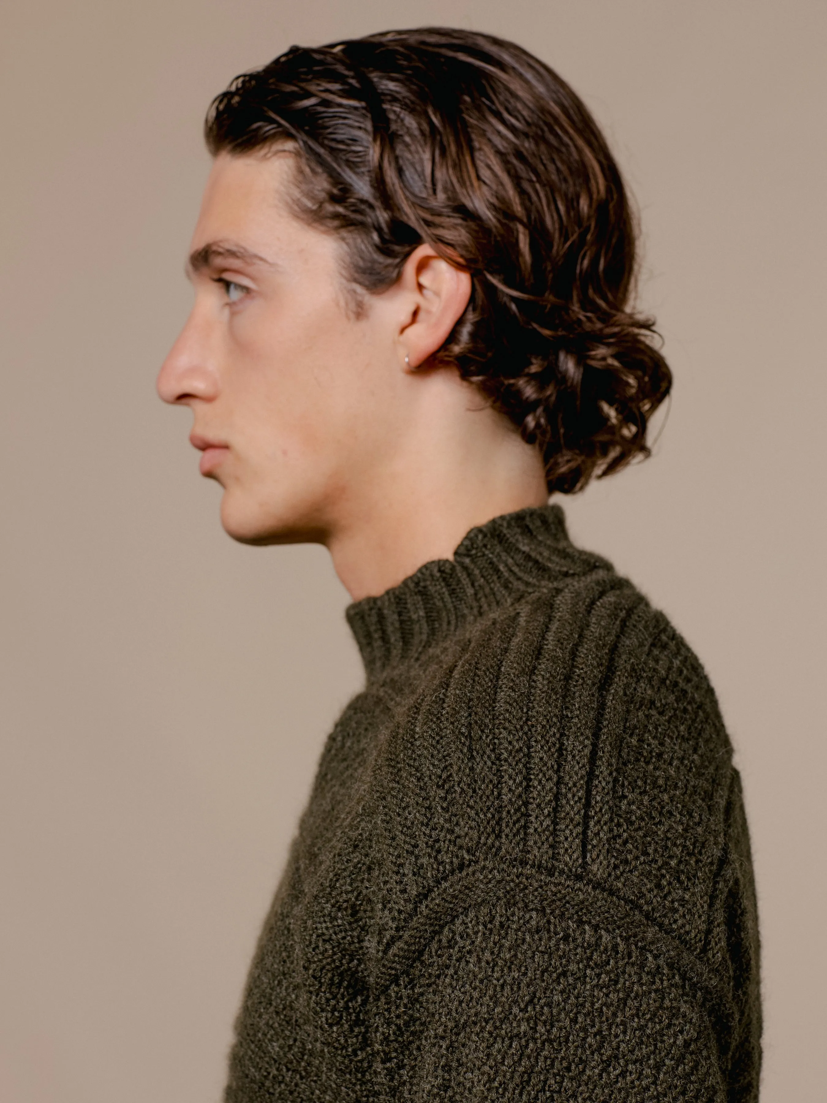 The sweater has a distinctive style with a neatly panelled construction based on a vintage pattern from the area of Fife. It consists of a rib-knit to the lower torso and sleeves, an intricate weave to the upper torso and a chunky-rib to the mock neck collar, cuffs and hem.