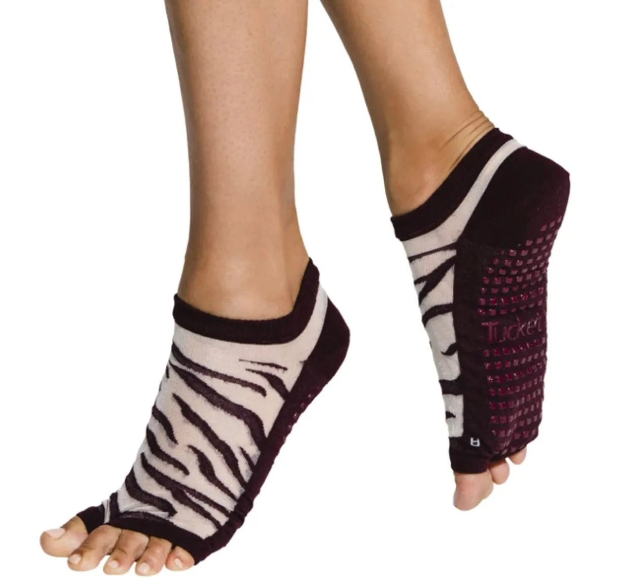 Hey, how you feline? A gorgeous lace inspired grip sock by Tucketts. These innovative low-cut grip socks are perfect for exercises including Pilates, Yoga, Barre, Martial Arts, and more. It's designed with an anti-slip grip sole to help you feel confident and stable while exercising. Now available in a sheer tiger print inspired style with a garnet grip bottom.