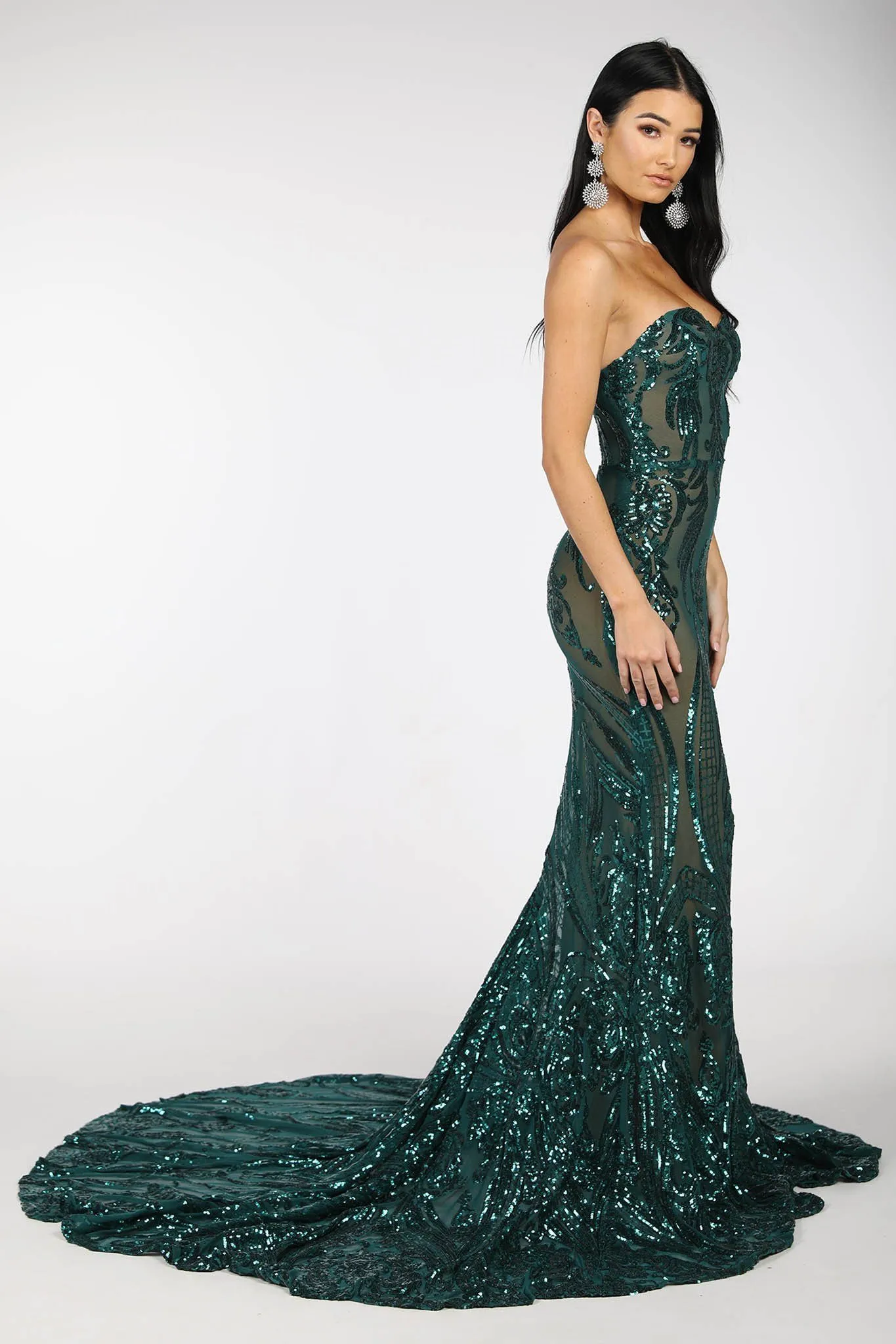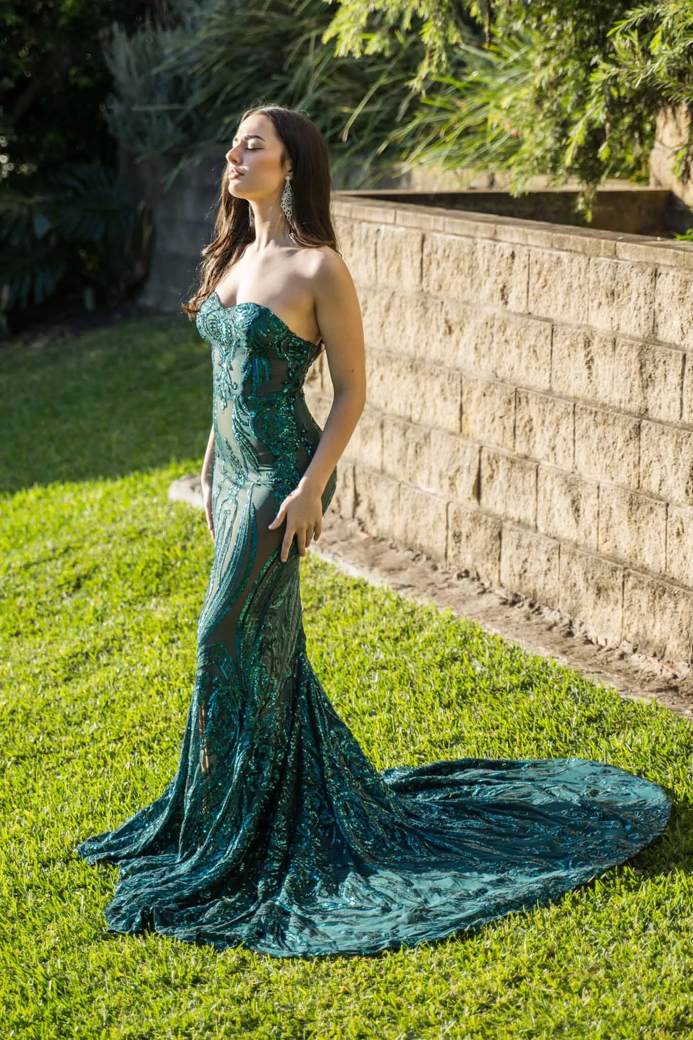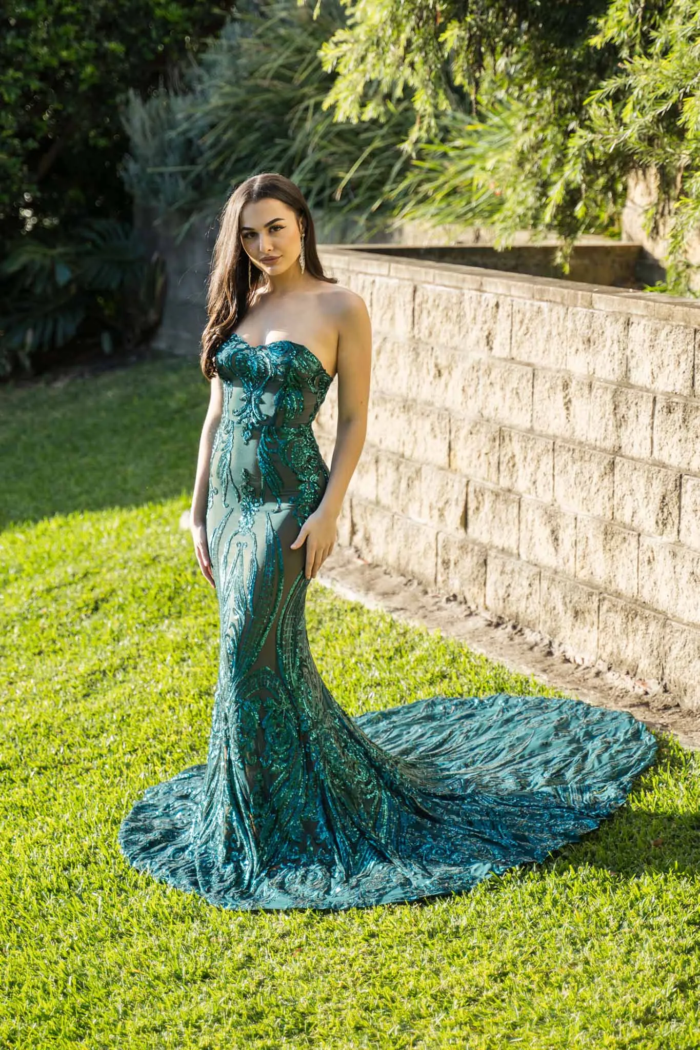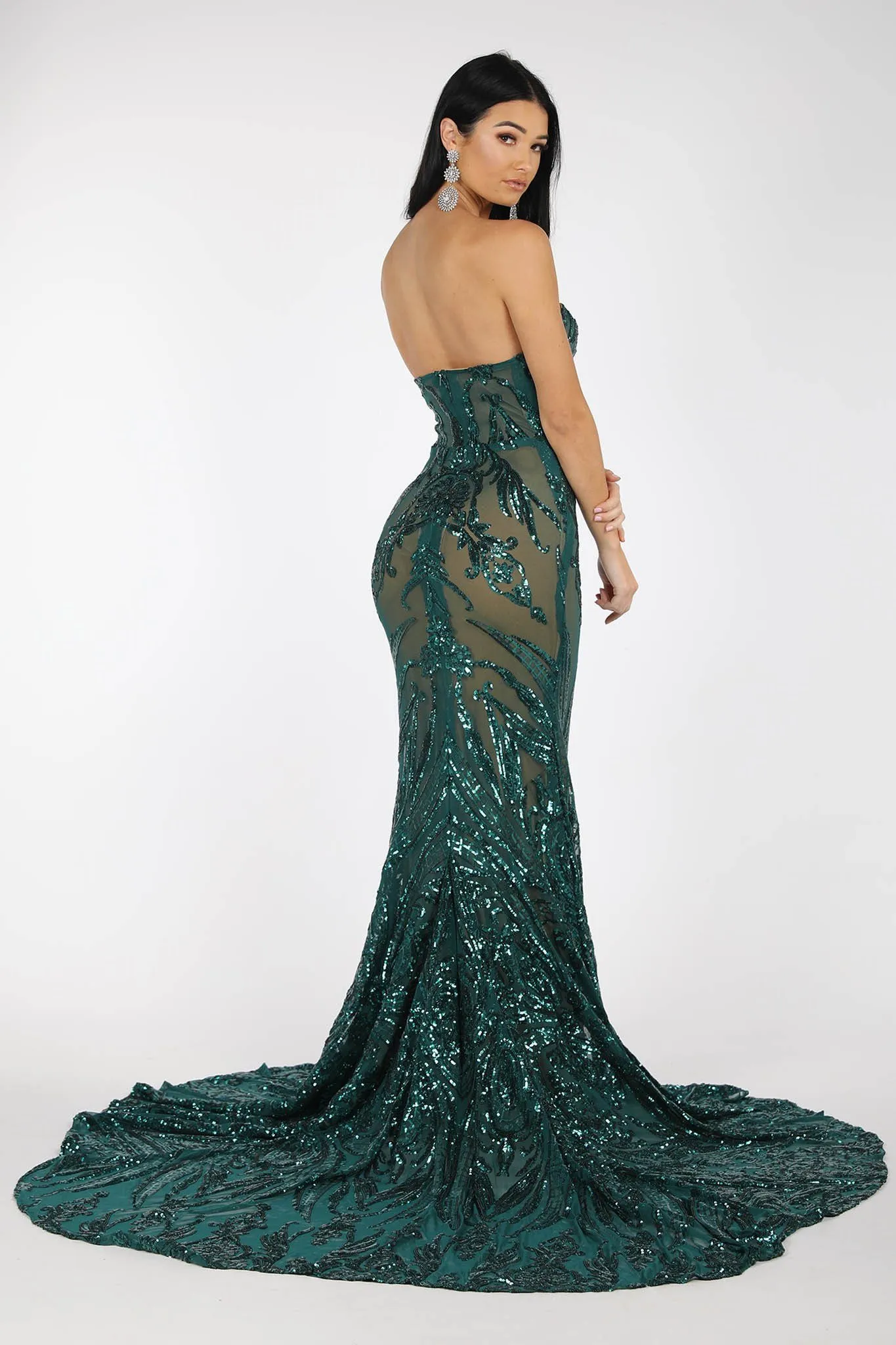 The Gianna gown in Emerald/Nude features deep green embroidered pattern sequins over nude underlay to create the trendy nude illusion look. A classic strapless sweetheart neckline, figure-hugging bodice that flows into a mermaid sweep train exudes elegance and class. This dress will make you look and feel beautiful on a red carpet or any formal event.