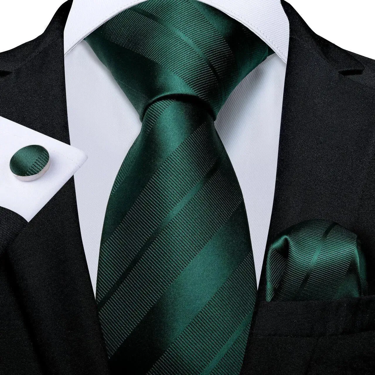 Green Stripe Necktie, Pocket Square, Cufflinks Set