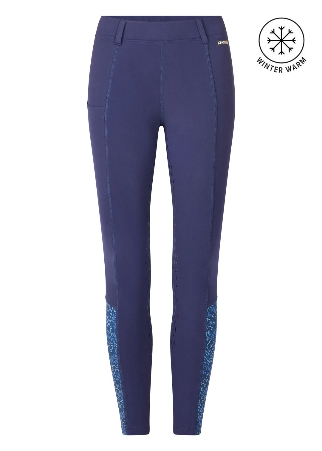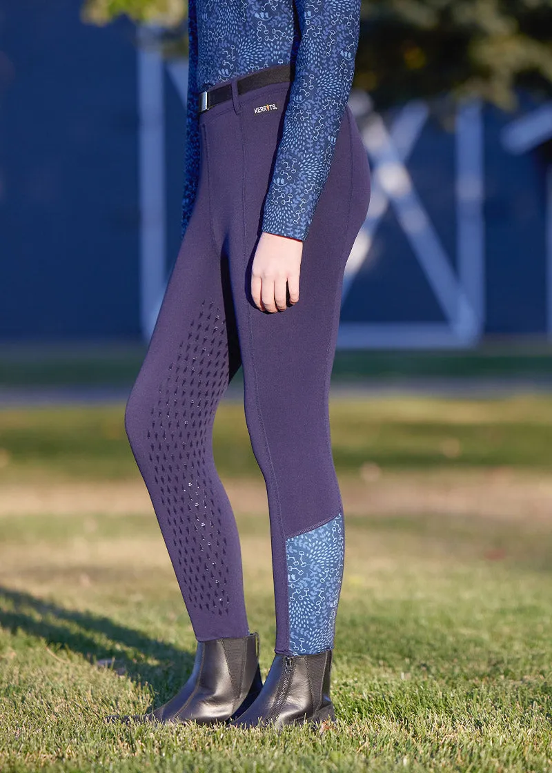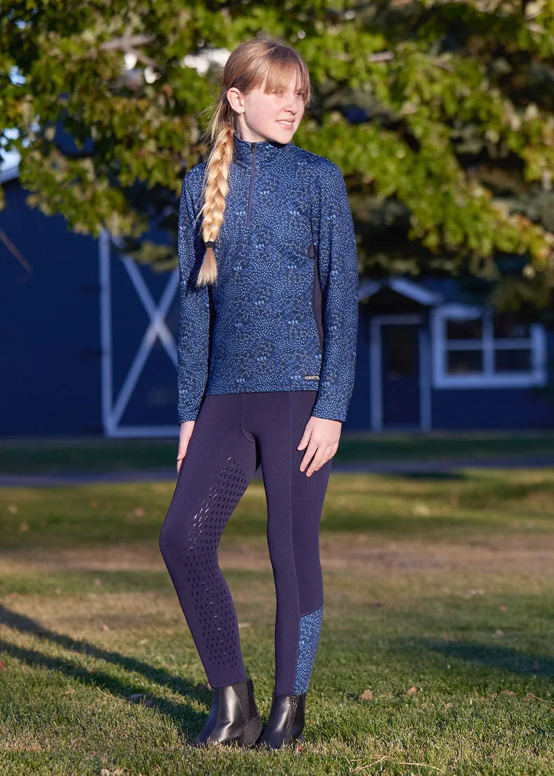 A step up in warmth and grip for when chilly weather tempts ponies to prance, these comfy kids tights are ideal for shoulder seasons. The lightly brushed interior insulates while supple Kerrit Sticks™ Silicone along the inner thigh and leg add grip. Fun contrast calf panels match their favorite prints. One side pocket holds treats for horse and rider.
