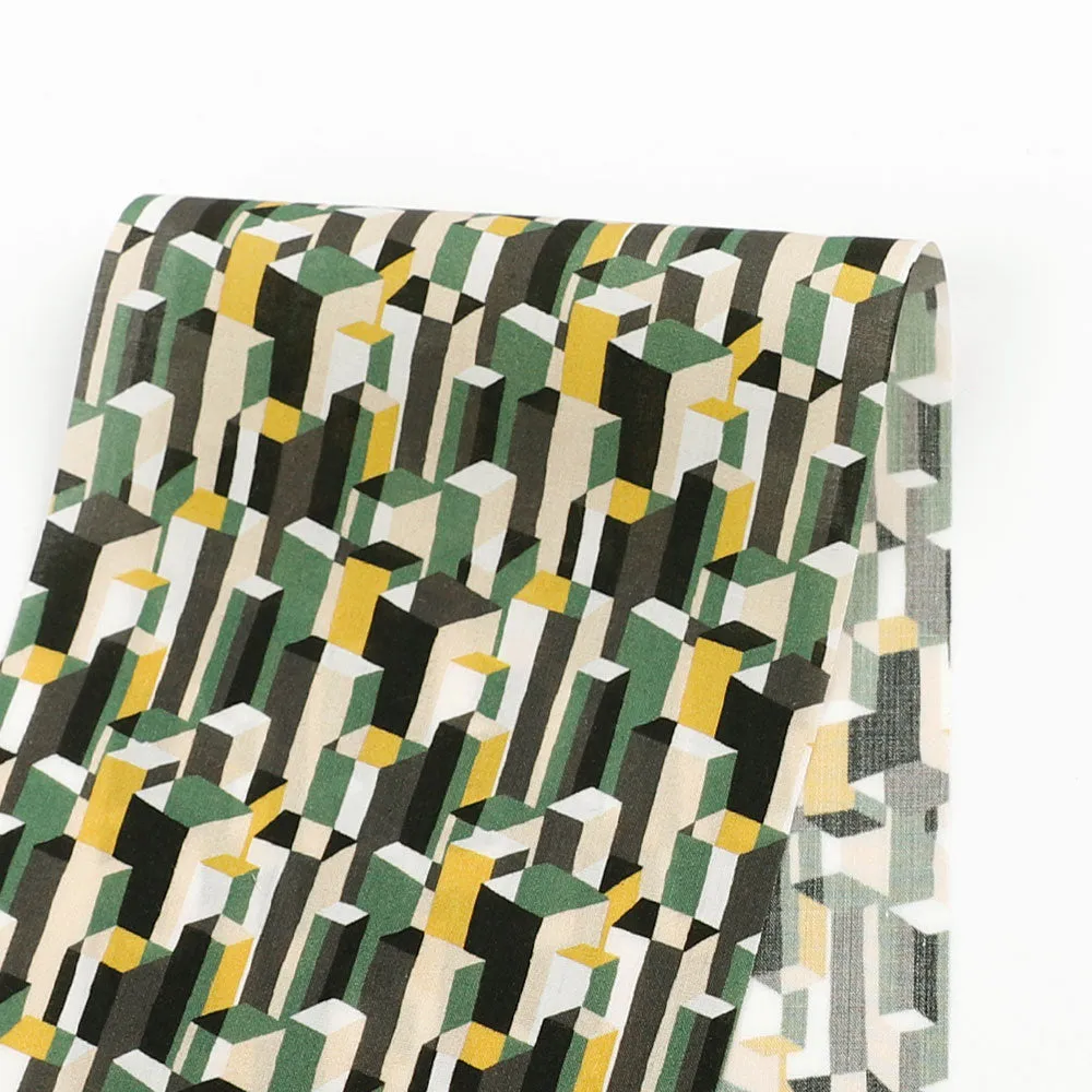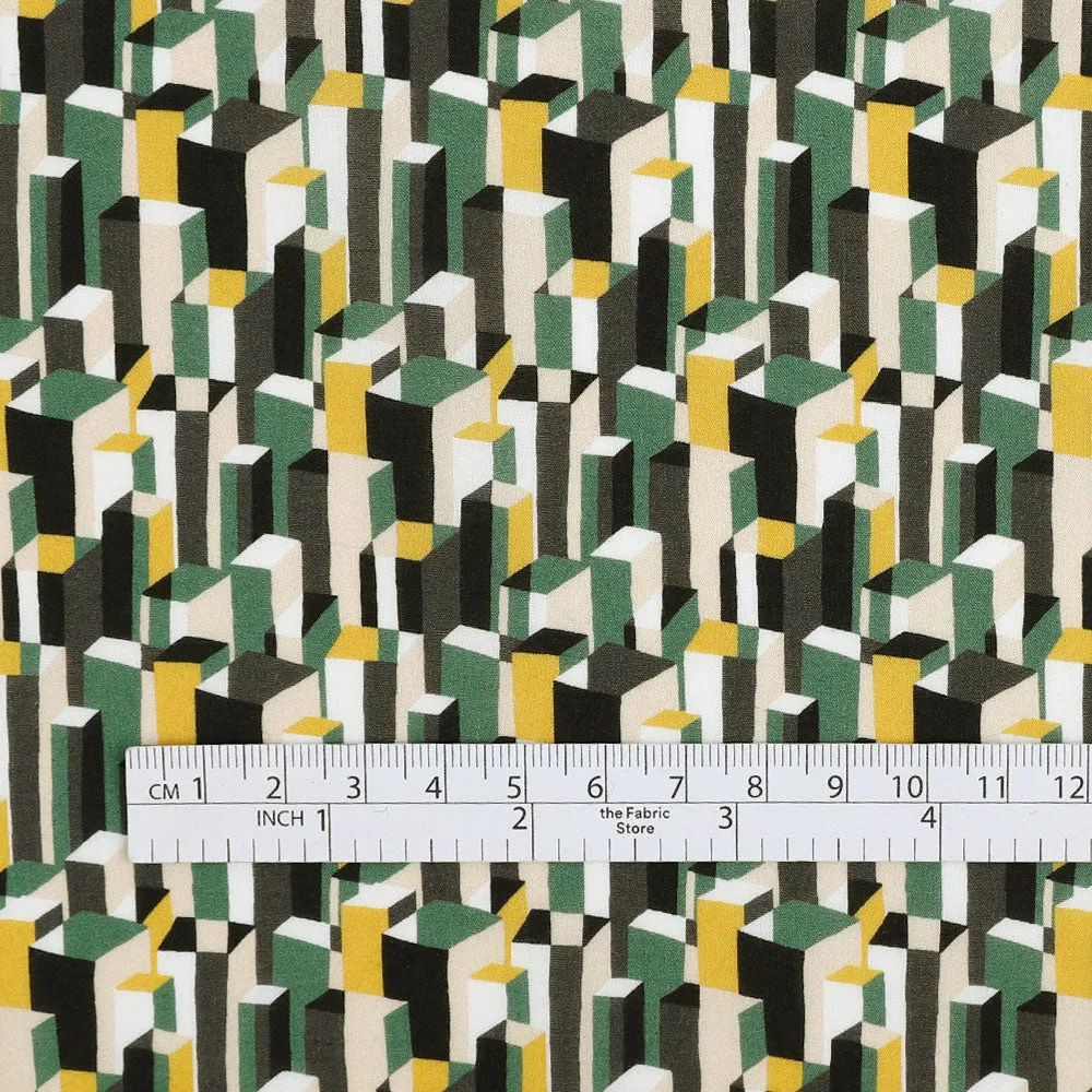 // A pure cotton Liberty Tana Lawn - the Metropolis print consists of colour-blocked rectangles that come together to resemble a stylized, tightly packed cityscape. This design is printed in tones of black, military green, white, mustard yellow, and beige. A super fine, tightly woven plain weave cotton with no stretch and a matt, semi-translucent finish.