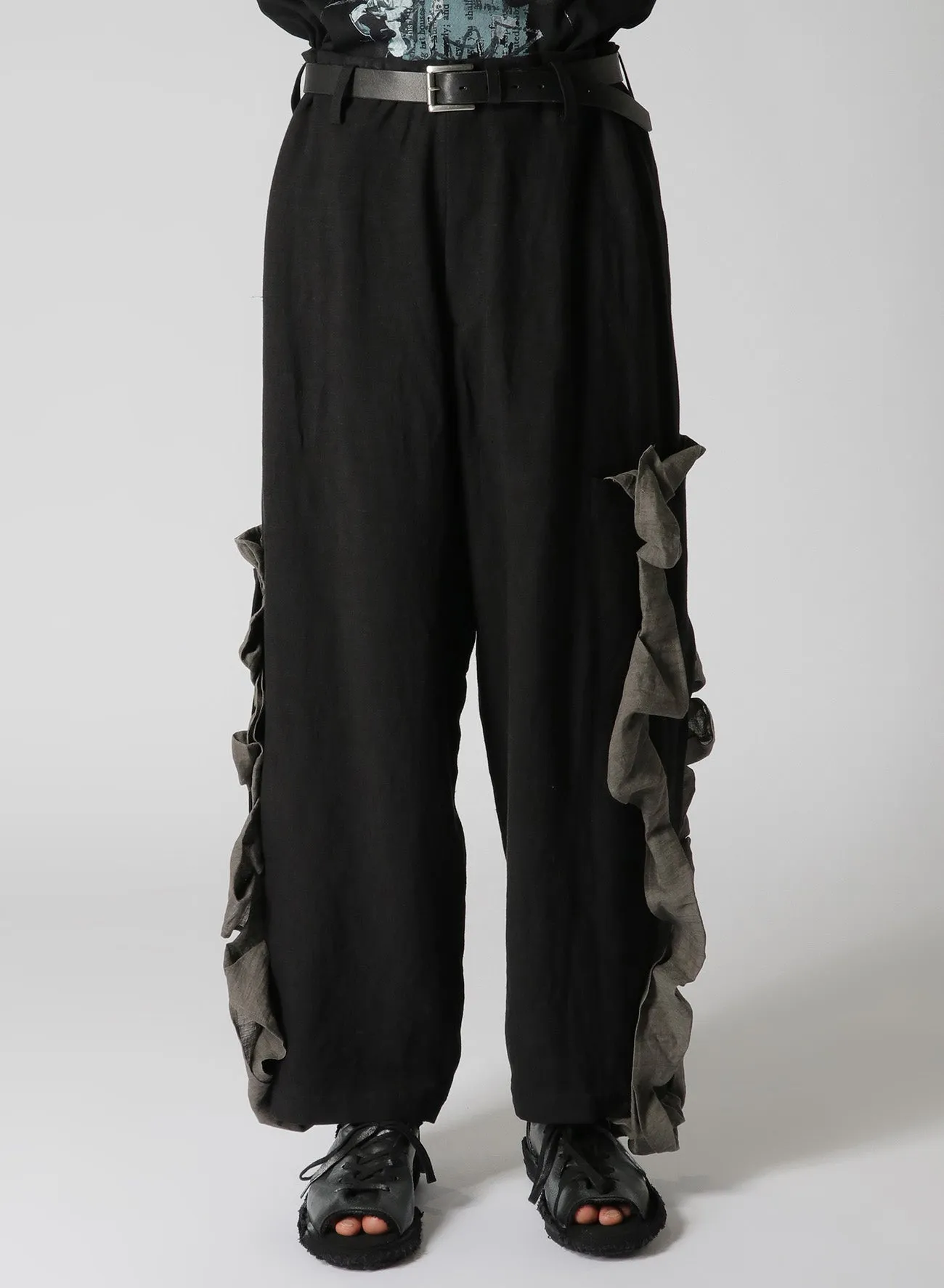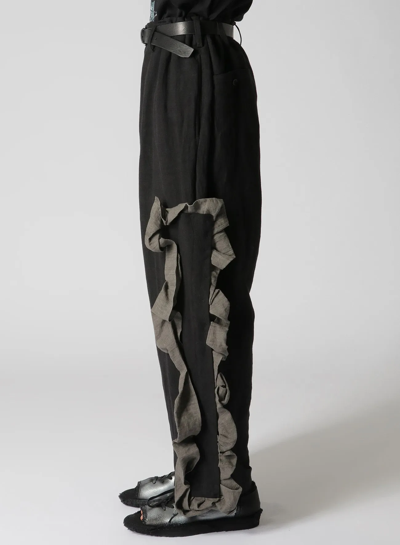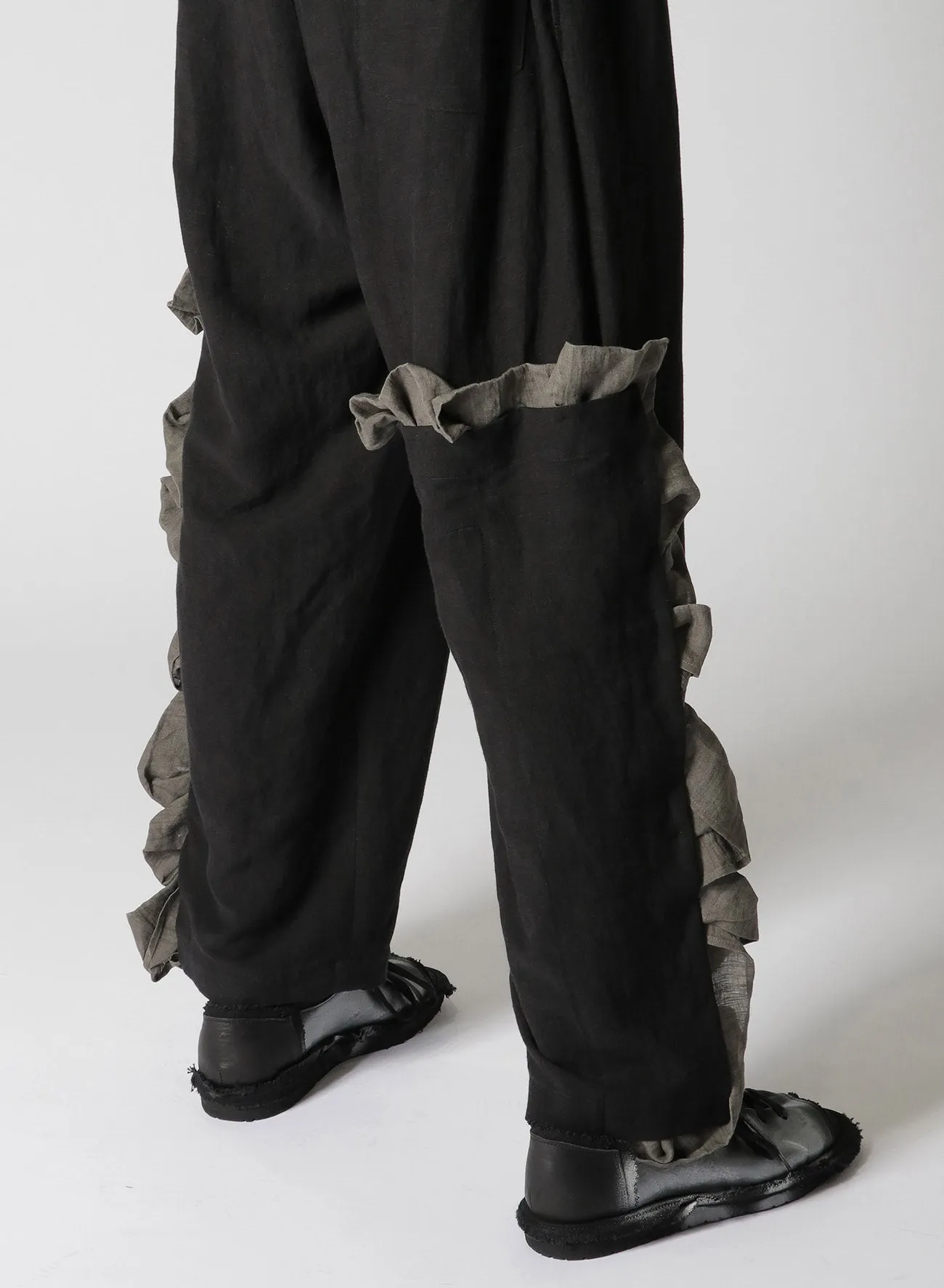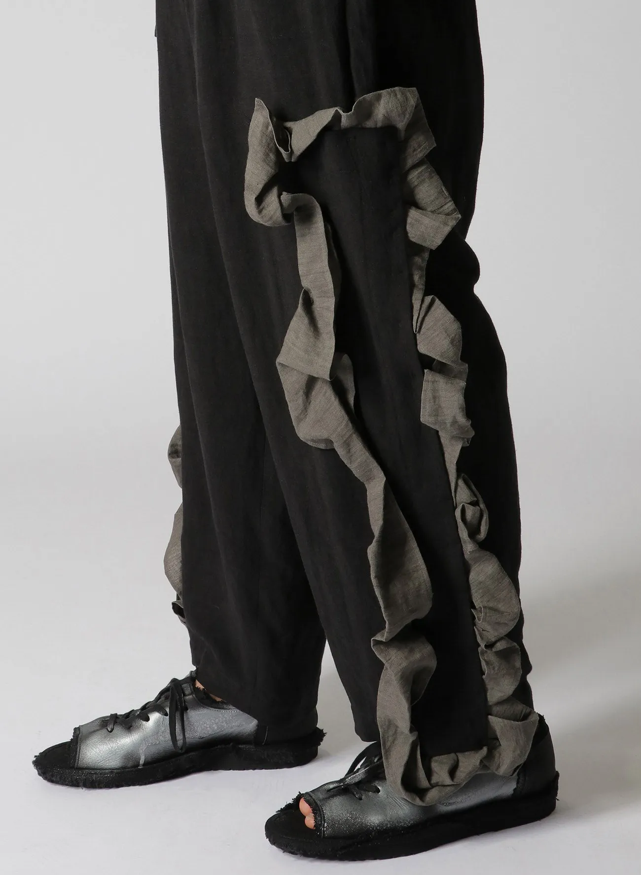 These frill-accented, drawstring pants utilize rayon-linen canvas and present an asymmetric design with twisted frills stitched into the combination panels. The fabric undergoes extensive processing from raw state to dyeing and finishing, ensuring a soft texture.