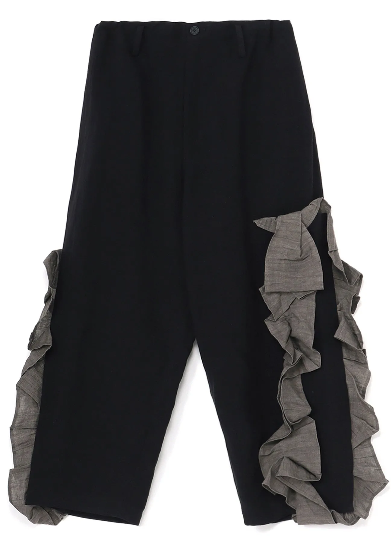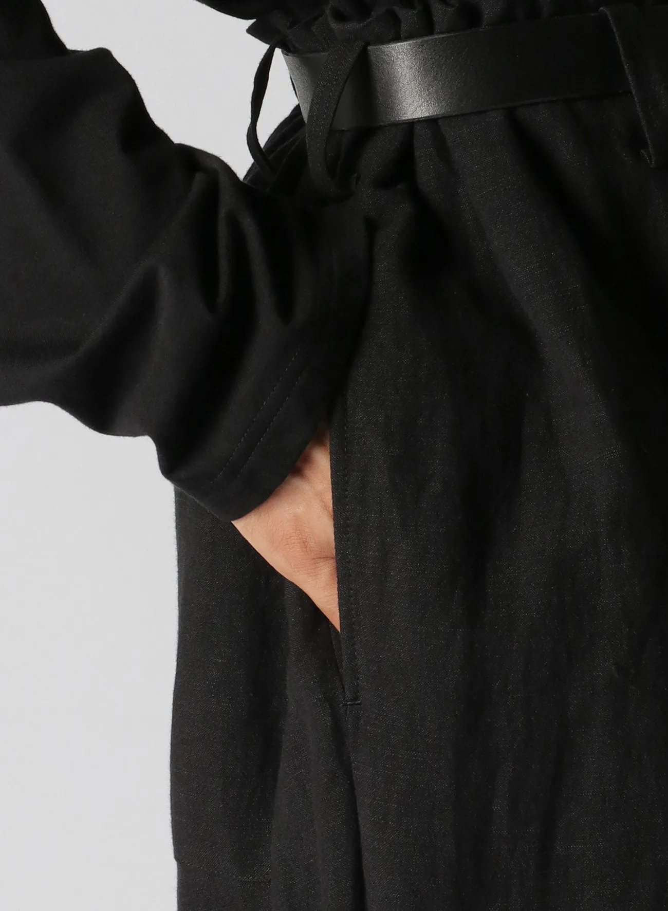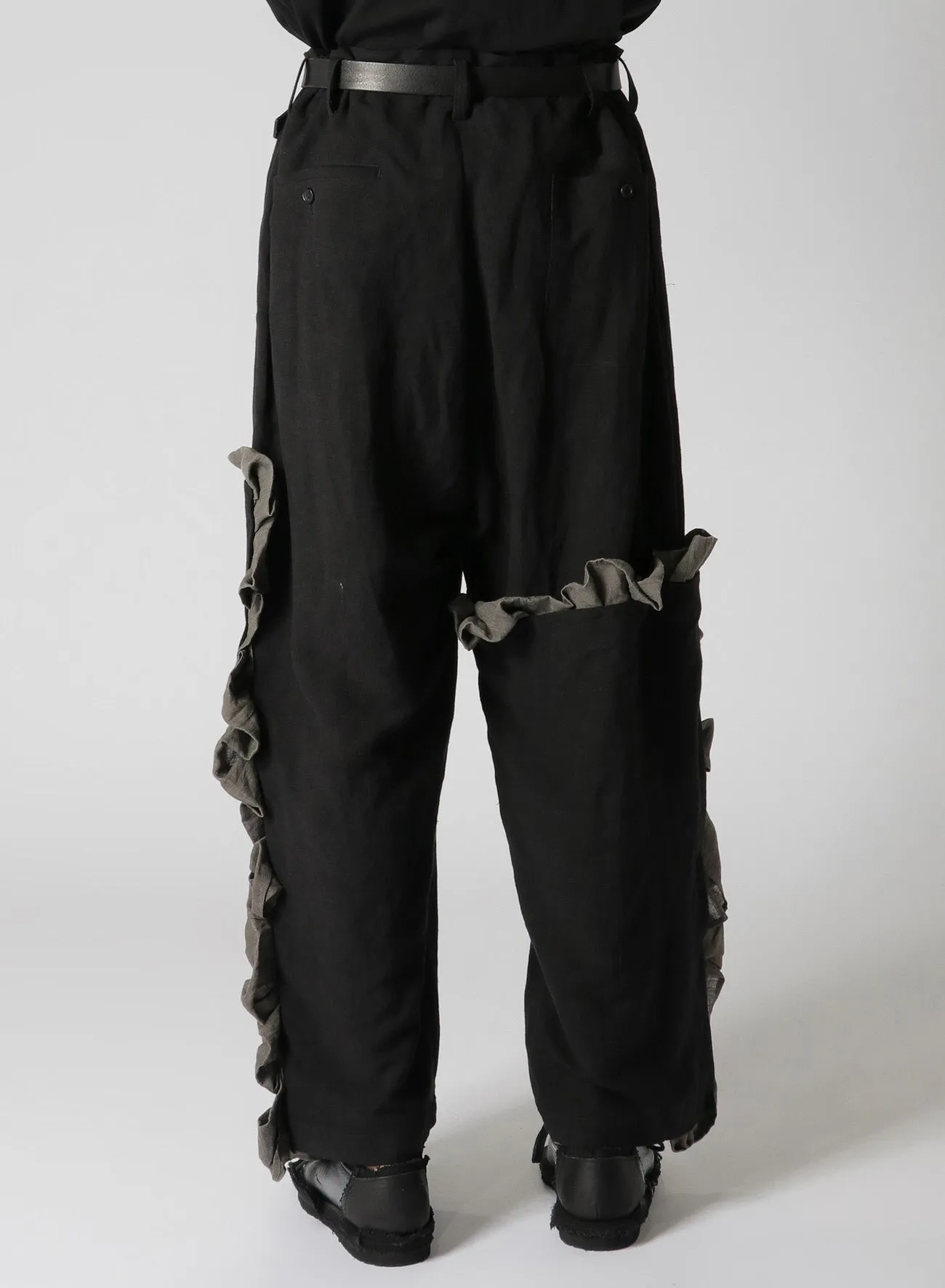 These frill-accented, drawstring pants utilize rayon-linen canvas and present an asymmetric design with twisted frills stitched into the combination panels. The fabric undergoes extensive processing from raw state to dyeing and finishing, ensuring a soft texture.