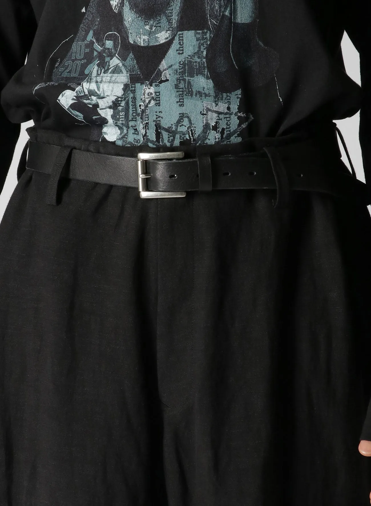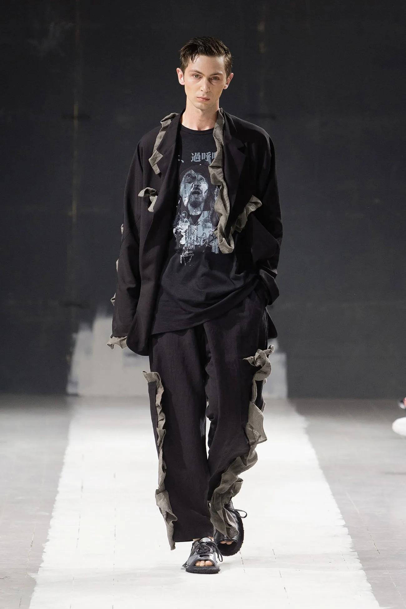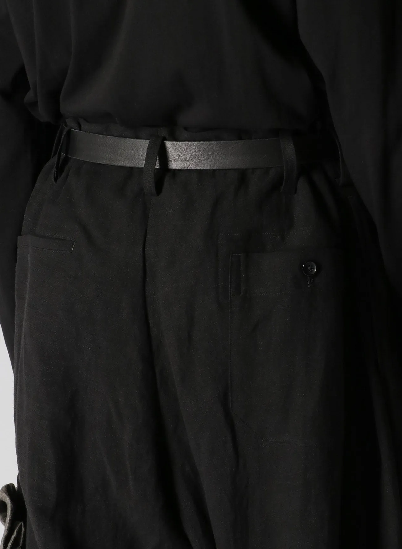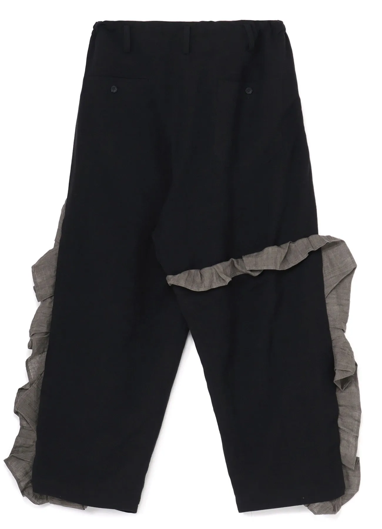 These frill-accented, drawstring pants utilize rayon-linen canvas and present an asymmetric design with twisted frills stitched into the combination panels. The fabric undergoes extensive processing from raw state to dyeing and finishing, ensuring a soft texture.
