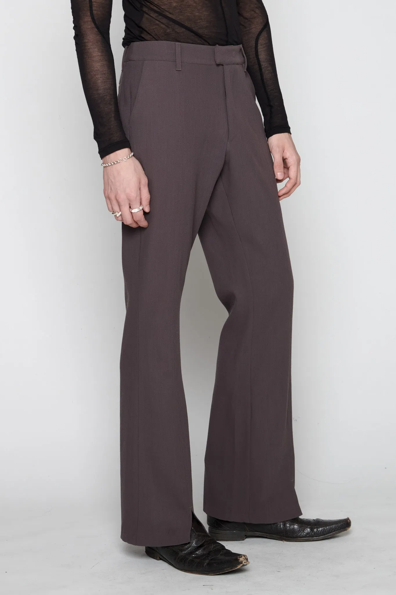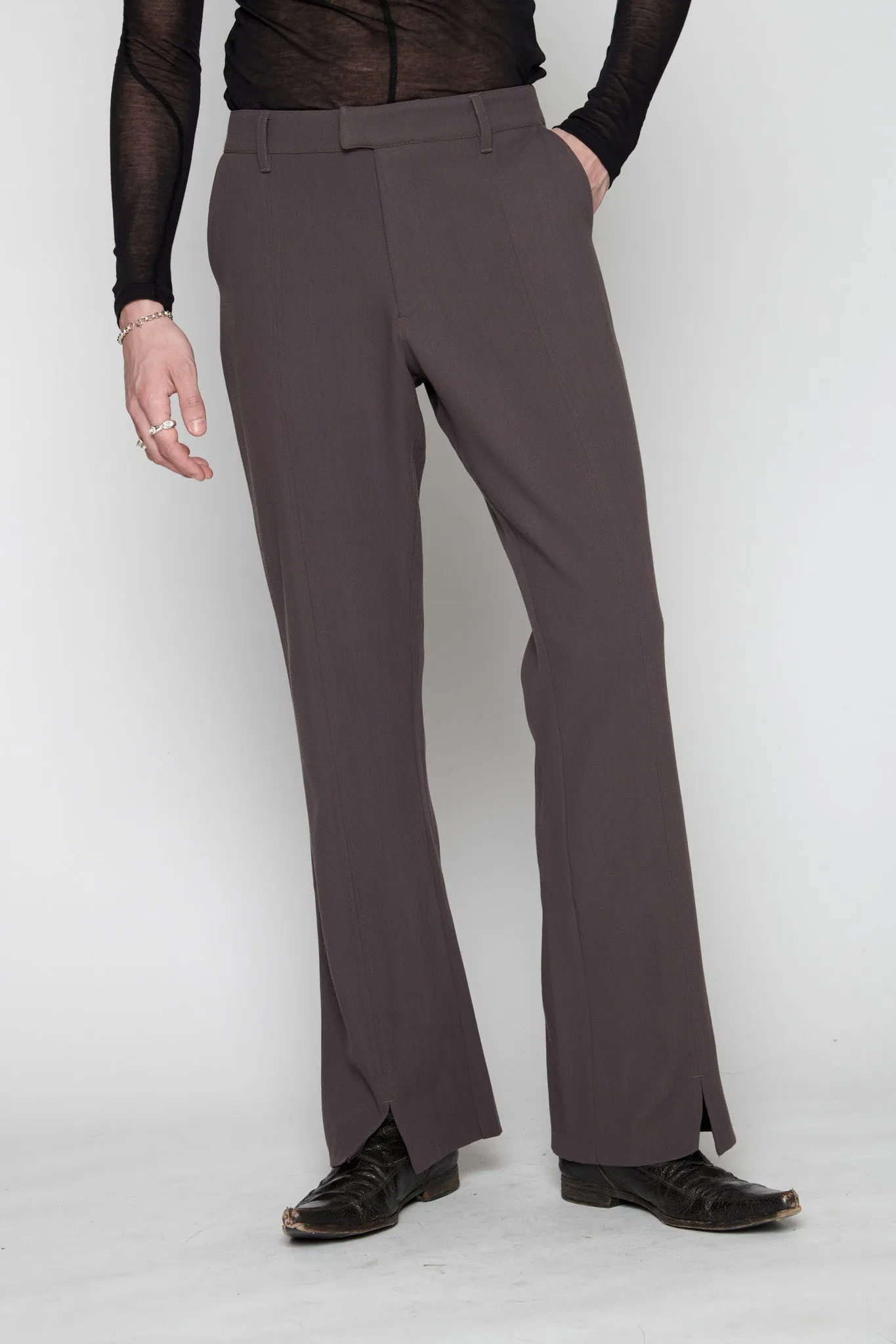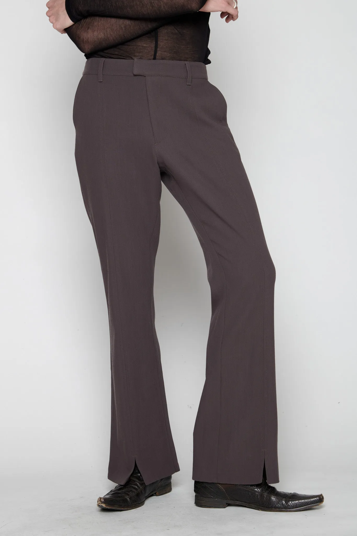 Luana is a slim-fit, mid-rise style with a subtle 70ies vibe. Classic suit codes are paired with a flared leg that finishes in a front leg slit, making this a dynamic yet classic piece. This version comes in brown wool.