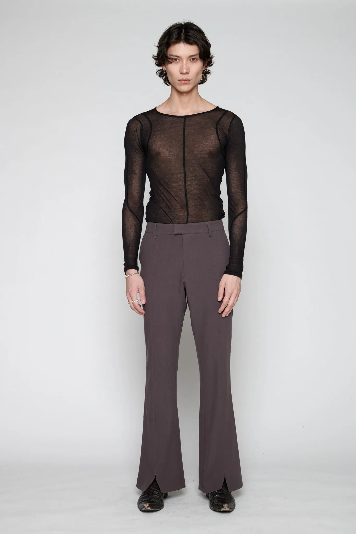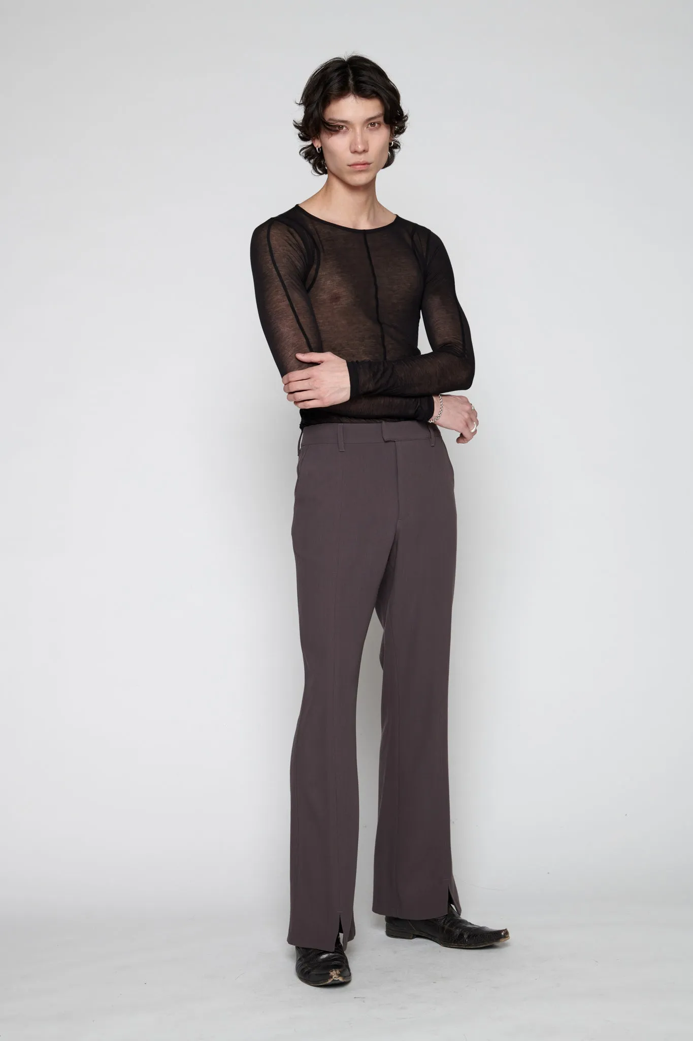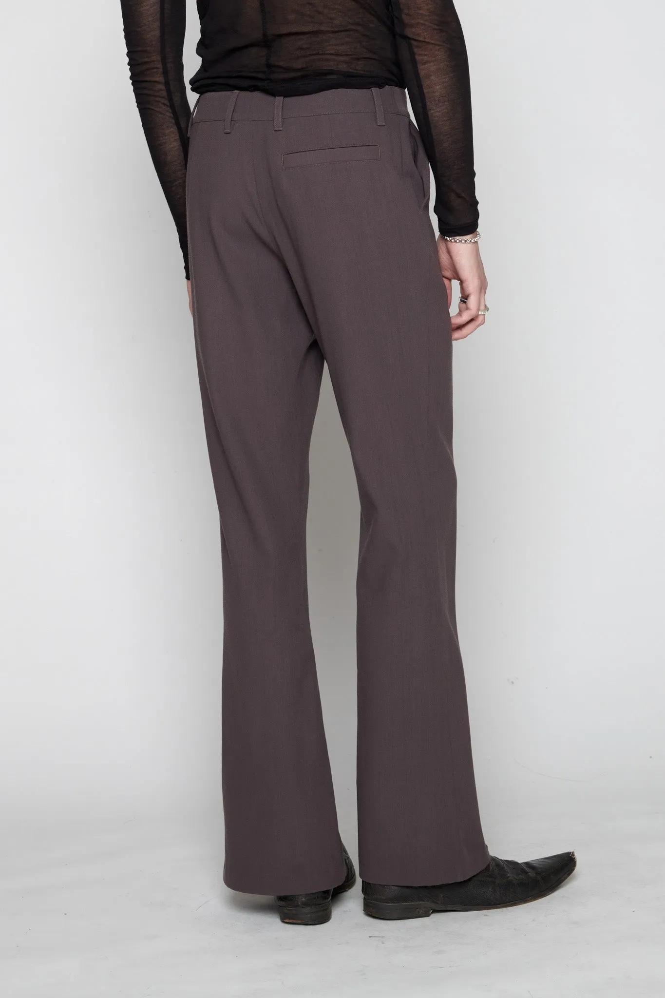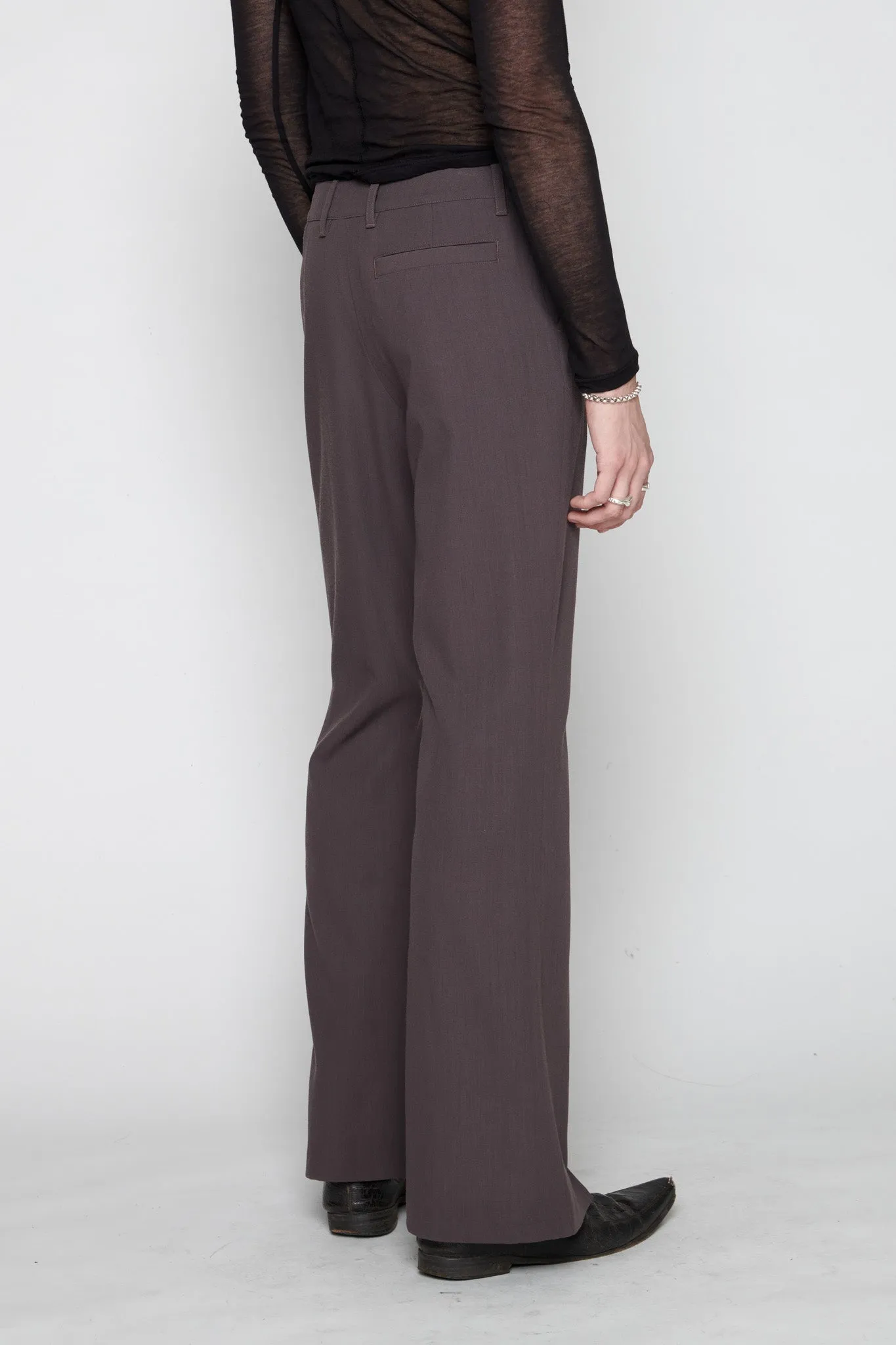 Luana is a slim-fit, mid-rise style with a subtle 70ies vibe. Classic suit codes are paired with a flared leg that finishes in a front leg slit, making this a dynamic yet classic piece. This version comes in brown wool.