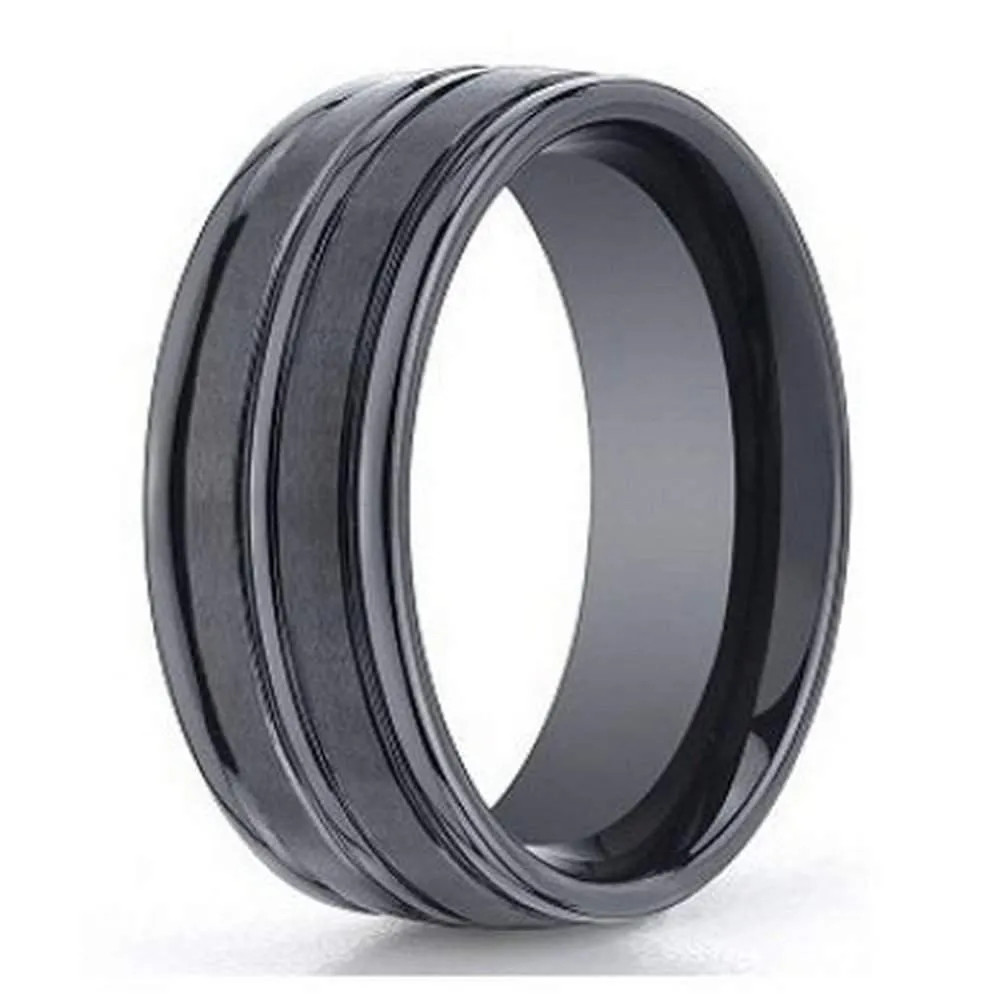 Triple polished grooves lend a designer look to this 8mm satin finished wedding band. Made from a revolutionary new material that is naturally black, this attractive men's seranite wedding ring will not scratch, tarnish or fade. Simply stunning! Comfort fit rings usually measure 1/2 size smaller due to the additional metal inside the ring. We recommend having your finger measured for a comfort fit ring at your local jewelry store.