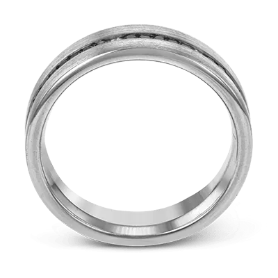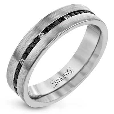 This modern wedding band in brushed gold features black diamonds highlighted by white diamond accents.