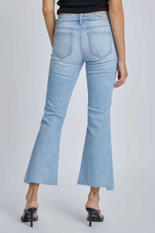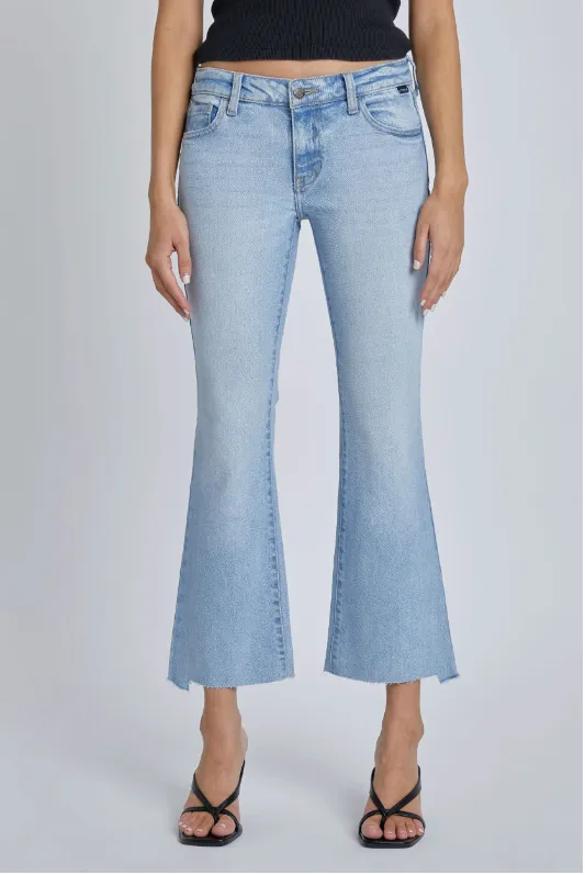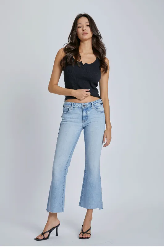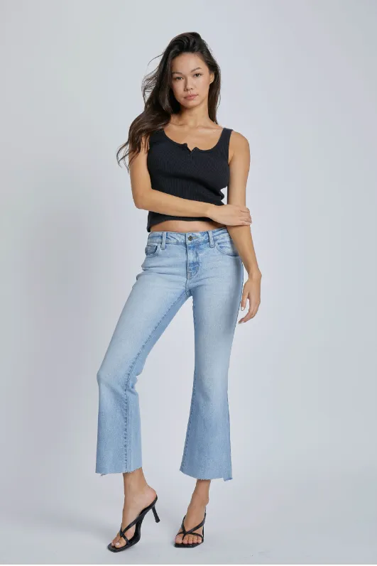 The Mid Rise Crop Flare is designed with a flattering mid-rise cut that sits comfortably around the hips. The slim fit through the waist and thighs, along with the wide leg opening, helps to create a balanced silhouette that elongates the legs and accentuates your natural shape.These jeans are not just about style, they're also about comfort. Made from premium quality fabric that offers just the right amount of stretch, they provide a fit that's both comfortable and flattering. Whether you're running errands, meeting friends for coffee, or dressing up for a casual dinner, these jeans ensure that you always feel good and look great.One of the unique features of these jeans is their cropped length, which adds a modern twist to the classic bootcut style. This design detail pairs perfectly with your favorite heels or ankle boots, allowing you to show off your footwear while adding an element of chic sophistication to your look.