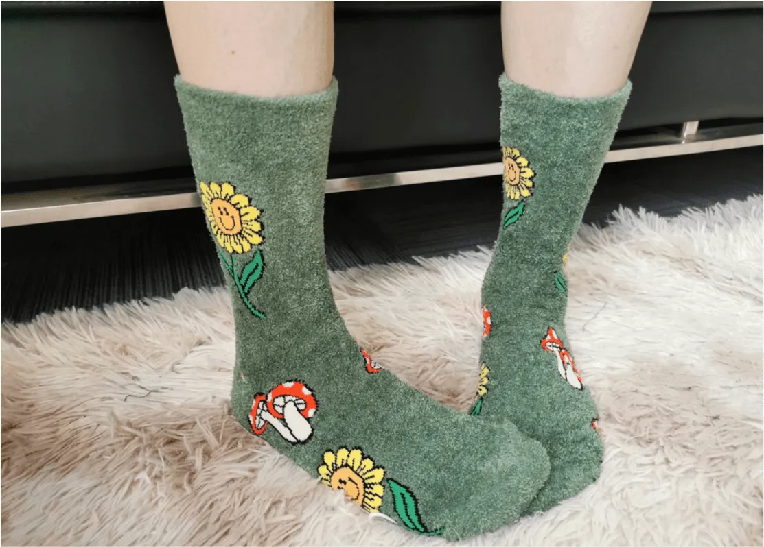 Our design captures the enchantment of the outdoors, bringing it to your feet with vibrant sunflower blooms and adorable mushroom motifs. Slip into these fuzzy socks to experience the comfort of a soft, warm hug for your feet while embracing the magic of nature's colors and charm.