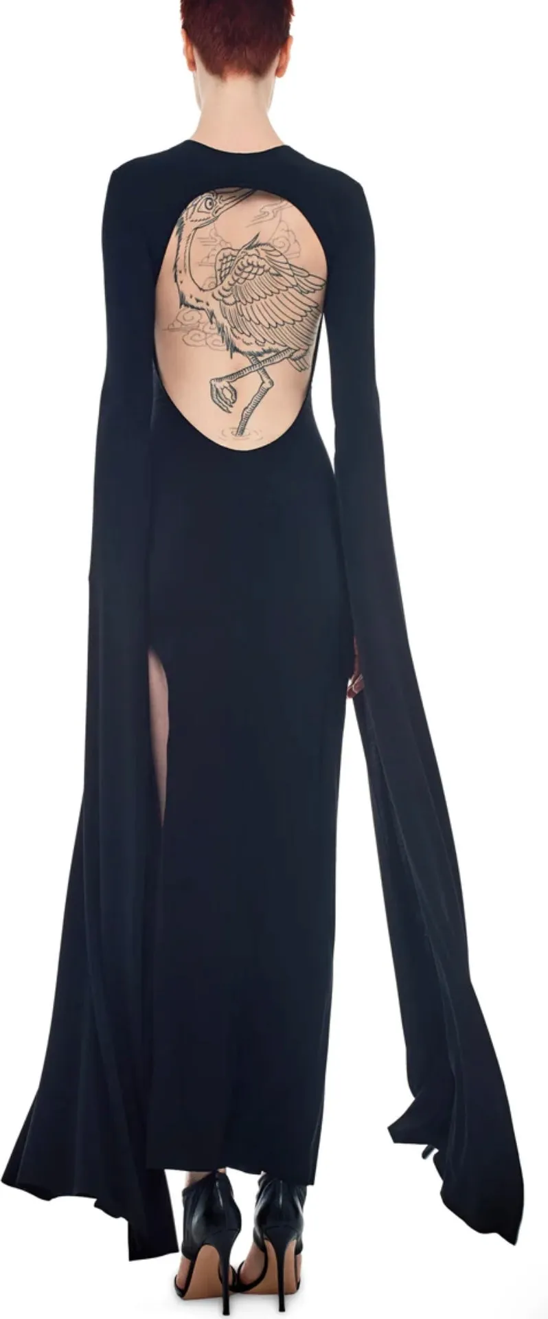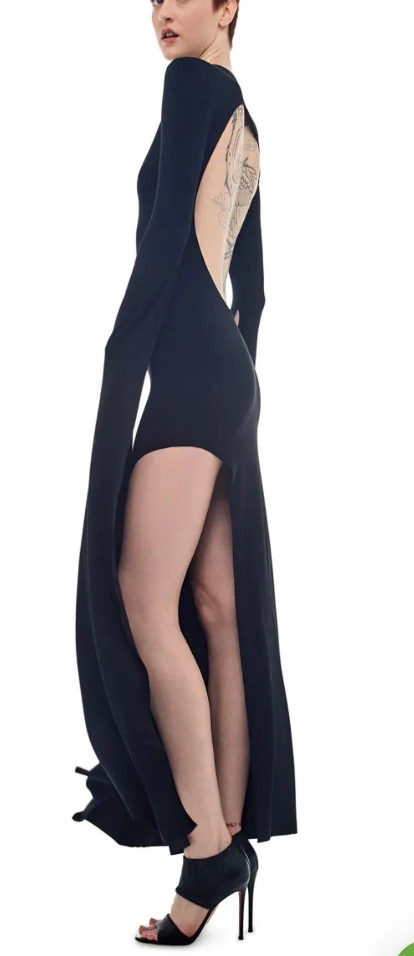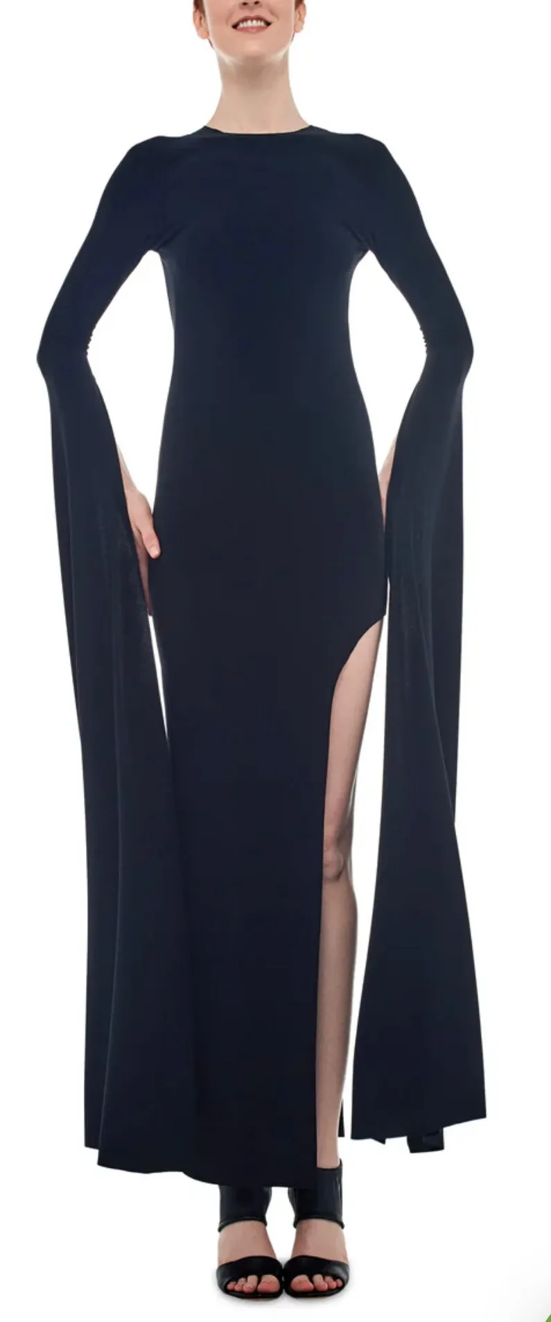 Description: Expertly designed for any black tie event or wedding, the Norma Kamali Ribbon Sleeve Wide Slit Gown is a versatile choice for any bump-friendly fashionista. Featuring unique ribbon sleeves and a flattering wide slit, this gown effortlessly combines style and comfort.