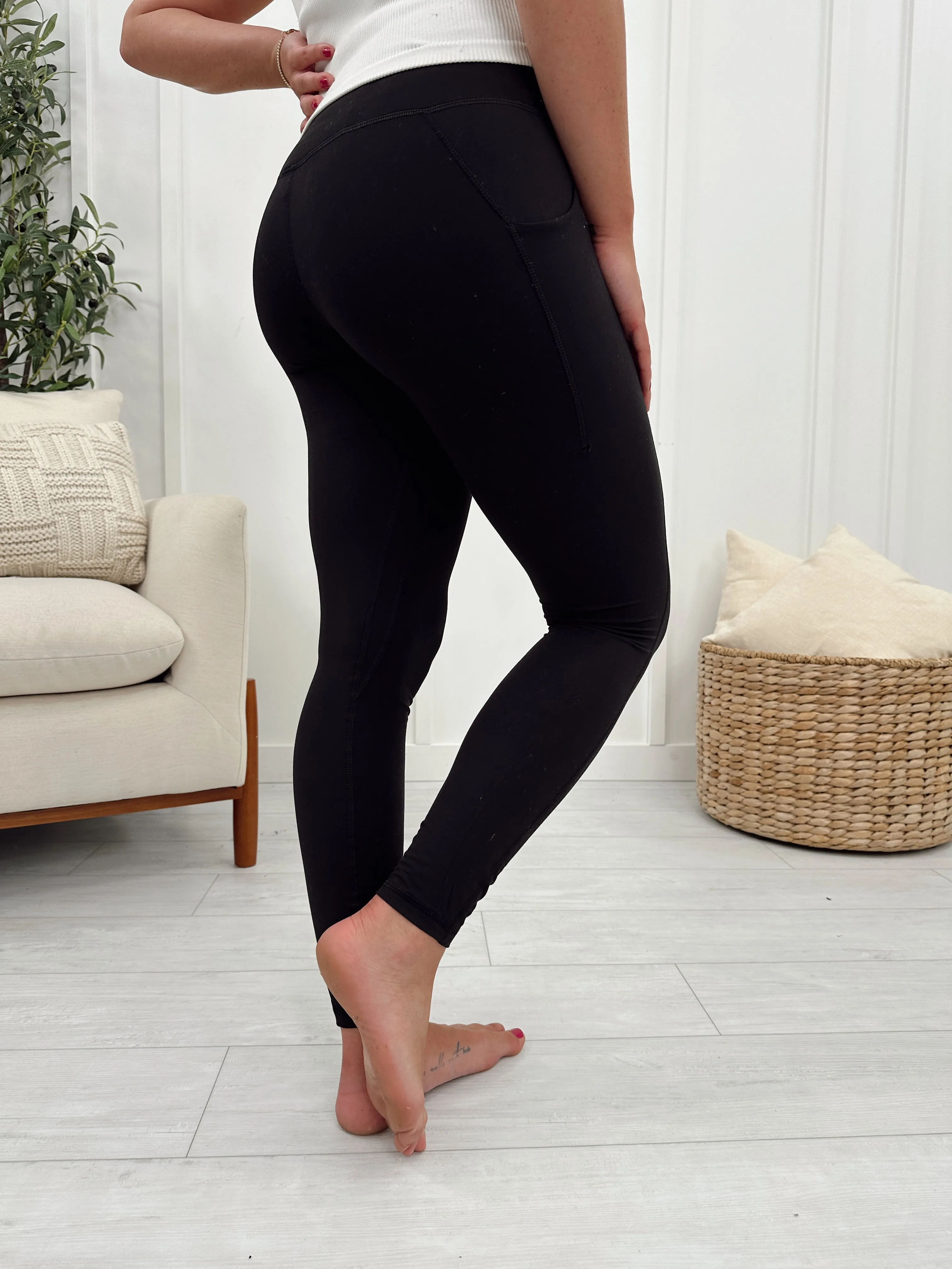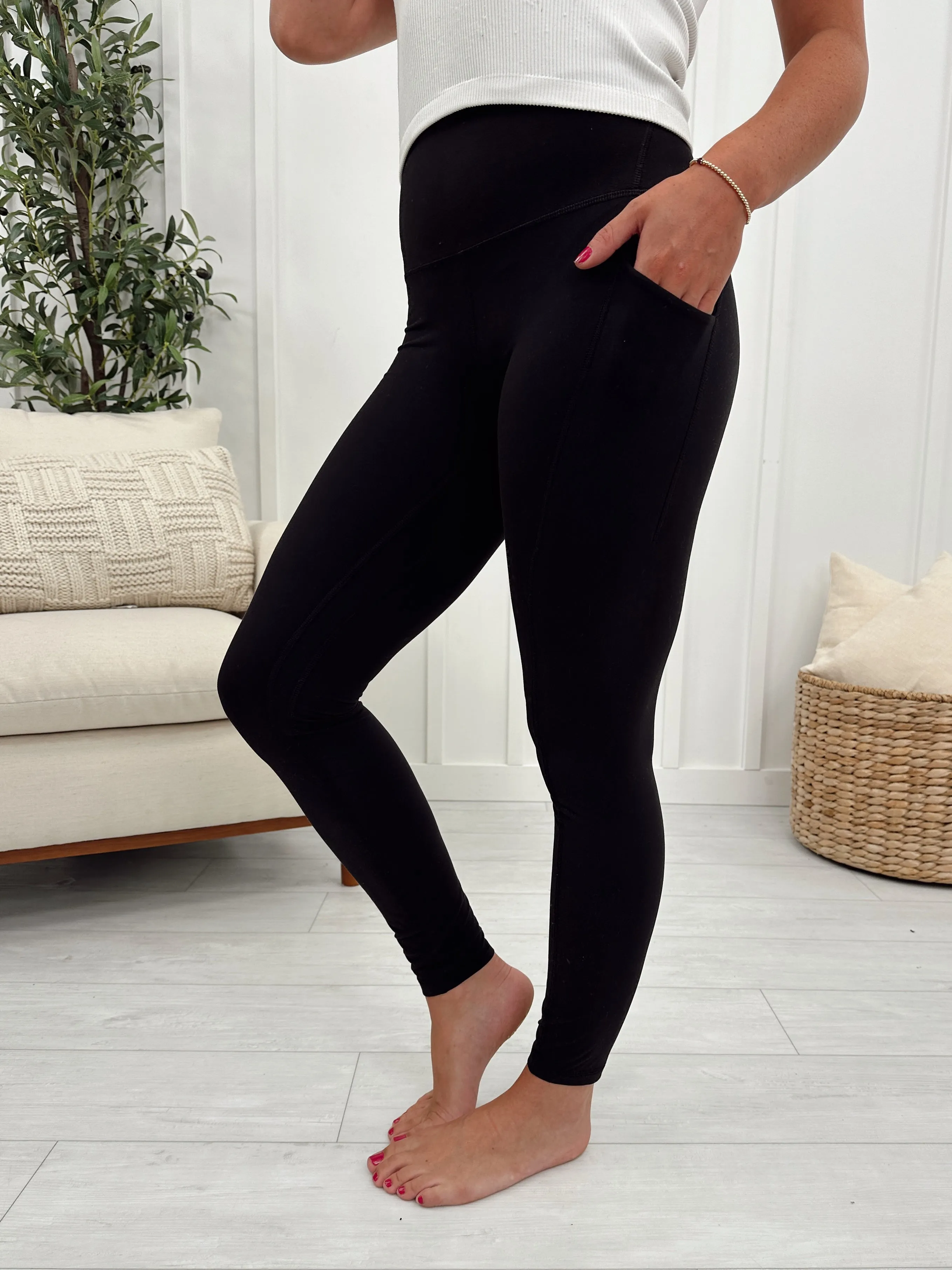 These amazing leggings are the perfect year-round bottoms with a supportive yoga waistband, pockets, and a stretchy, soft fabric that keeps you comfortable in any season. Step out in these neutral black leggings and stay cozy all day long.