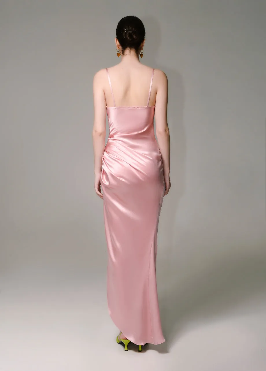 A long pink silk dress with subtle stripes, perfect for weddings, bridesmaids, or special events.