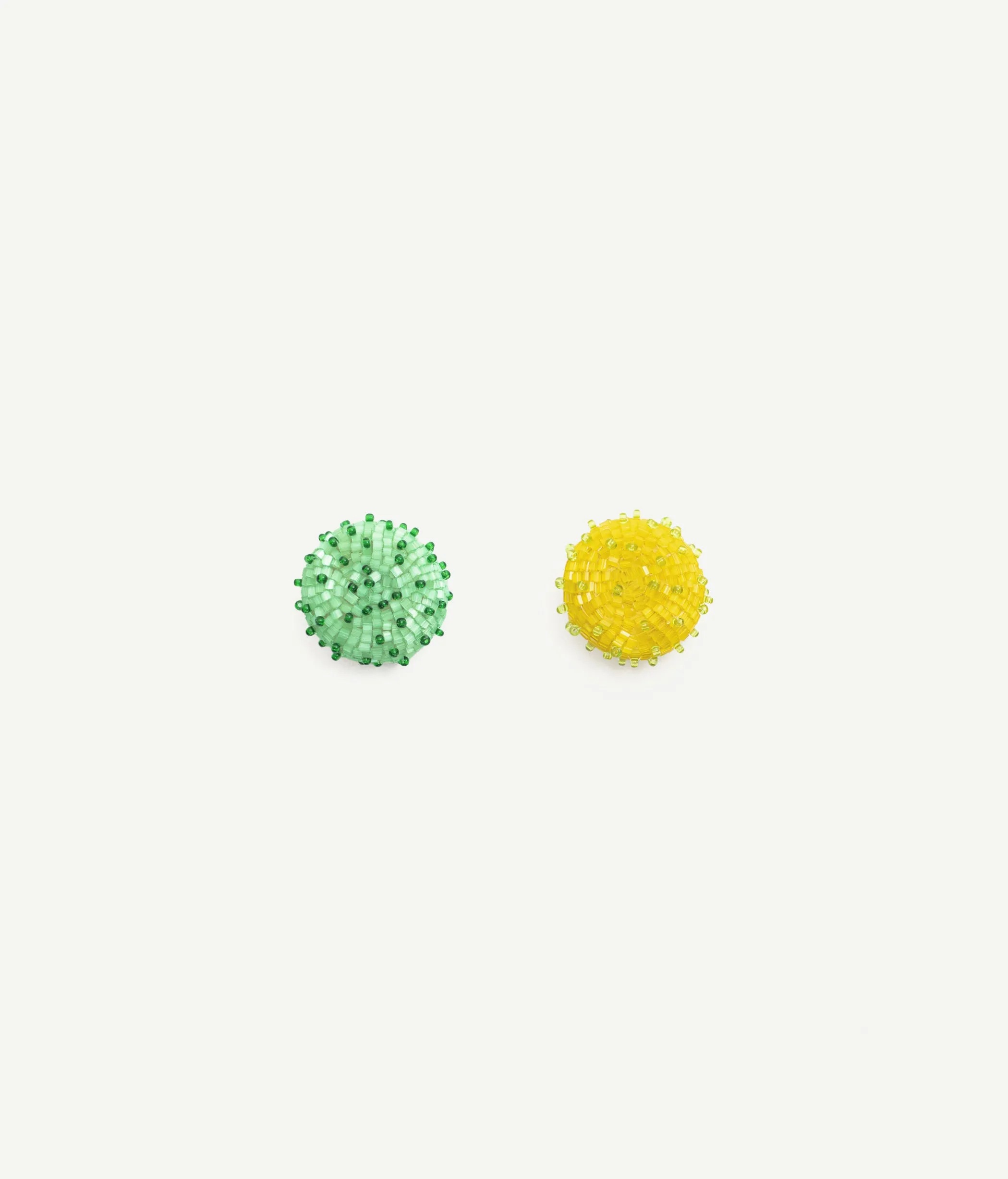 All pieces of the Ruslan Baginskiy SKARBY/TREASURES jewelry drop are crafted by hand in delicate beadwork that dances in the light. Rooted in the idea of reconnecting with our past, celebrating cherished moments, and embracing the timeless beauty of nature. Silver stud fastening for pierced ears. Yellow and Mint Beaded Earrings.