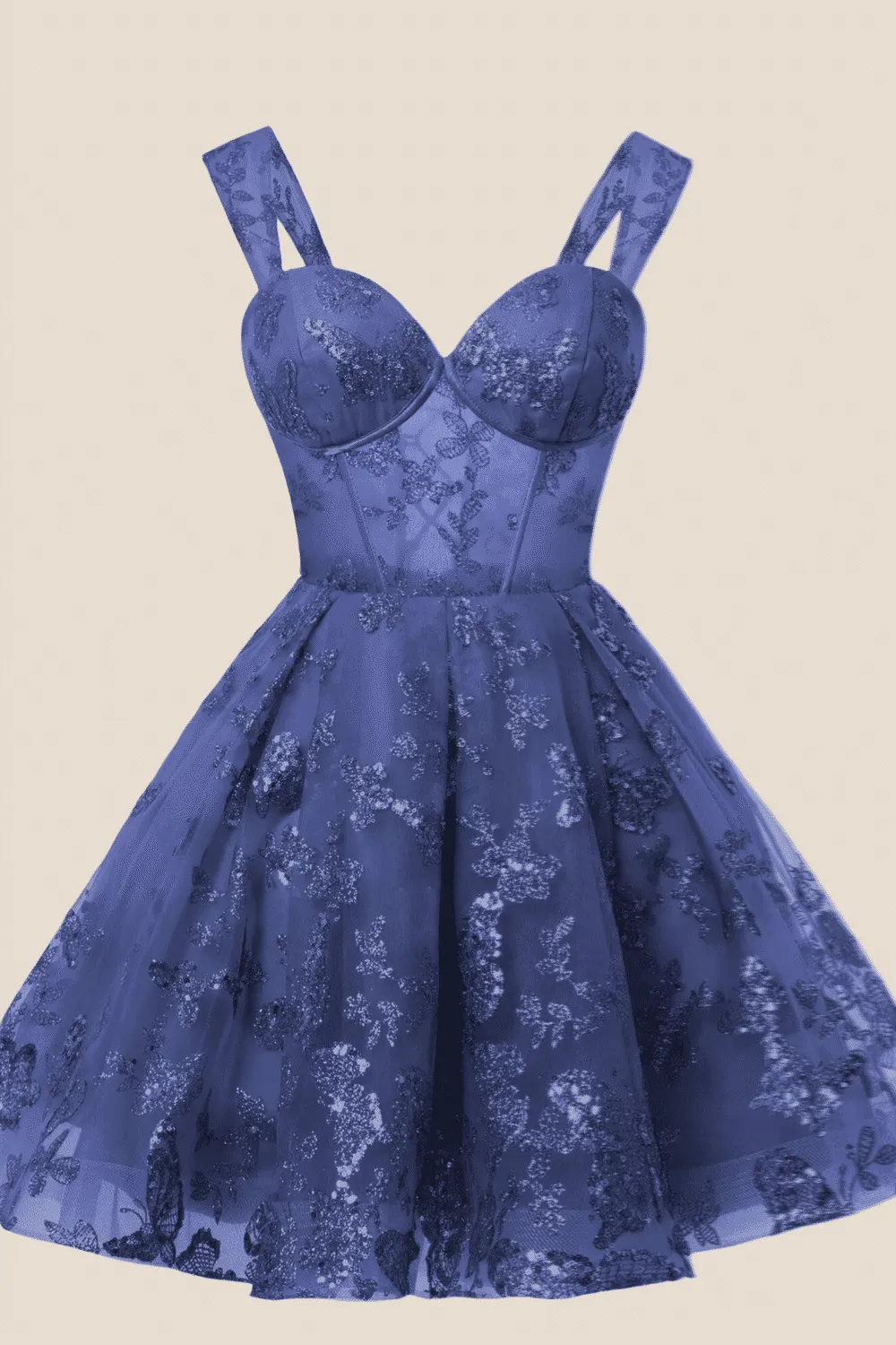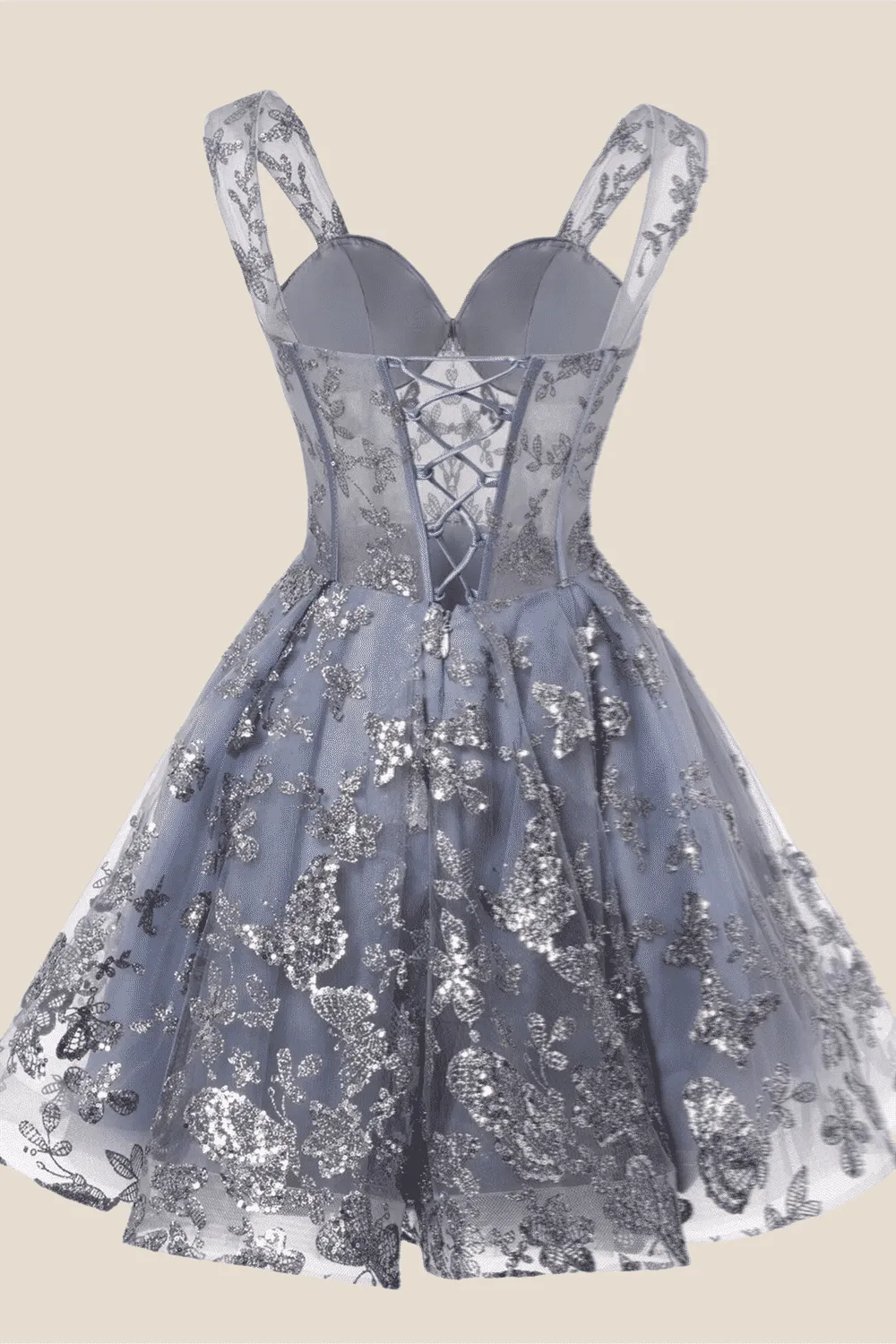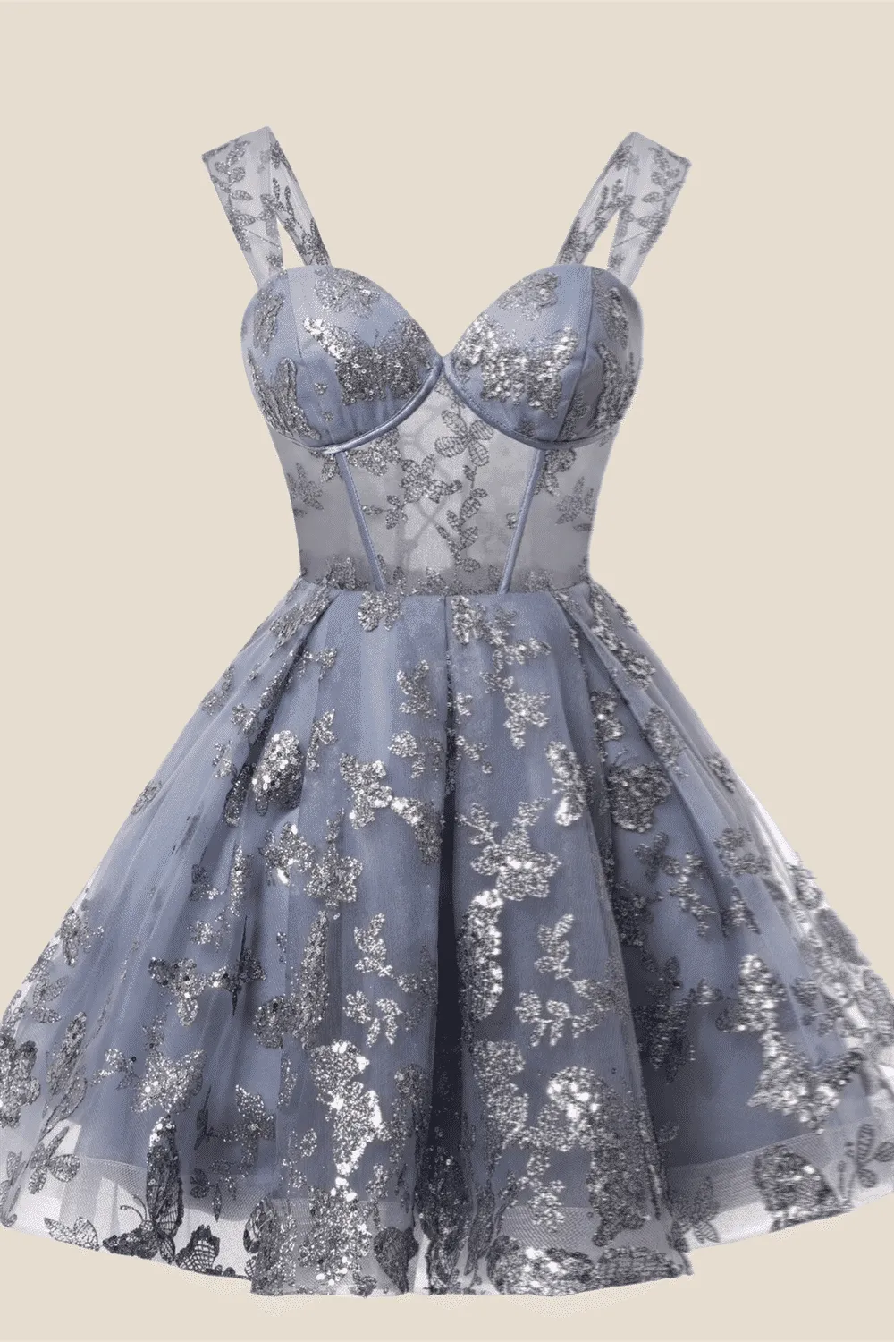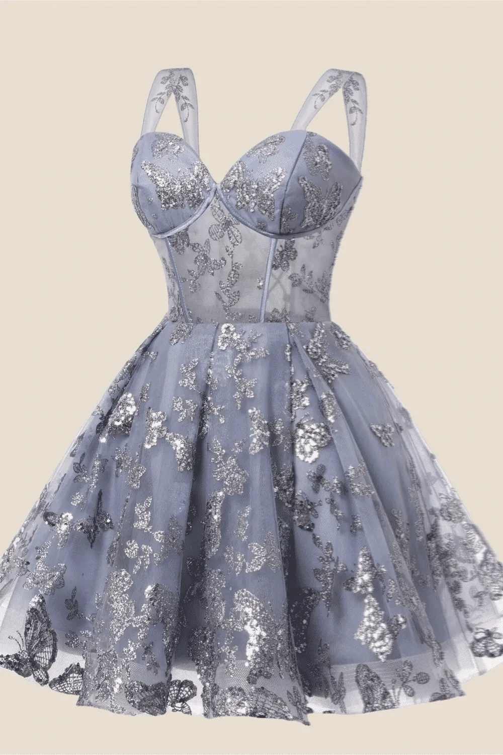 Add a touch of elegance to your wardrobe with the sweetheart grey sparkly 3D butterfly short dress. With a sheer bodice adorned with sparkly 3D butterflies and a flattering A-line silhouette, this dress is perfect for any occasion. The lace-up back adds a delicate detail, while the built-in bra provides support and comfort.