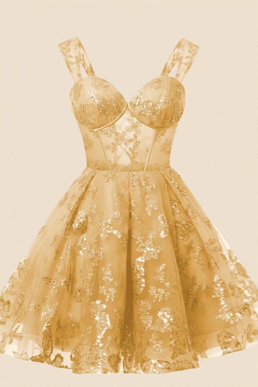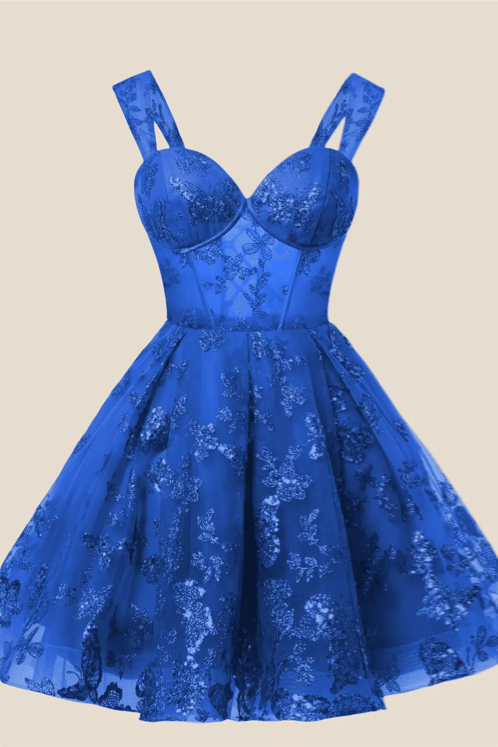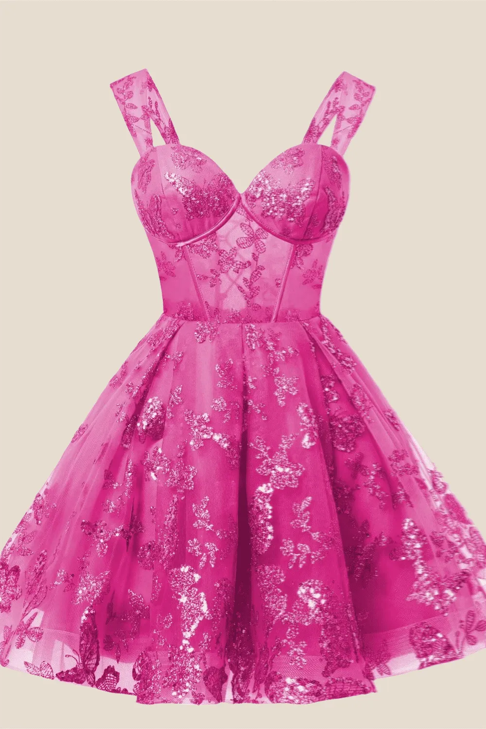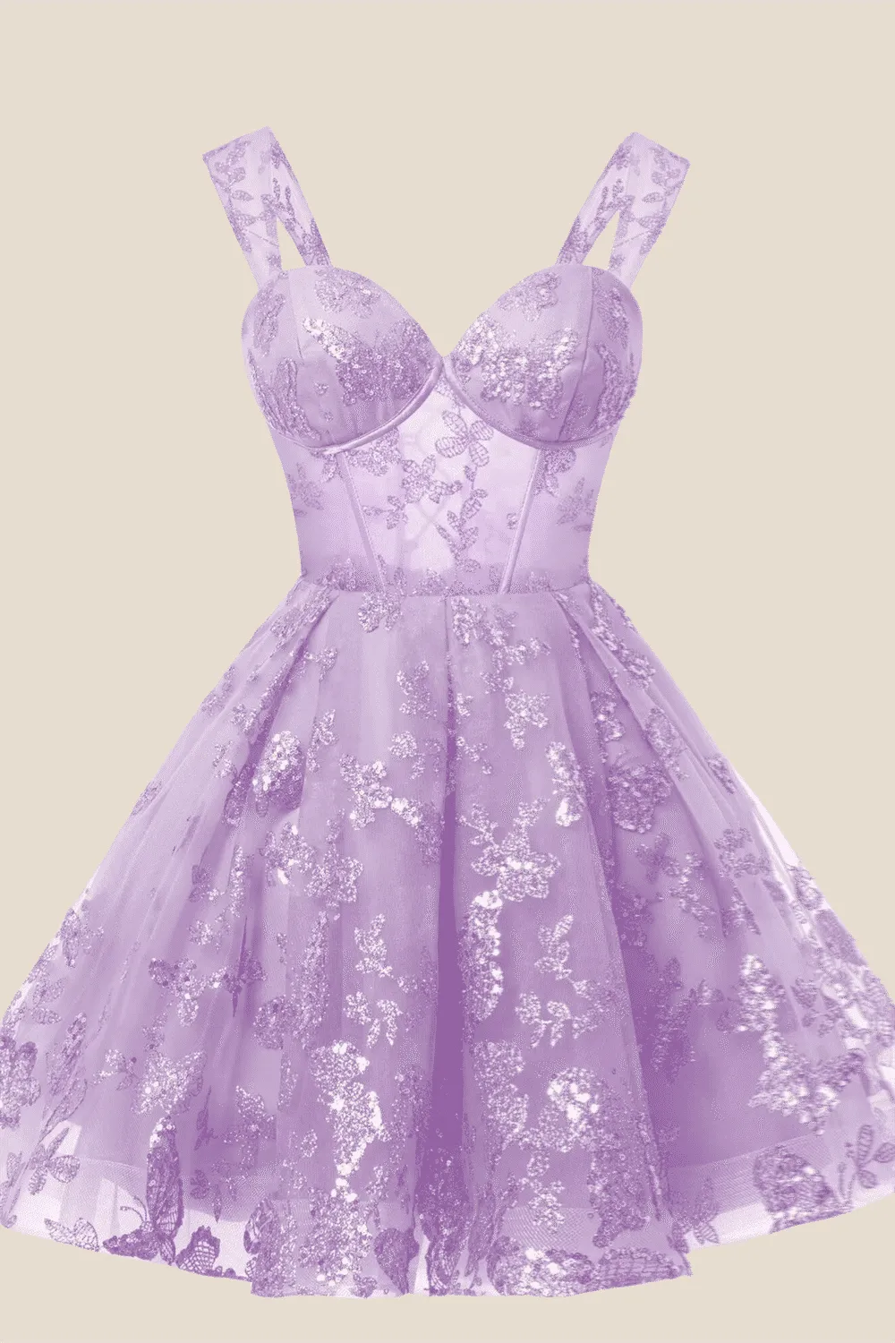 Add a touch of elegance to your wardrobe with the sweetheart grey sparkly 3D butterfly short dress. With a sheer bodice adorned with sparkly 3D butterflies and a flattering A-line silhouette, this dress is perfect for any occasion. The lace-up back adds a delicate detail, while the built-in bra provides support and comfort.