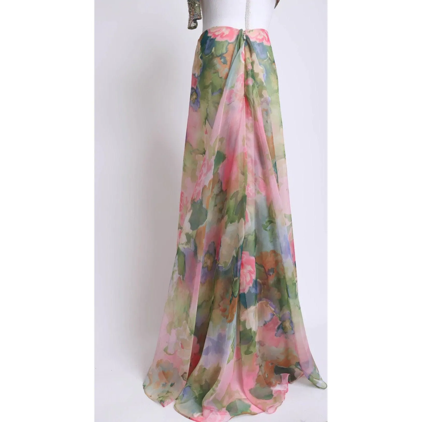 - Floral skirt fabric is a polyester chiffon, lined in a blush chiffon and features a side zipper.