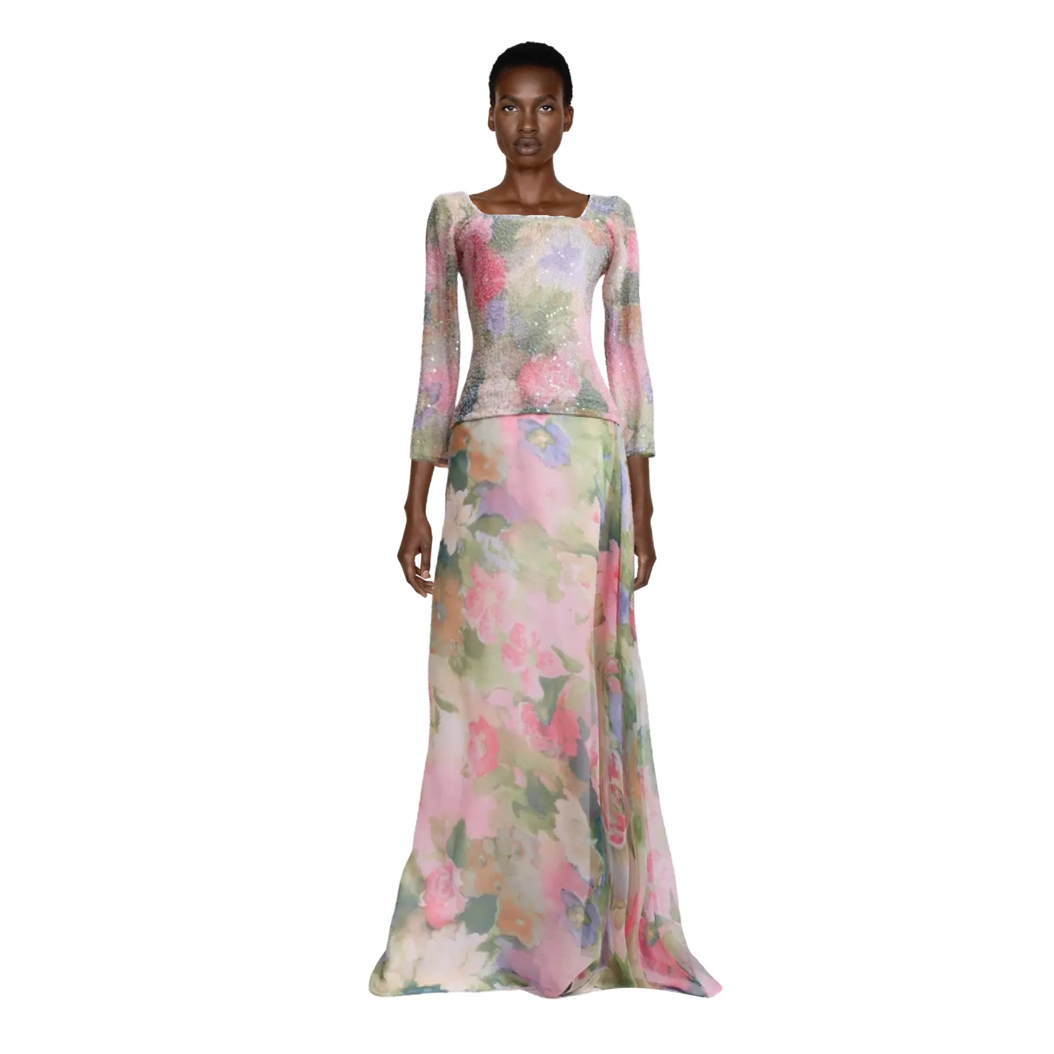 - Top is a fully lined, stretchy, mesh floral fabric in the same pattern as the skirt, adorned with sequins and beads.