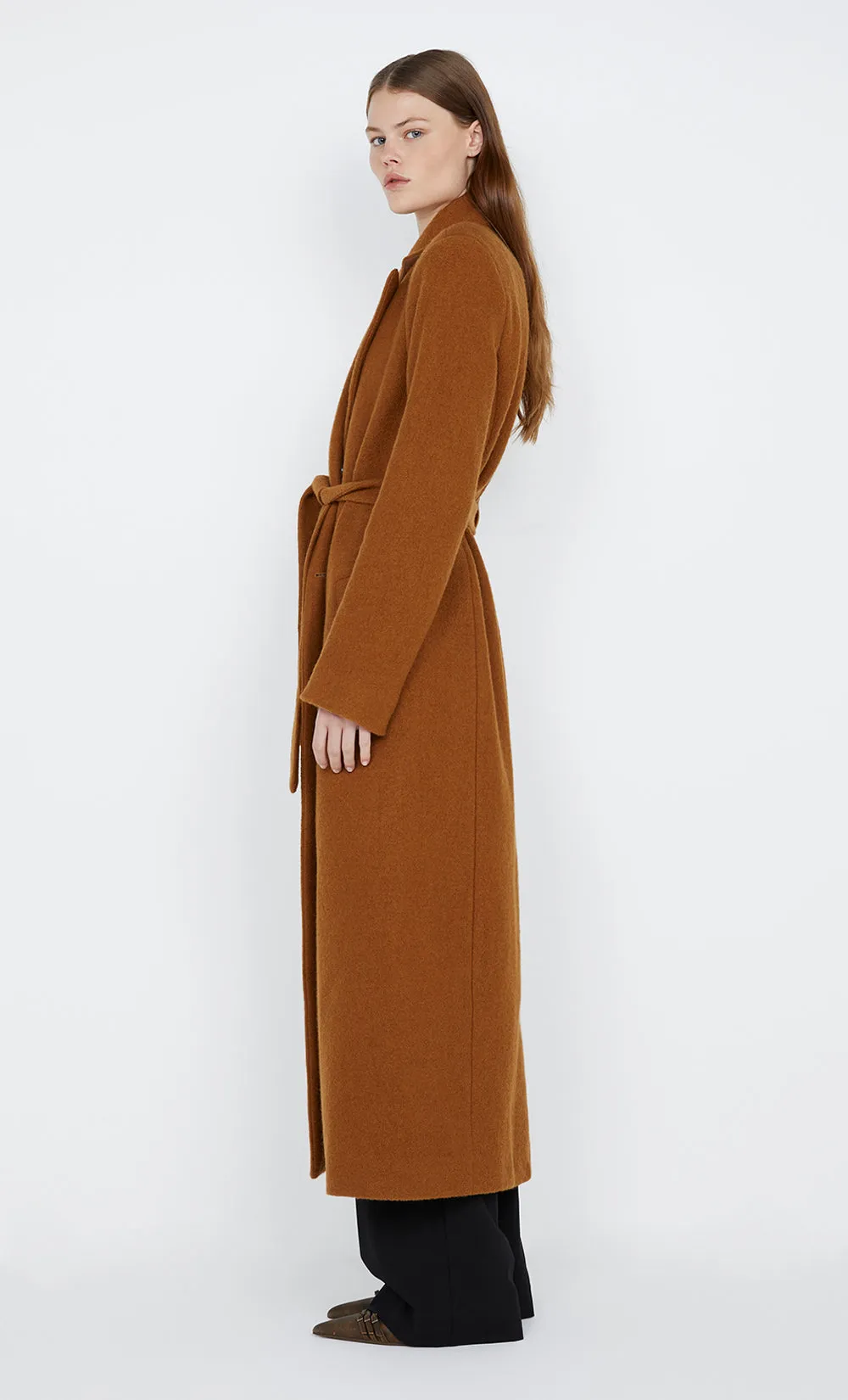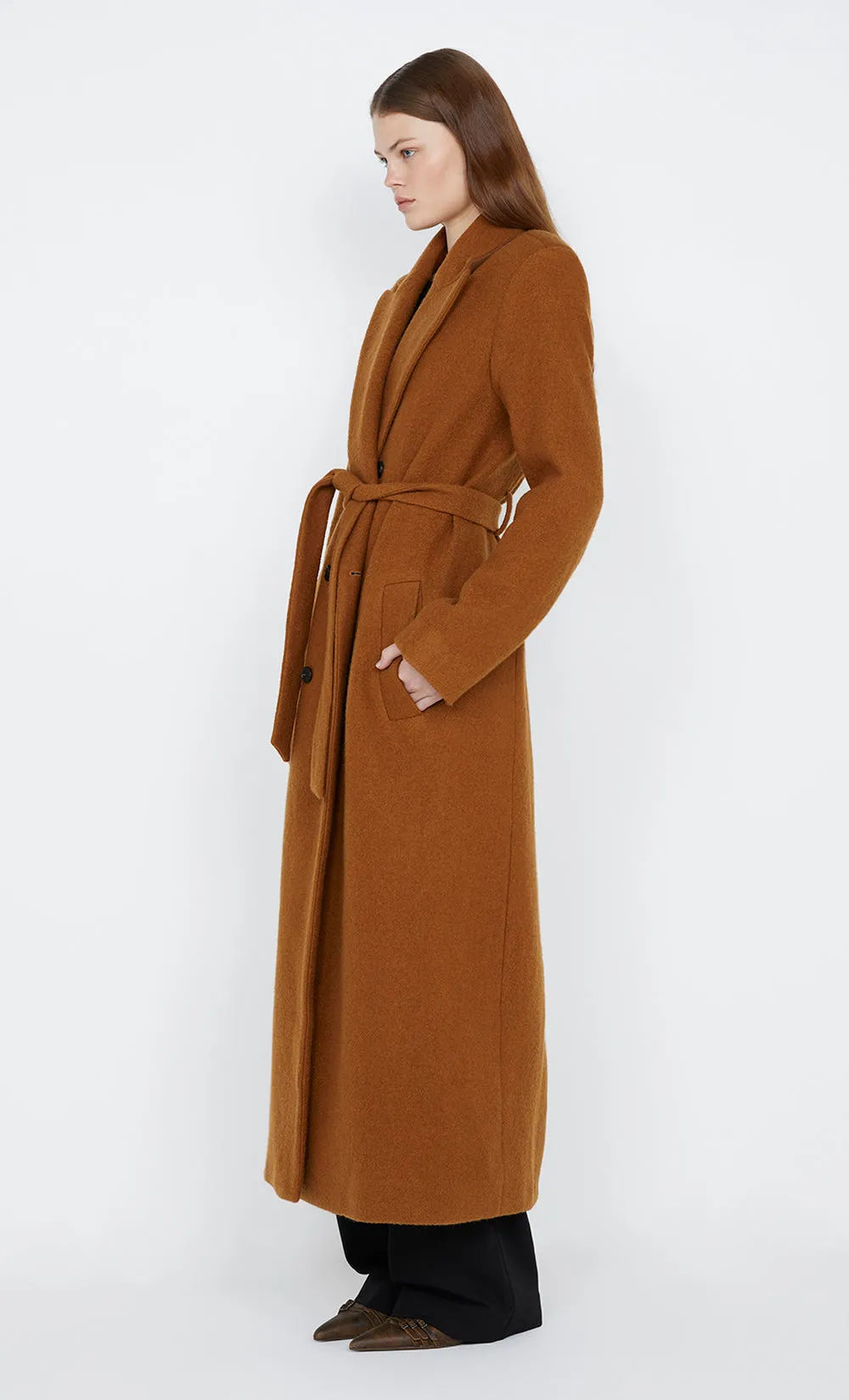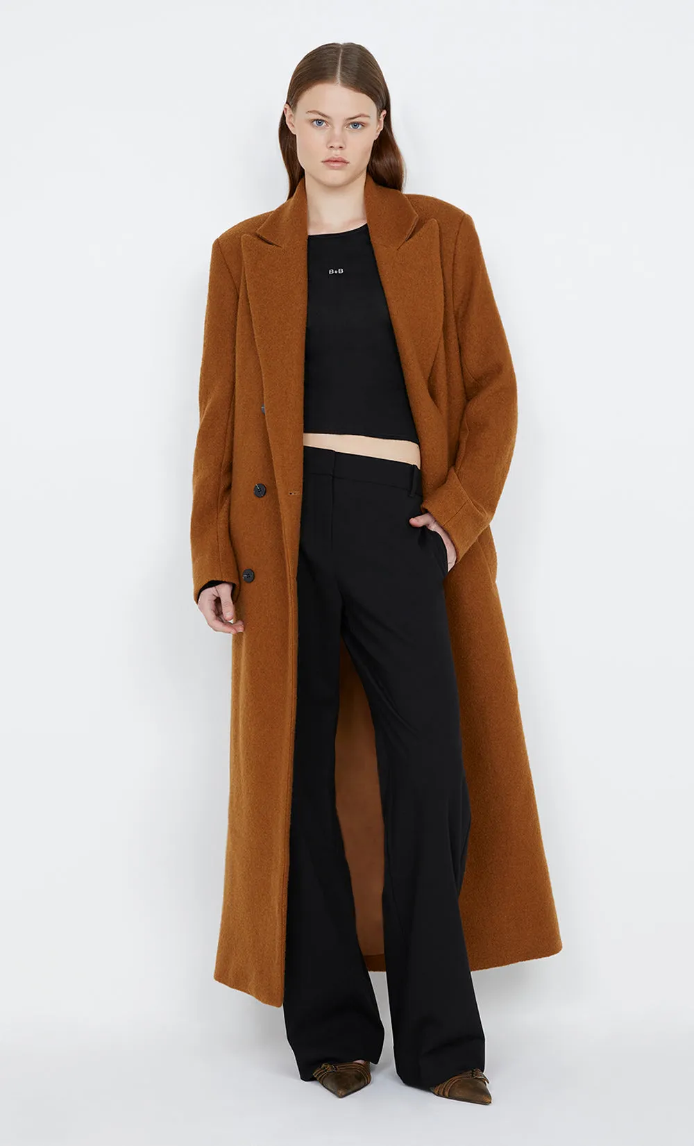 The BEC BRIDGE Teyana Belted Coat is designed in a fitted silhouette. The coat features notch lapel details, an oversized double breasted design, relaxed drops shoulders, side pockets, six button closure and a removeable waist tie.