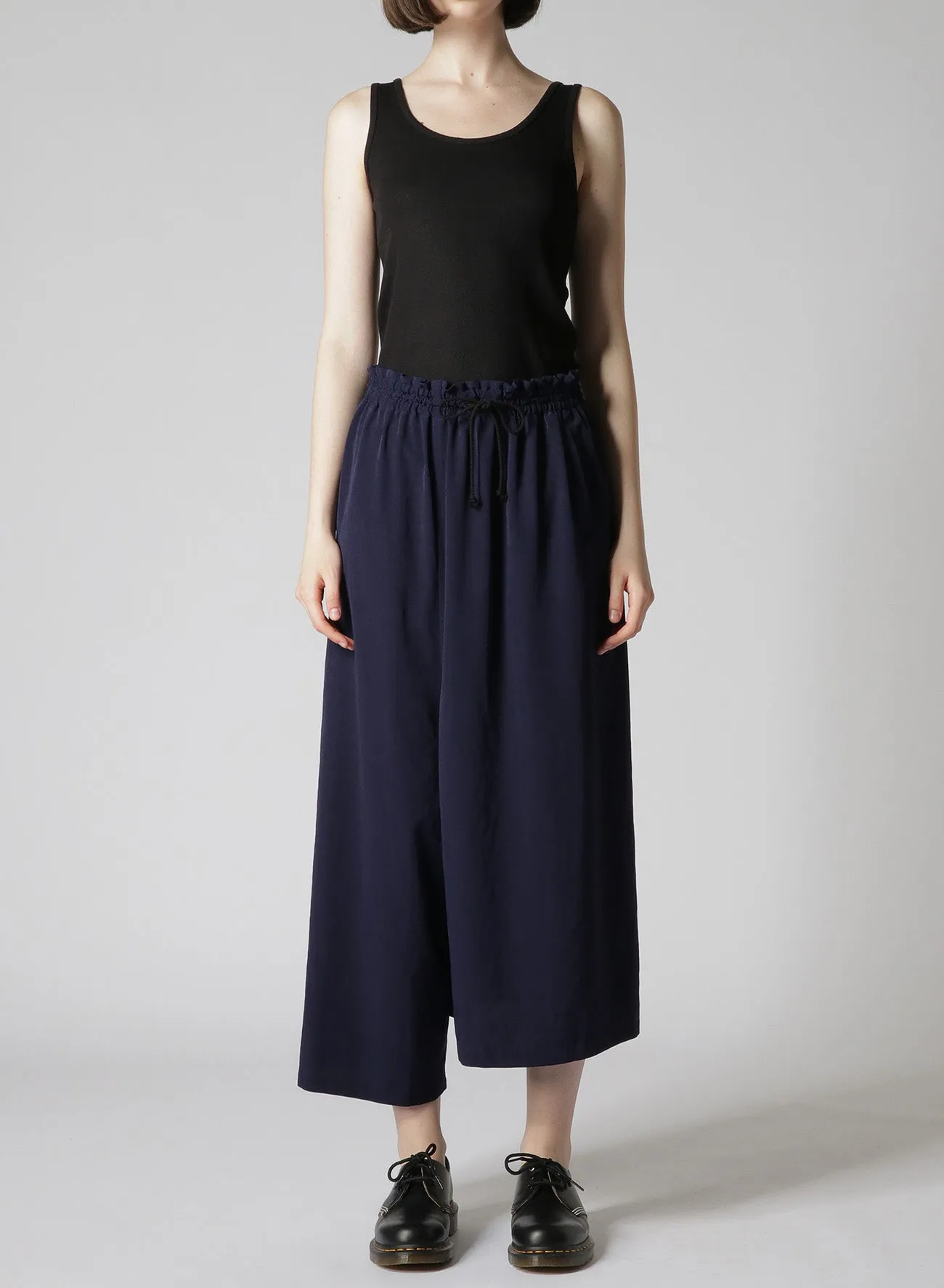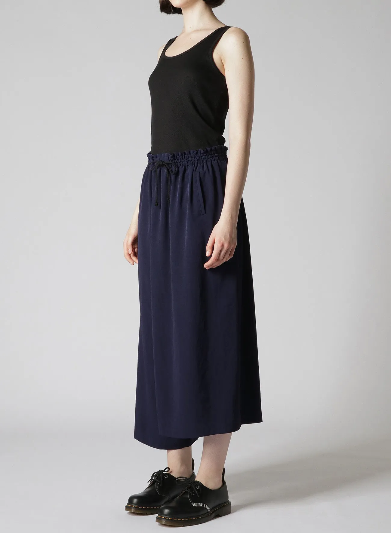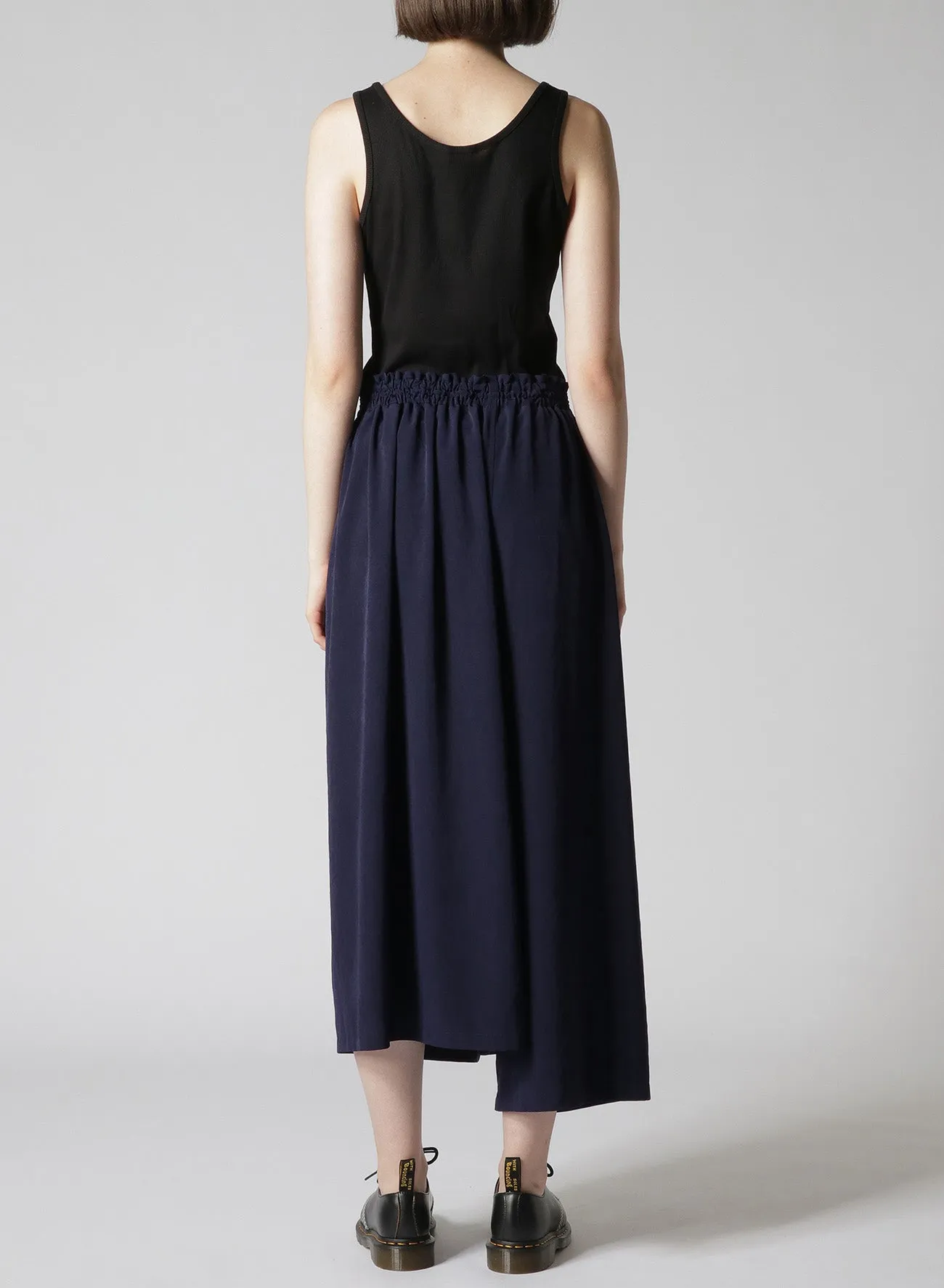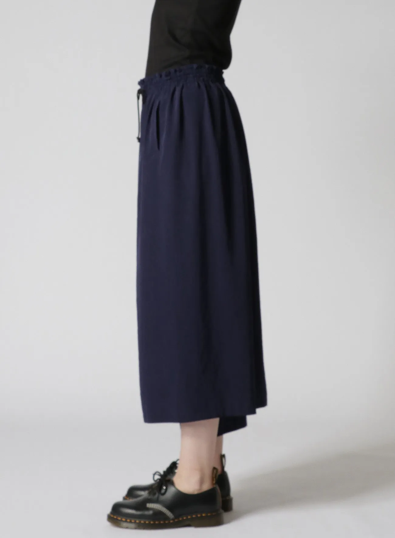 A staple of Y's, these asymmetric pleated pants utilize triacetate/polyester crepe de Chine. Despite being lightweight, they are non-sheer, boast a soft sheen, and offer excellent drapery. They are also wrinkle-resistant, ensuring easy maintenance. The waist is equipped with elastic and a drawstring for optimal comfort.