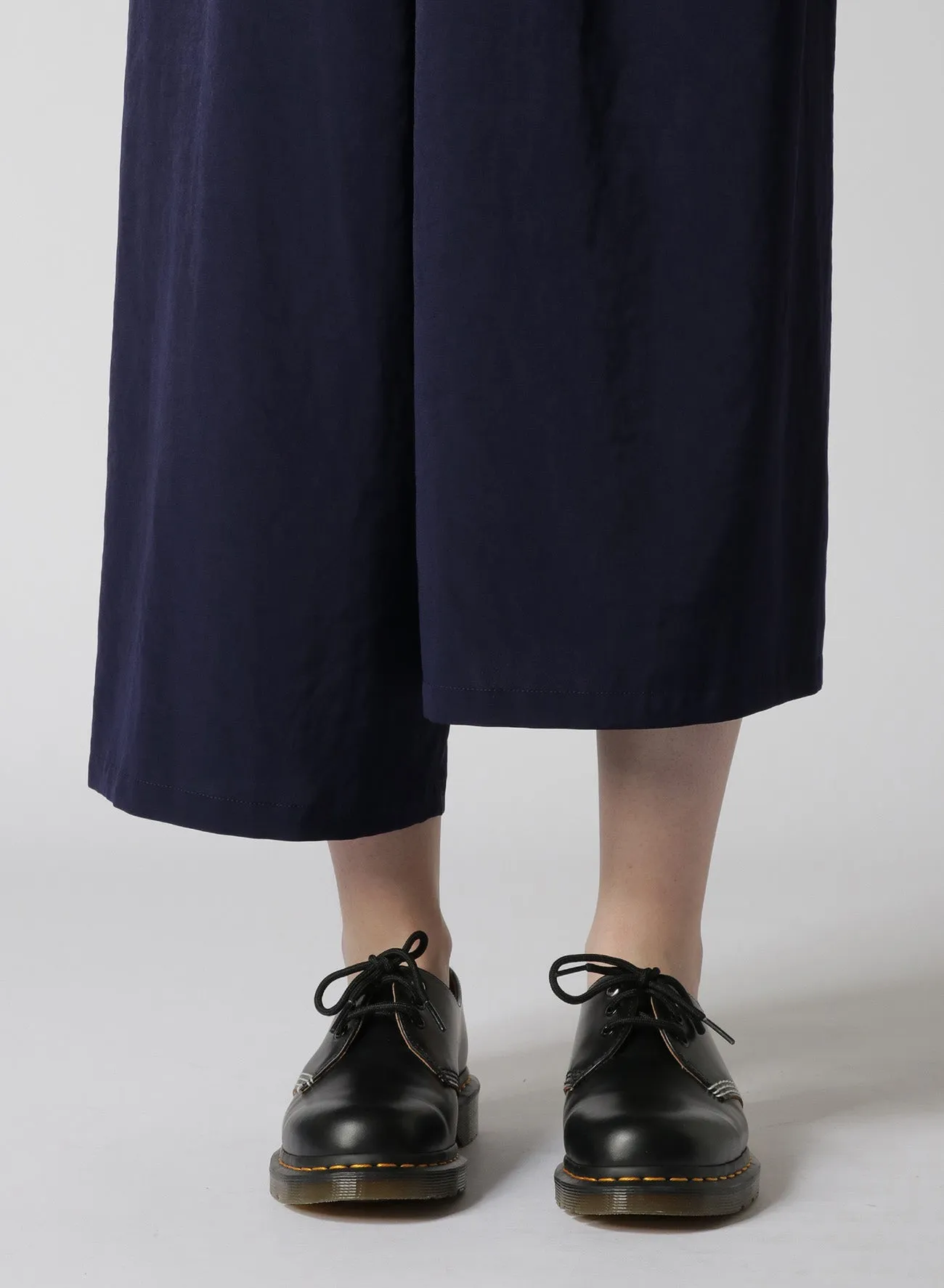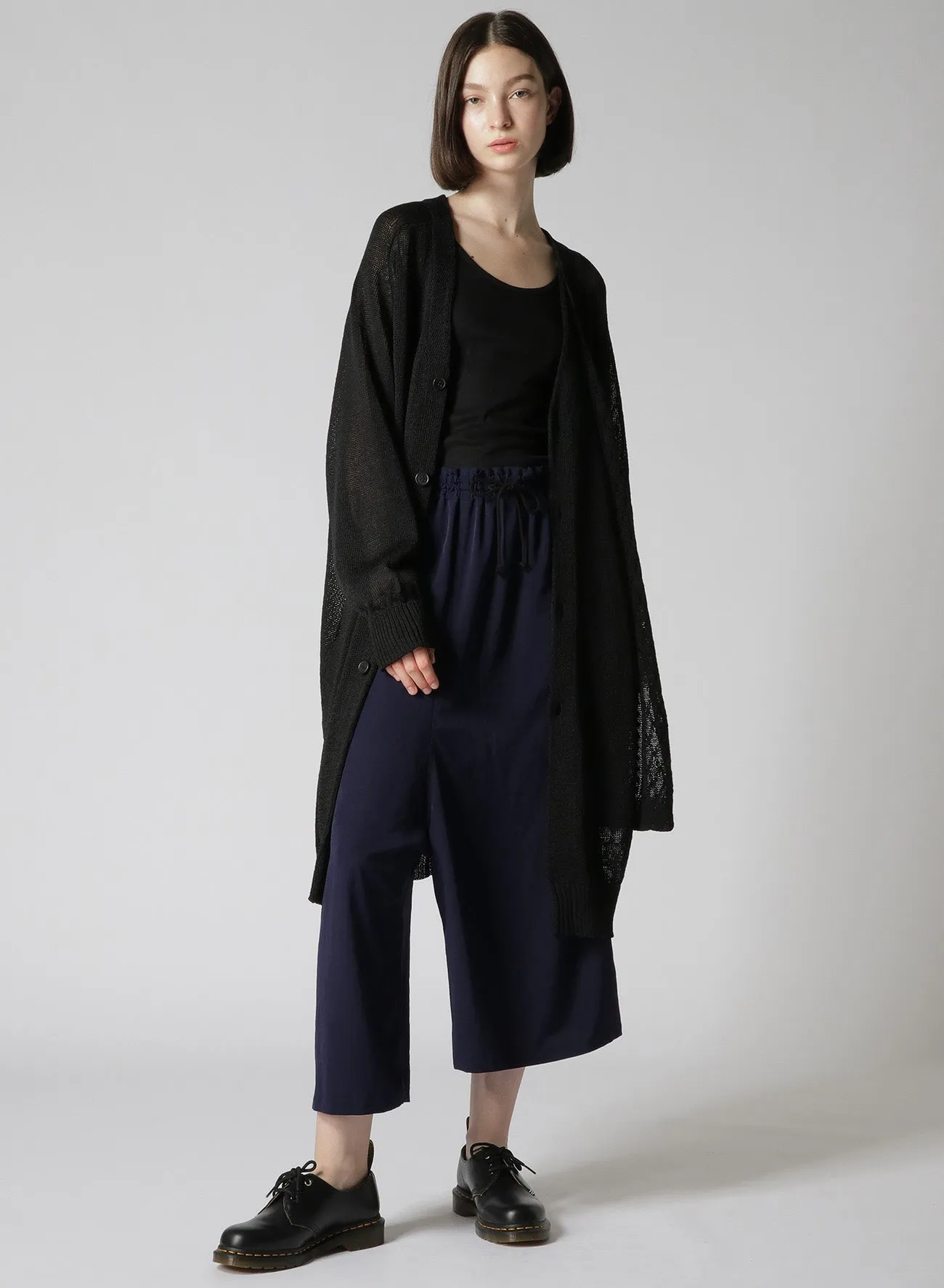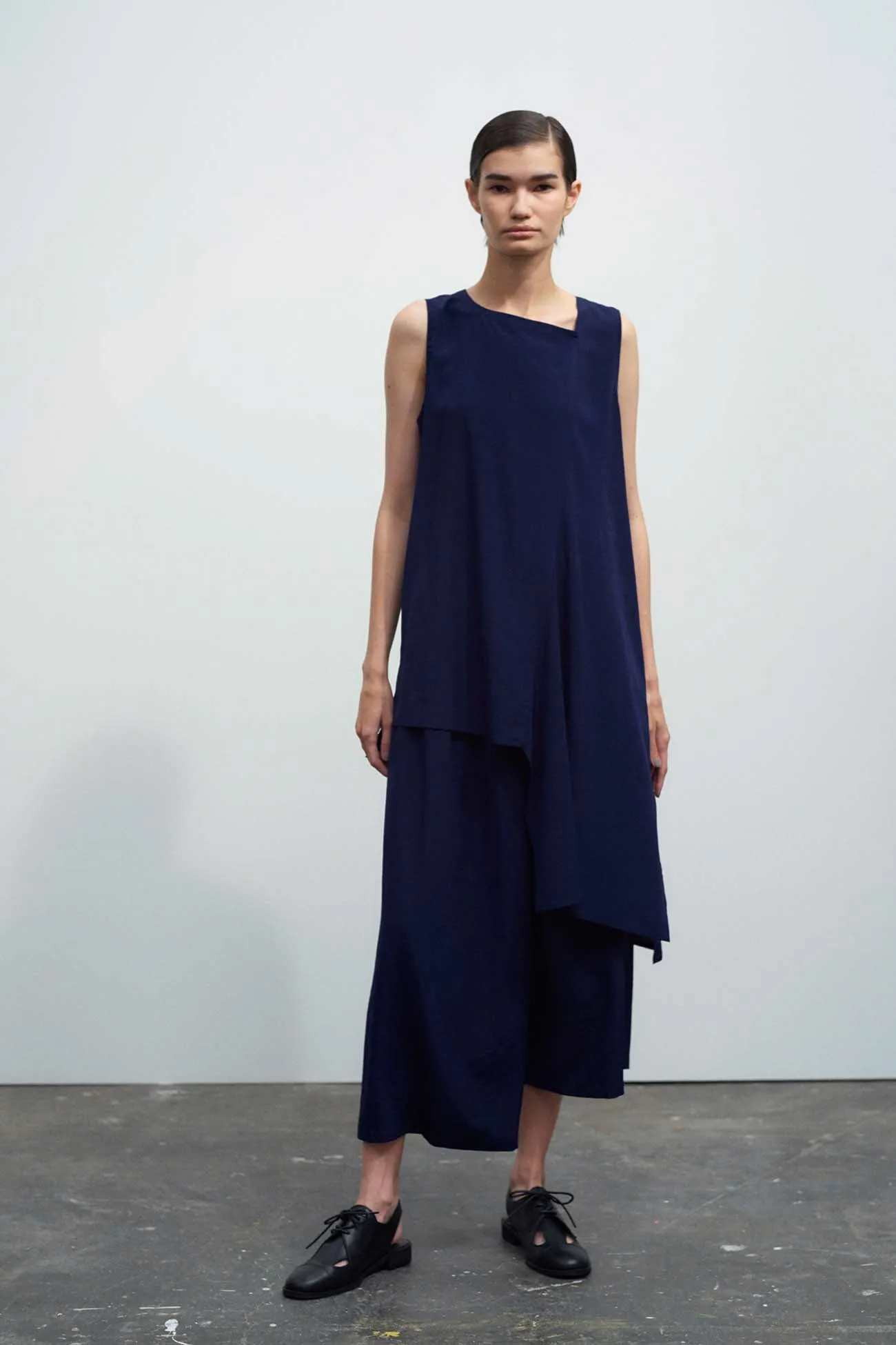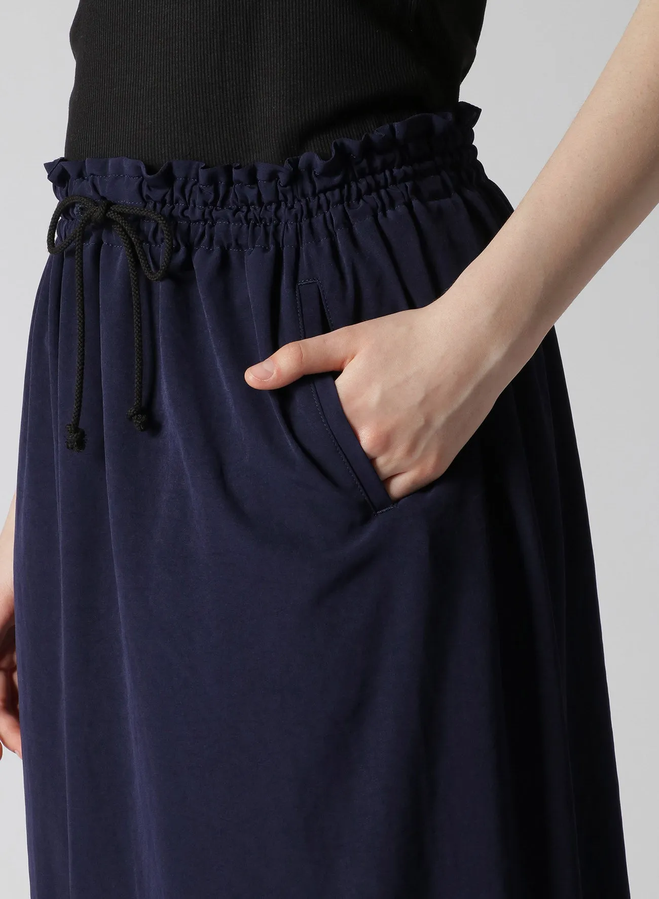 A staple of Y's, these asymmetric pleated pants utilize triacetate/polyester crepe de Chine. Despite being lightweight, they are non-sheer, boast a soft sheen, and offer excellent drapery. They are also wrinkle-resistant, ensuring easy maintenance. The waist is equipped with elastic and a drawstring for optimal comfort.