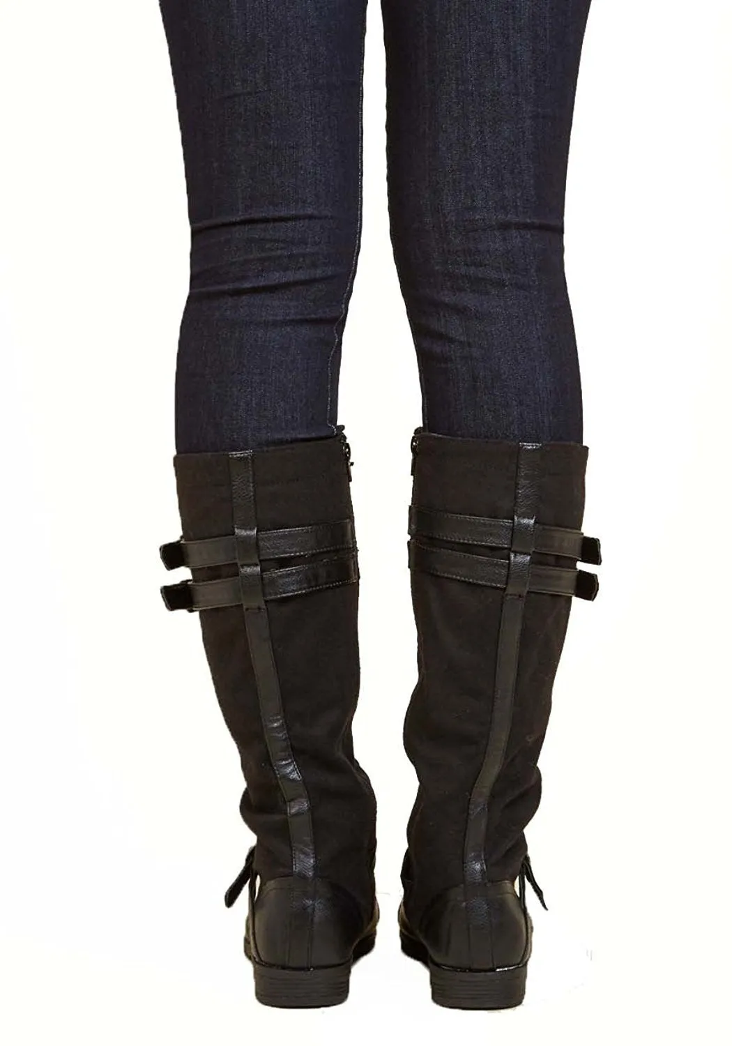 These boots are mid calf length, depending on personal height. They have a vintage silhouette; featuring a faux wool shaft with a combination of vegan leather strap adjustable buckles. It is lace up design with an inner side adjustable zipper. Finished with a cap-toe.