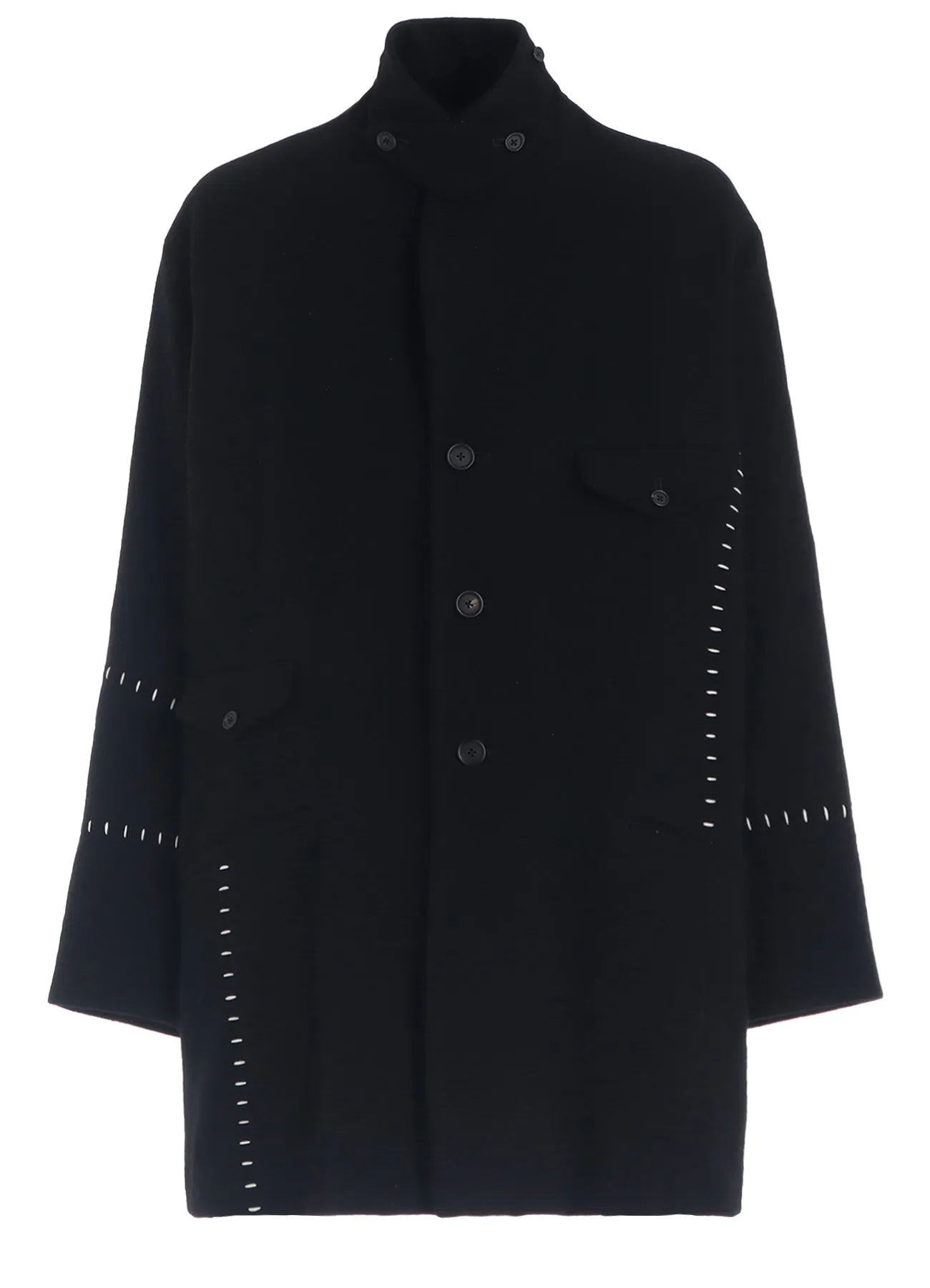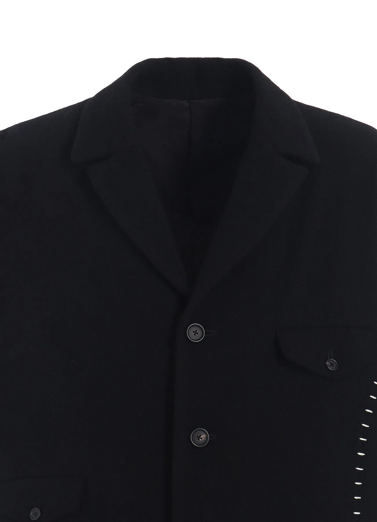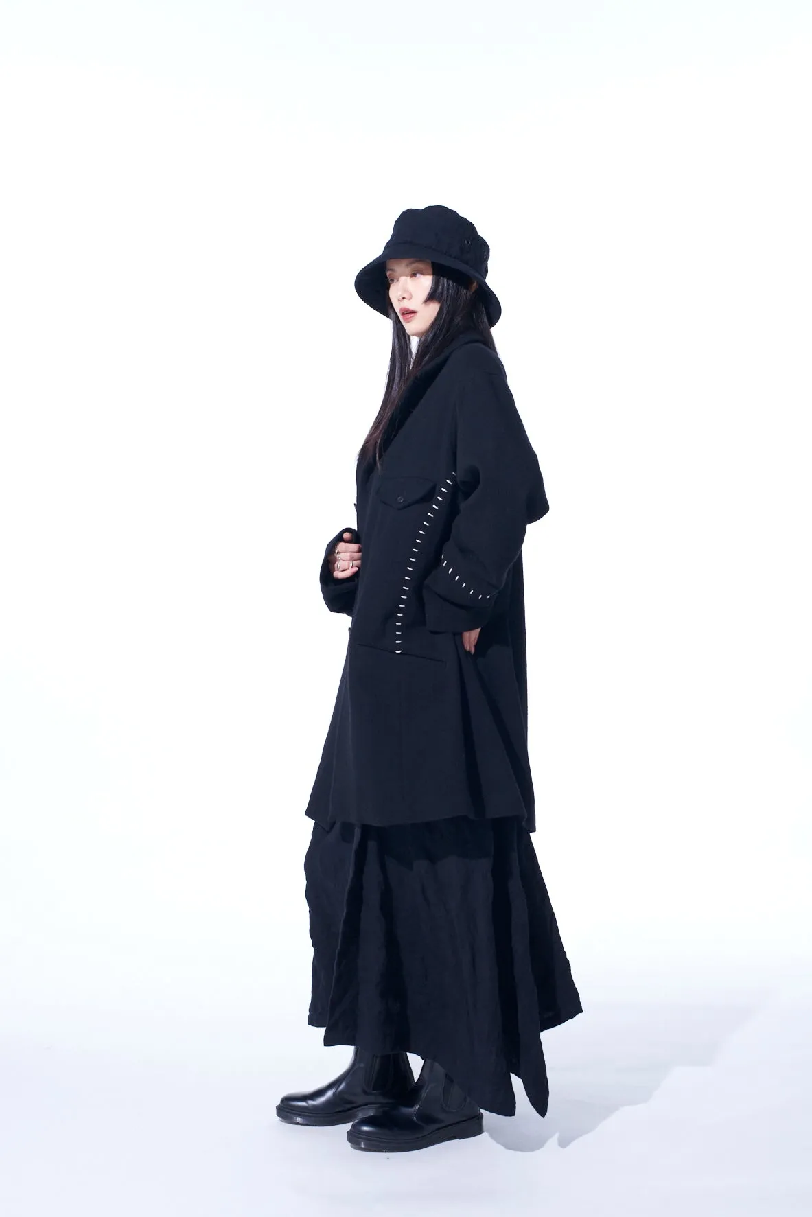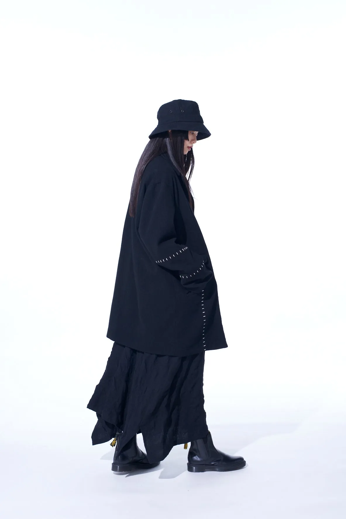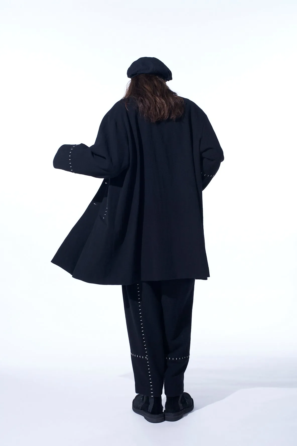 An oversized long jacket crafted from wool flannel offers excellent insulation, lightness, and softness. Highlights include white topstitching on a black body and playful asymmetrical flapped pockets. With a relaxed drop shoulder style, it pairs well with wide pants for a balanced look or slim pants for contrast.