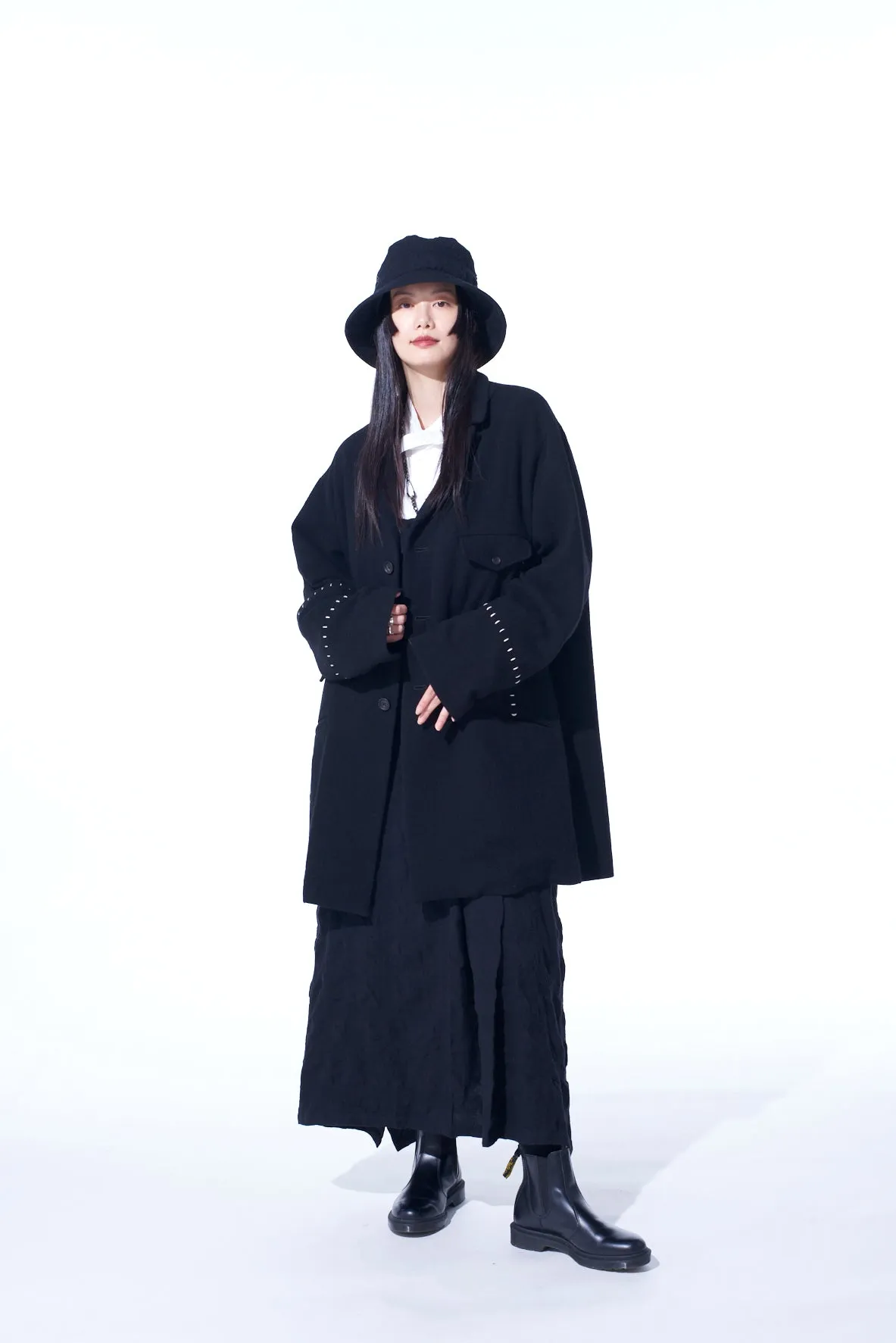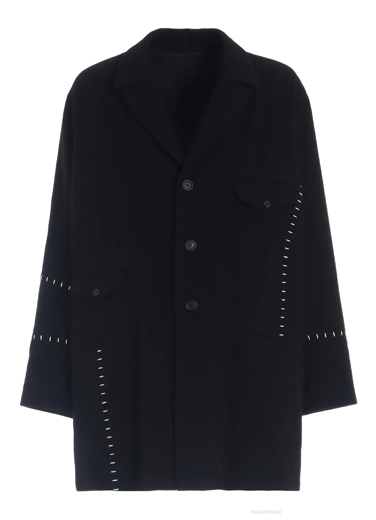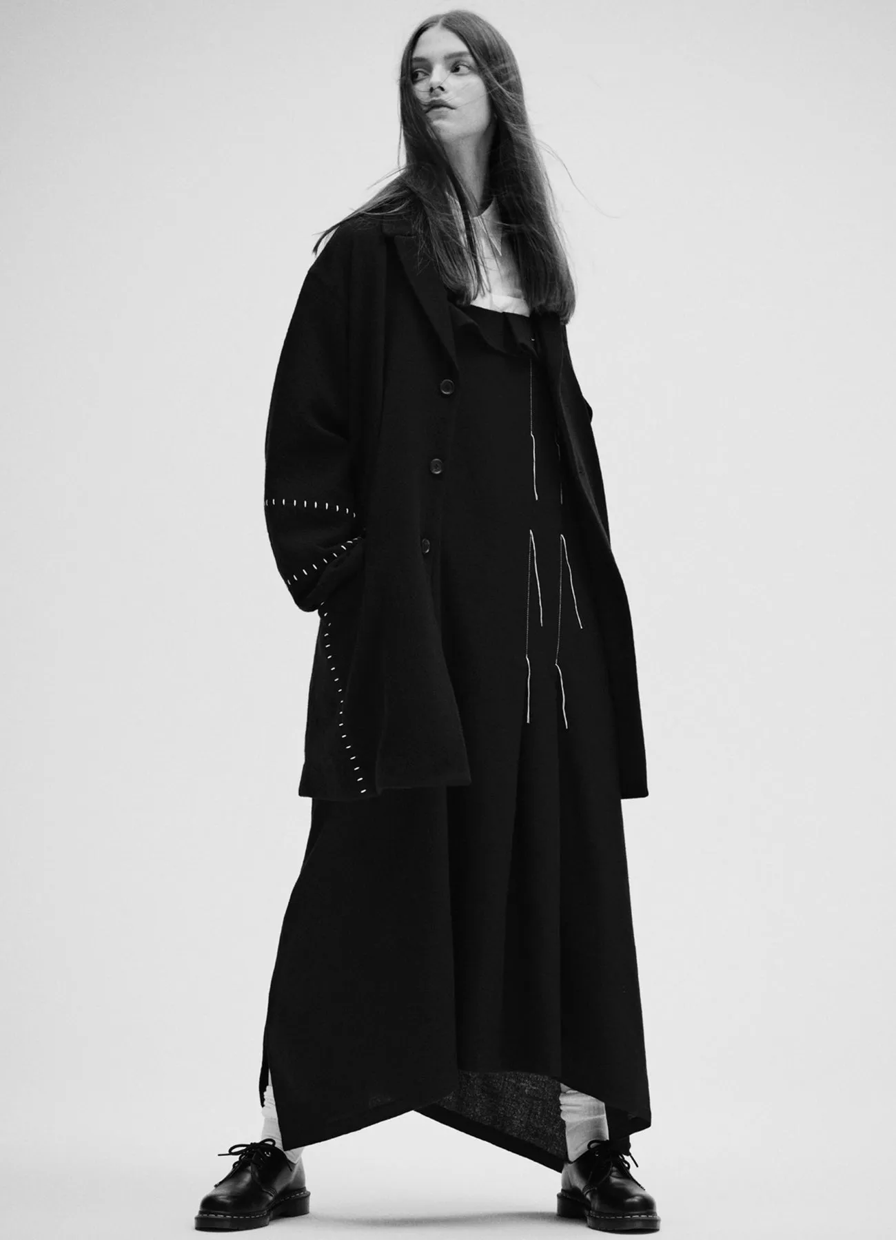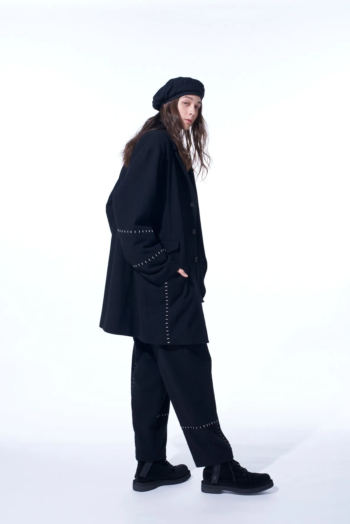 An oversized long jacket crafted from wool flannel offers excellent insulation, lightness, and softness. Highlights include white topstitching on a black body and playful asymmetrical flapped pockets. With a relaxed drop shoulder style, it pairs well with wide pants for a balanced look or slim pants for contrast.