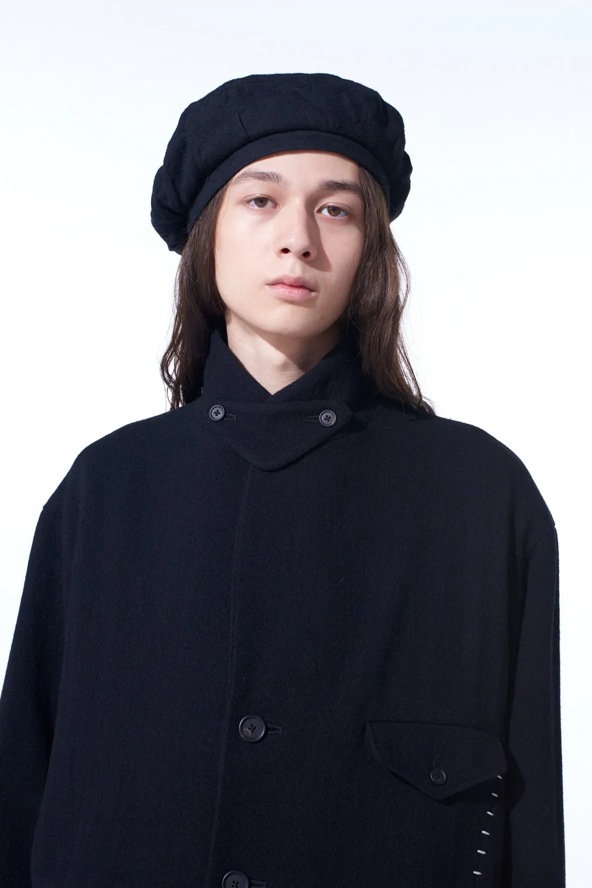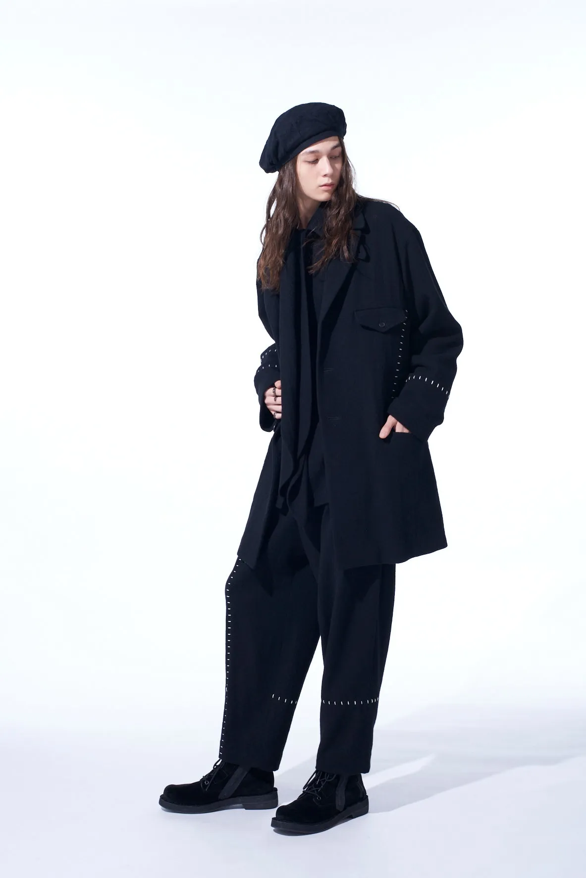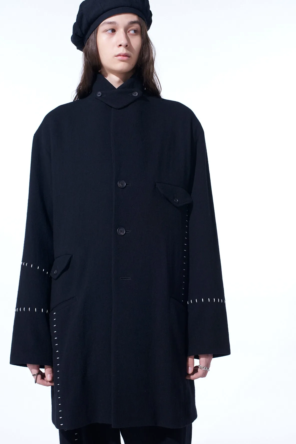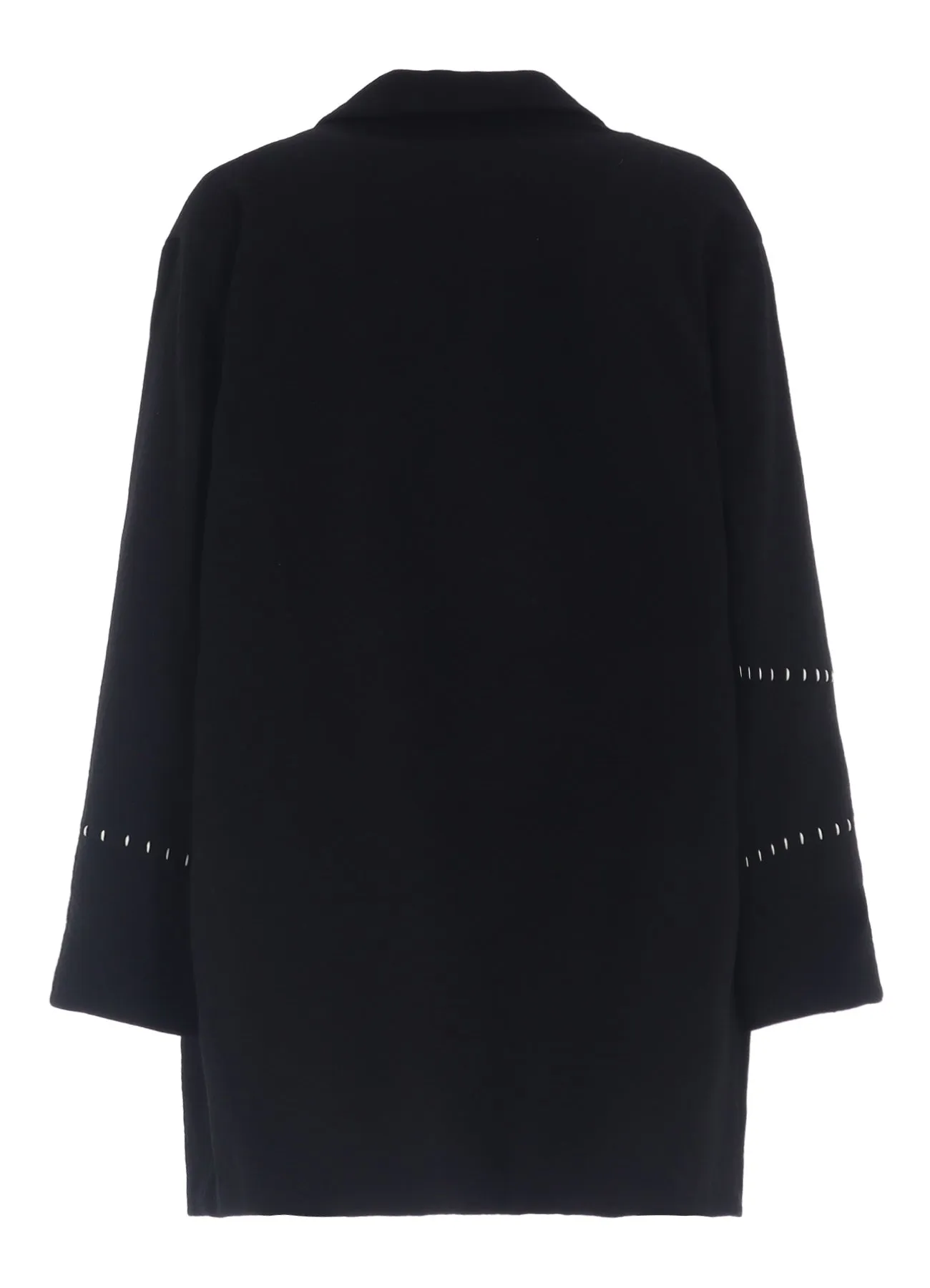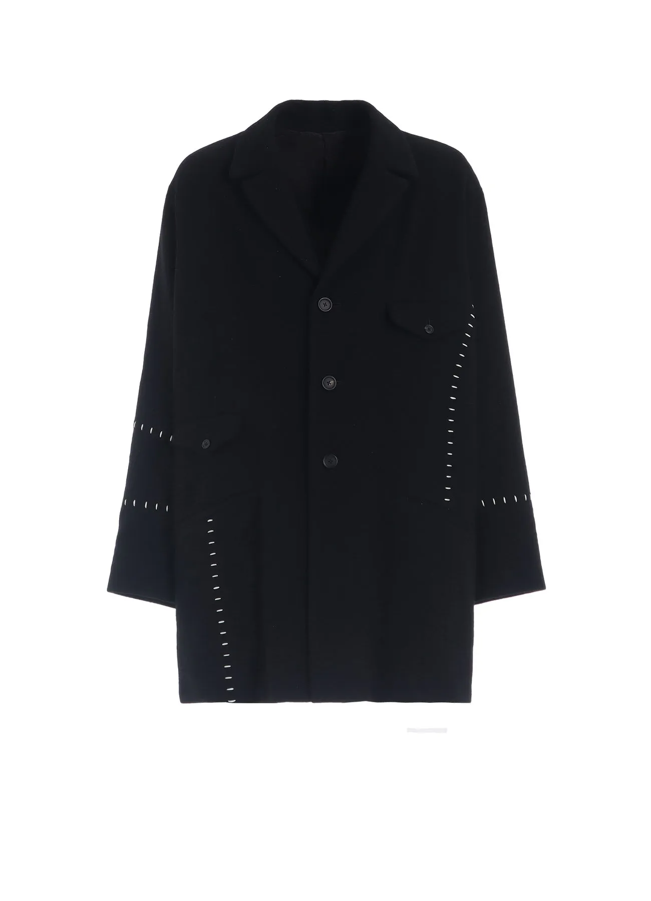 An oversized long jacket crafted from wool flannel offers excellent insulation, lightness, and softness. Highlights include white topstitching on a black body and playful asymmetrical flapped pockets. With a relaxed drop shoulder style, it pairs well with wide pants for a balanced look or slim pants for contrast.