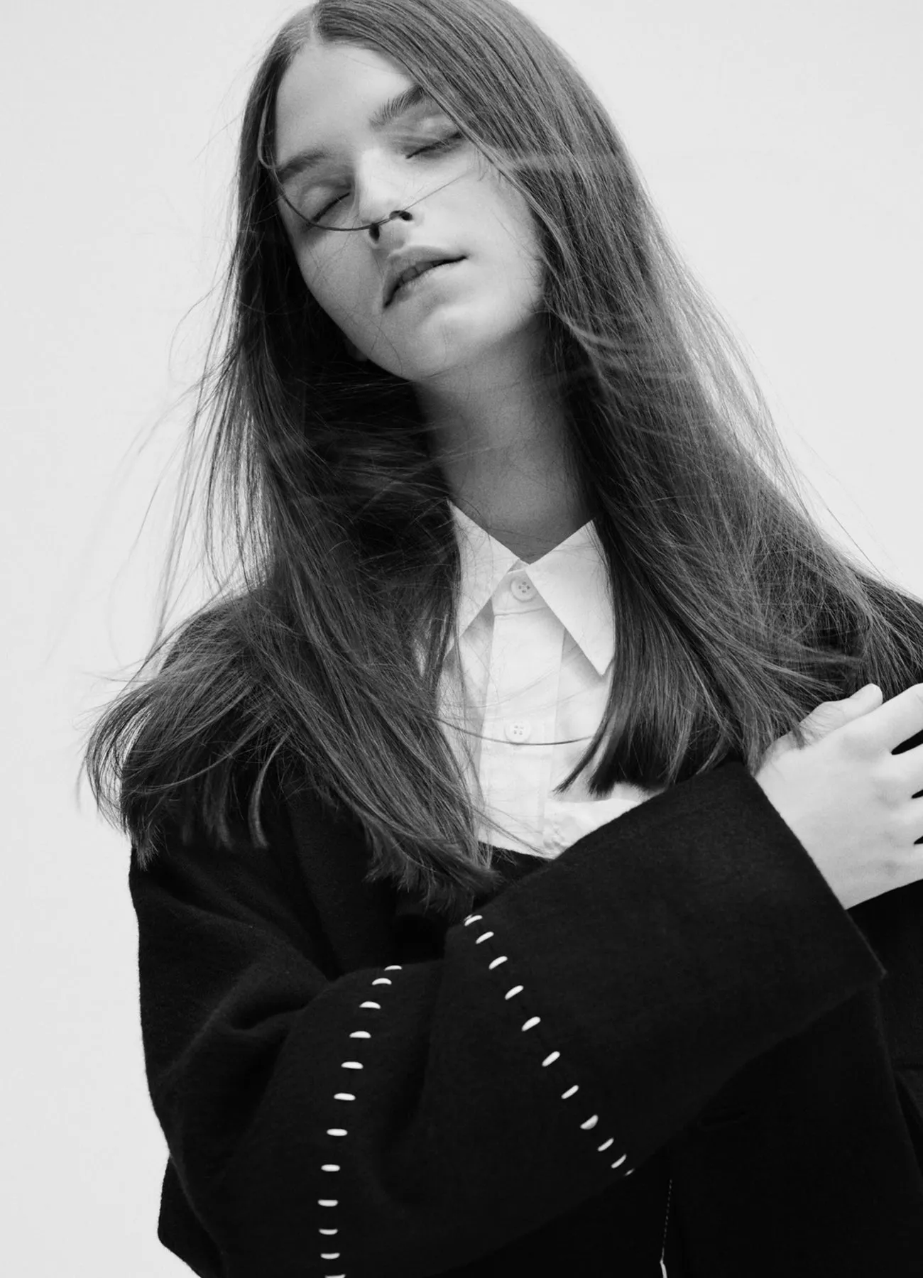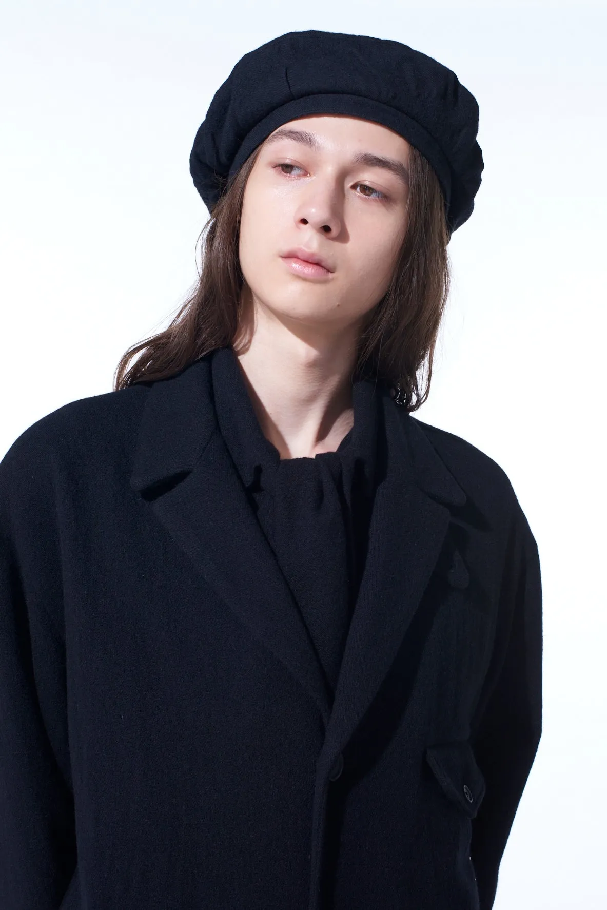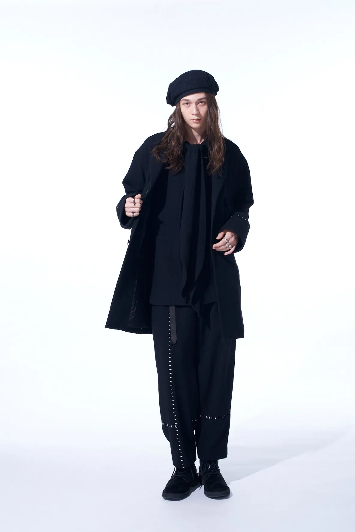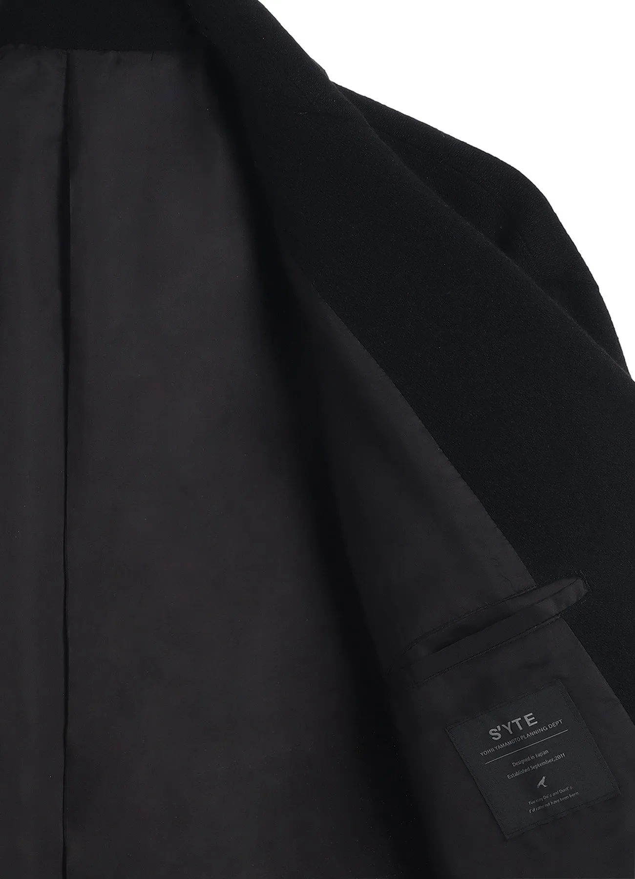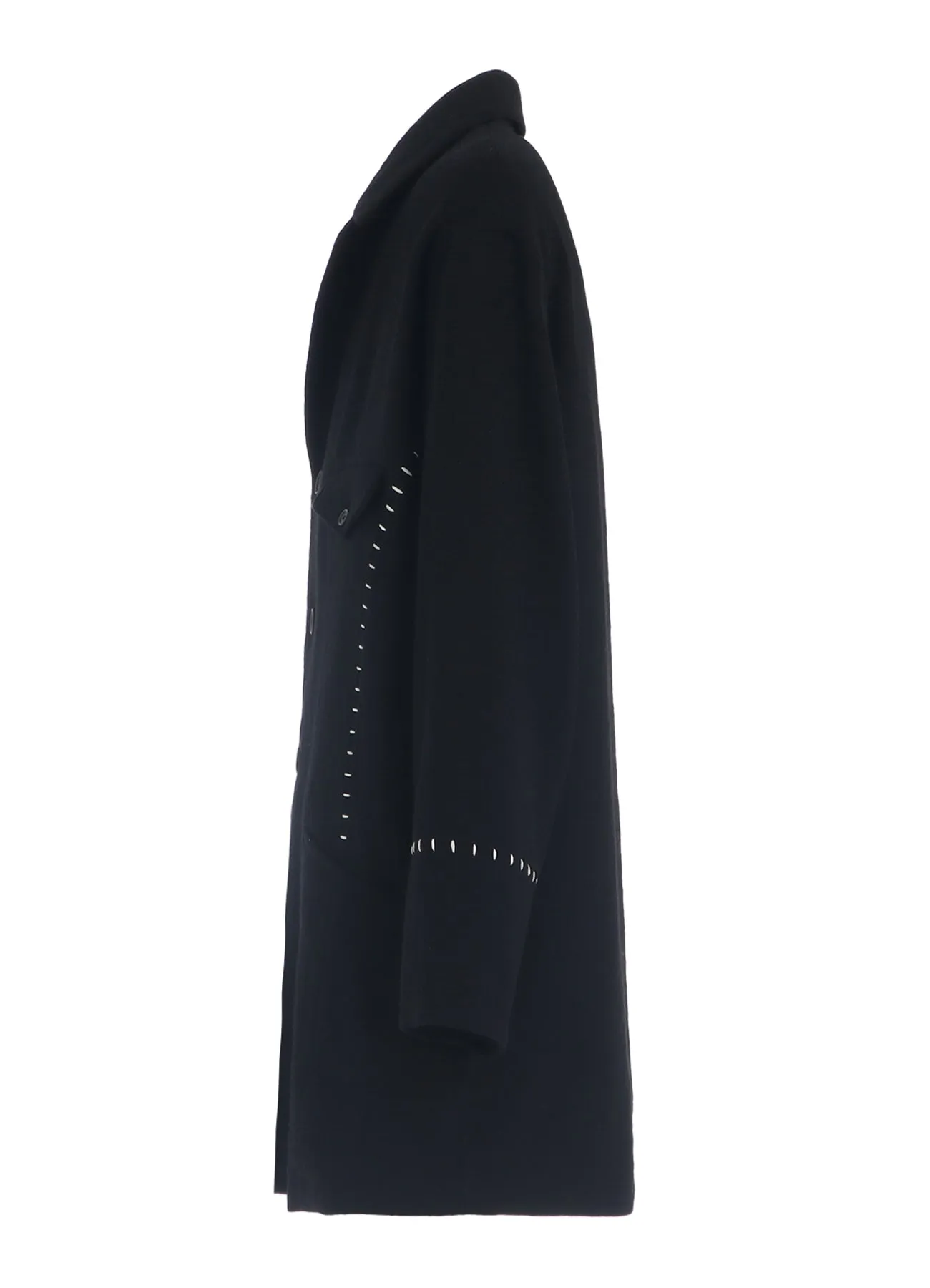 An oversized long jacket crafted from wool flannel offers excellent insulation, lightness, and softness. Highlights include white topstitching on a black body and playful asymmetrical flapped pockets. With a relaxed drop shoulder style, it pairs well with wide pants for a balanced look or slim pants for contrast.
